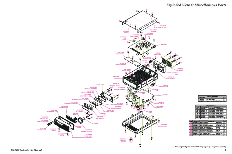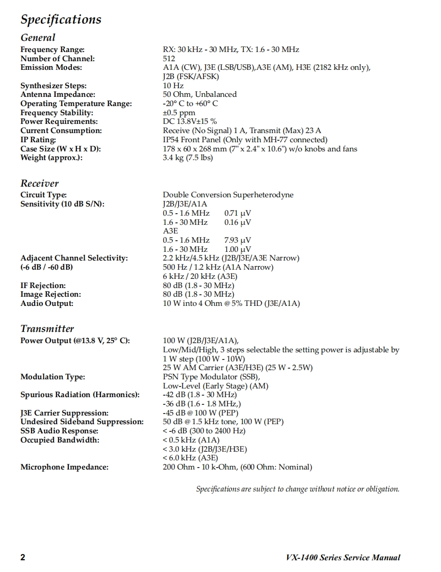 Vertex StandardVERTEX STANDARD CO.,LTD.4-8-8 Nakameguro,Meguro-Ku,Tokyo 153-8644,JapanVERTEX STANDARDVX-1400 SeriesUS Headquarters10900 Walker Street,Cypress,CA 90630,U.S.A.YAESU UK LTD.Unit 12,Sun Valley Business Park,Winnall CloseHF Multi Mode Mobile RadioWinchester,Hampshire,SO23 OLB,U.K.VERTEX STANDARD HK LTD.Service ManualUnit 5,20/F.,Seaview Centre,139-141 Hoi Bun Road,Kwun Tong,Kowloon,Hong KongVERTEX STANDARD(AUSTRALIA)PTY.,LTD.rmanbyess Park,Unit 14/45 Normanby RoadNotting Hill 3168,Victoria,Australia2009 VERTEX STANDARD CO.,LTD.EC091H90AIntroductionThis manual provides the technical information necessary forservicing the VX-1400 HF Transceiver.Servicing this equipment requires expertise in handing sur-face-mount chip components.Attempts by non-qualified per-sons to service this equipment may result in permanent dam-age not covered by the warranty,and may be illegal in somecountries.PmP四POP四PTwo PCBlayout diagrams are provided for each double-sidedboard in this transceiver.Each side of the board is referred toby the type of the majority of components installed on that side("Side A"or "Side B").In most cases one sidehas only chip components(surface-mount devices),and the other has either a mixture of both chip and leadedcomponents(trimmers,coils,electrolytic capacitors,ICs,etc.),or leaded components only.As described in the pages to follow,the advanced microprocessor design of the VX-1400 Transceiver allows acomplete alignment of this transceiver to be performed without opening the case of the radio;all adjustmentscan be performed from the front panel,using the "Alignment Mode"menu.While we believe the information in this manual to be correct,VERTEX STANDARD assumes no liability fordamage that may occur as a result of typographical or other errors that may be present.Your cooperation inpointing out any inconsistencies in the technical information would be appreciated.Important Note1)This transceiver was assembled using Pb(lead)free solder,based on the RoHS specification.Only lead-free solder(Alloy Composition:Sn-3.0Ag-0.5Cu)should be used for repairs performed on this apparatus.Thesolder stated above utilizes the alloy composition required for compliance with the lead-free specification,and any solderwith the above alloy composition may be used.2)Risk of explosion if battery is replaced by an incorrect type.Dispose of used batteries according to the instructions.ContentsSpectications.................................................................2Exploded View Miscellaneous Parts ..................Block Diagram…35Connection Diagram....6Alignment…7Board Units(Schematics,Layouts Parts)PANEL Unit............15MAIN Unit.23PA Unit ...47ALE-2 Unit (Option).59