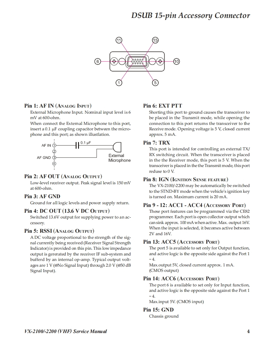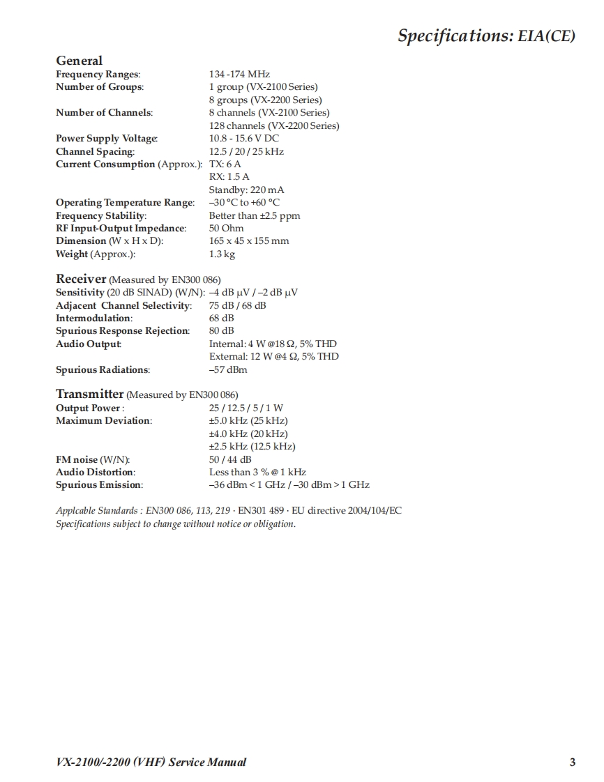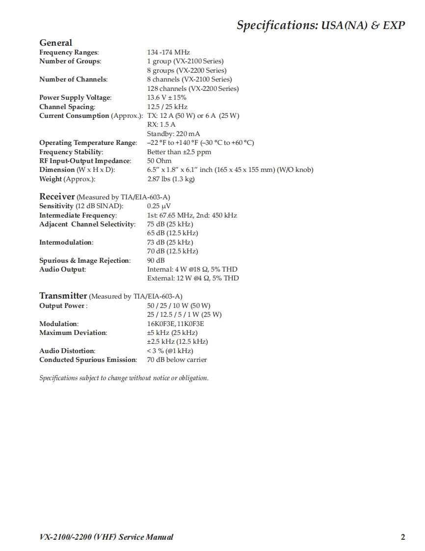 SVertex StandardVHF FM TransceiverVertex Standard LMR,Inc.VX-2100 Series2015 Vertex Standard LMR,Inc.EC061N90MVX-2200 SeriesService ManualAveRTEx-■■VX-2100 SeriesVX-2200 SeriesIntroductionThis manual provides the technical information necessary for servicing the VX-2100/-2200 Series Mobile Transceiver.Servicing this equipment requires expertise in handing surface-mount chip components.Attempts by non-qualifiedpersons to service this equipment may result in permanent damage not covered by the warranty,and may be illegalin some countries.Two PCB layout diagrams are provided for each double-sided board in this transceiver.Each side of the board isreferred to by the type of the majority of components installed on that side("Side A"or "Side B").In most cases oneside has only chip components(surface-mount devices),and the other has either a mixture of both chip and leadedcomponents(trimmers,coils,electrolytic capacitors,ICs,etc.),or leaded components only.As described in the pages to follow,the advanced microprocessor design of the VX-2100/-2200 allows a completealignment of this transceiver to be performed without opening the case of the radio;all adjustments can be performedfrom the personal computer,using with the Vertex Standard FIF-12 USB Programming Interface and CE82 Software.While we believe the information in this manual to be correct,Vertex Standard assumes no liability for damage thatmay occur as a result of typographical or other errors that may be present.Your cooperation in pointing out anyinconsistencies in the technical information would be appreciated.Important NoteThis transceiver is assembled using Pb(lead)free solder,based on the RoHS specification.Only lead-free solder(Alloy Composition:Sn-3.0Ag-0.5Cu)should be used for repairs performed on this ap-paratus.The solder stated above utilizes the alloy composition required for compliance with the lead-freespecification,and any solder with the above alloy composition may be used.ContentsSpecifications2Board Units(Schematics Parts Layout)DSUB 15-pin Accessory Connector...4MAIN Unit..1Exploded View Miscellaneous Parts ................5MAIN-2 Unit (50 W:Lot.33-96).....................35Parts List........FRONT-A Unit (VX-2100)..38Block Diagram........FRONT-B Unit (VX-2200)..40Circuit Description....8Optional Units(Schematics Parts Layout)Alignment...10FVP-25 Encryption/DTMF Pager Unit.........42Installation of Option ....16FVP-36 Voice Inversion Type Encryption Unit ...43