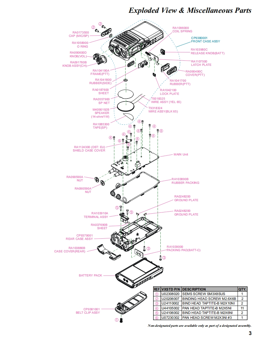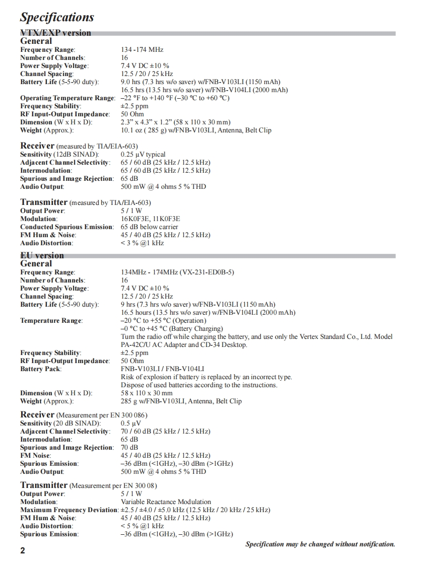 SVertex StandardVERTEX STANDARD CO.,LTD.4-8-8 Nakameguro,Meguro-Ku,Tokyo 153-8644,JapanVERTEX STANDARDVHF FM Transceiver00Wteet CypressCA903.U.SAIS HYAESU UK LTD.VX-230 Seriesgaae668aucooVERTEX STANDARD HK LTD.Unit 5,20/F.,Seaview Centre,139-141 Hoi Bun Road,Service ManualKwun Tong,Kowloon,Hong KongVERTEX STANDARD (AUSTRALIA)PTY.,LTD.Normanby Business Park,Unit 14/45 Normanby Road@2010 VERTEX STANDARD CO.,LTD.EC085N90DNotting Hill 3168,Victoria,AustraliaIntroductionThis manual provides technical information necessary for servicing the VX-230 FM Transceiver.Servicing this equipment requires expertise in handling surface-mount chip components.Attempts by non-qualified persons to ser-vice this equipment may result in permanent damage not covered by the warranty,and may be illegal in some countries.Two PCB layout diagrams are provided for each double-sided circuit board in the transceiver.Each side of is referred to by the typeof the majority of components installed on that side("leaded"or"chip-only").In most cases one side has only chip components,andthe other has either a mixture of both chip and leaded components (trimmers,coils,electrolytic capacitors,ICs,etc.),or leadedcomponents only.While we believe the technical information in this manual to be correct,VERTEX STANDARD assumes no liability for damage thatmay occur as a result of typographical or other errors that may be present.Your cooperation in pointing out any inconsistencies in thetechnical information would be appreciated.Important NoteThis transceiver was assembled using Pb(lead)free solder,based on the RoHS specification.Only lead-free solder(Alloy Composition:Sn-3.0Ag-0.5Cu)should be used for repairs performed on this apparatus.Thesolder stated above utilizes the alloy composition required for compliance with the lead-free specification,and any solder withthe above alloy composition may be used.ContentsSpecifications2MAIN Unit (Lot.14)..17Exploded View Miscellaneous Parts .............3MAIN Unit (L0t.5~7)…21BlockMAIN Unit (L0t.8)…25Circuit Description….7MAIN Unit Parts List........29Alignment .......9
