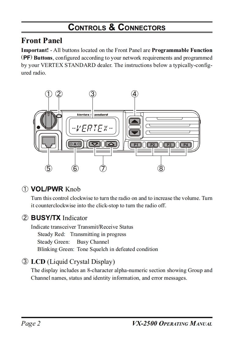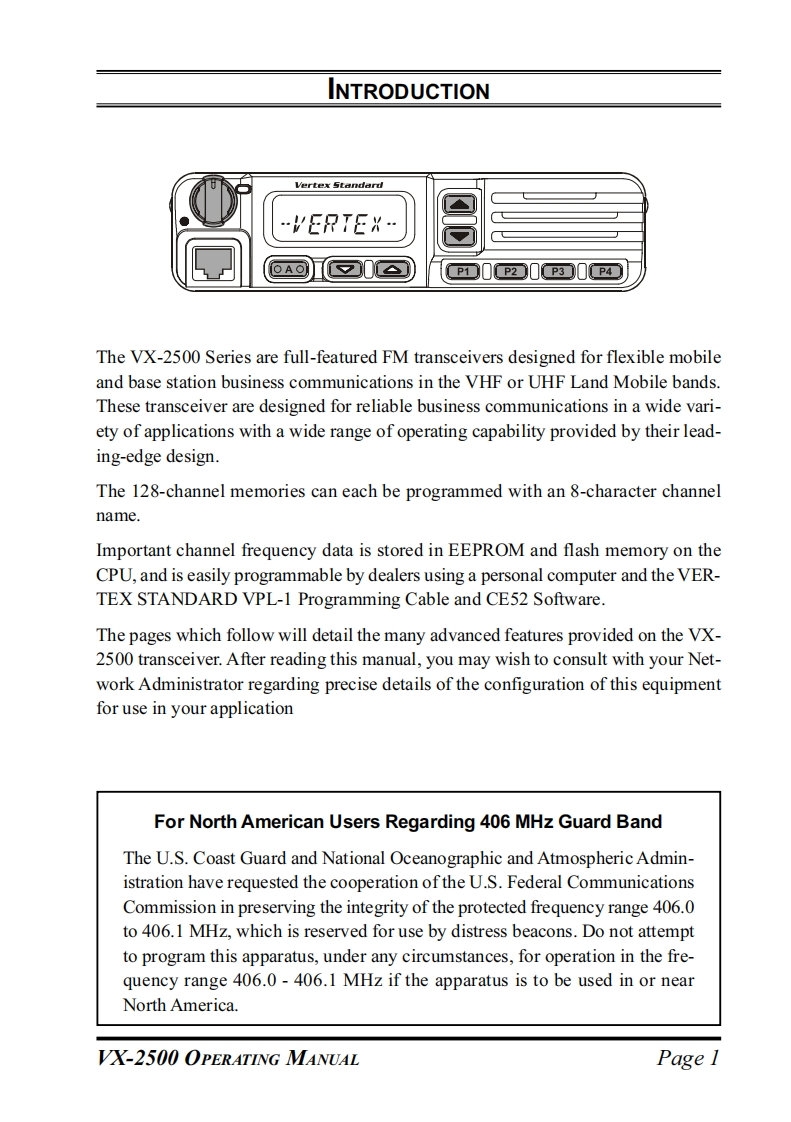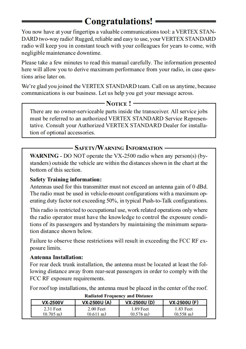 Vertex StandardVX-2500OPERATING MANUALVertex Standard…'ERTEX…OA回I立O△VERTEX STANDARD CO.,LTD.4-8-8 Nakameguro,Meguro-Ku,Tokyo 153-8644,JapanVERTEX STANDARDUS Headquarters10900 Walker Street,Cypress,CA 90630,U.S.A.YAESU EUROPE B.V.P.O.Box 75525,1118 ZN Schiphol,The NetherlandsYAESU UK LTD.Unit 12,Sun Valley Business Park,Winnall CloseWinchester,Hampshire,SO23 0LB,U.K.VERTEX STANDARD HK LTD.Unit 5,20/F.,Seaview Centre,139-141 Hoi Bun Road,Kwun Tong,Kowloon,Hong Kong