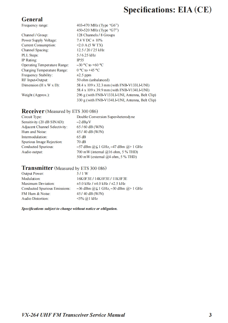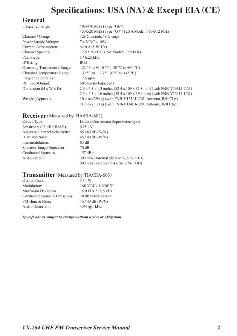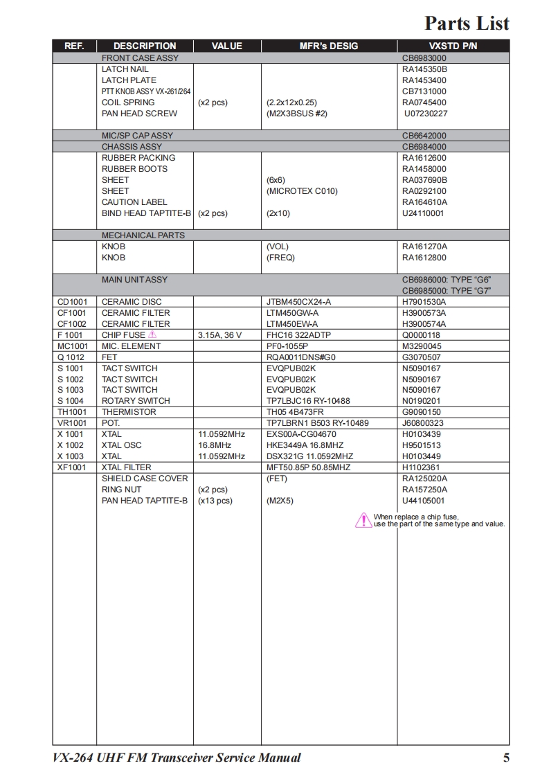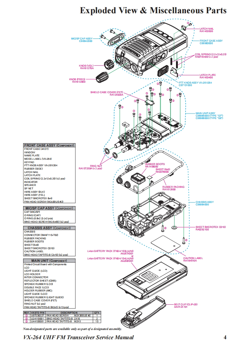 S Vertex StandardVertex Standard LMR,Inc.UHF FM Transceiver2016 Vertex Standard LMR,Inc.VX-264EC127U90EService ManualIntroductionThis manual provides the technical information necessary for servicing the VX-264 UHF FMTransceiver.Servicing this equipment requires expertise in handing surface-mount chip components.At-tempts by non-qualified persons to service this equipment may result in permanent damage notcovered by the warranty,and may be illegal in some countries.Two PCB layout diagrams are provided for each double-sided board in this transceiver.Each sideof the board is referred to by the type of the majority of components installed on that side("SideA"or"Side B").In most cases one side has only chip components (surface-mount devices),andthe other has either a mixture of both chip and leaded components(trimmers,coils,electrolyticcapacitors,ICs,etc.)or leaded components only.As described in the pages to follow,the advanced microprocessor design of the VX-264 Trans-x284】ceiver allows a complete alignment of this transceiver to be performed without opening the caseofthe radio,all adjustments can be performed from the front panel,using the"Alignment Mode"menu.While we believe the information in this manual to be correct,Vertex Standard assumes no li-ABDability for damage that may occur as a result oftypographical or other errors that may be present.Your cooperation in pointing out any inconsistencies in the technical information would be ap-preciated.Important NoteThis transceiver is assembled using Pb(lead)free solder,based on the RoHS specification.Only lead-free solder(Alloy Composition:Sn-3.0Ag-0.5Cu)should be used for repairs performed on this apparatus.The solder stated above utilizes the alloy composition required for compliance with the lead-free specification,andany solder with the above alloy composition may be usedContentsSpecifications...Exploded View Miscellaneous Parts...4Parts List.5Block Diagram.....Circuit DescriptionAlignment12Cloning.....19Main Unit Circuit Diagram:Type "G6".20Main Unit Circuit Diagram:Type“G7”21