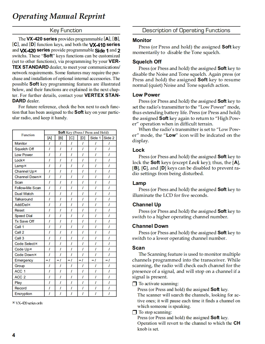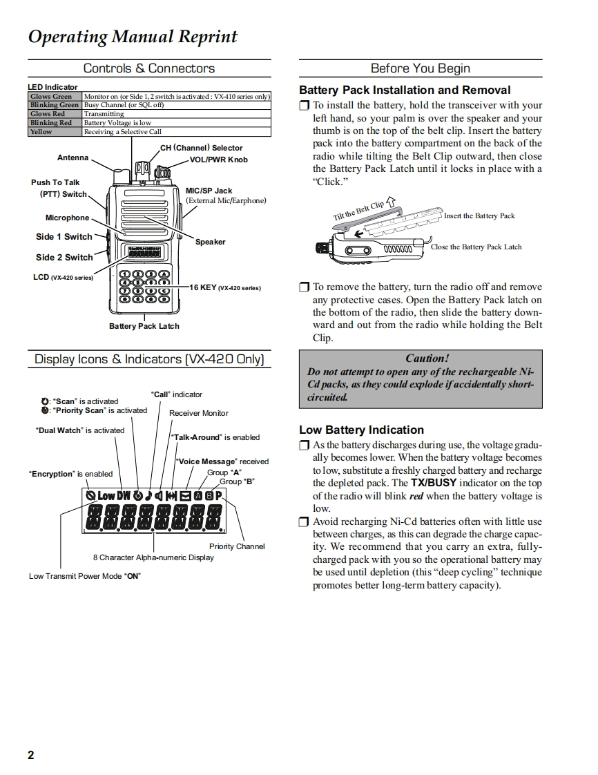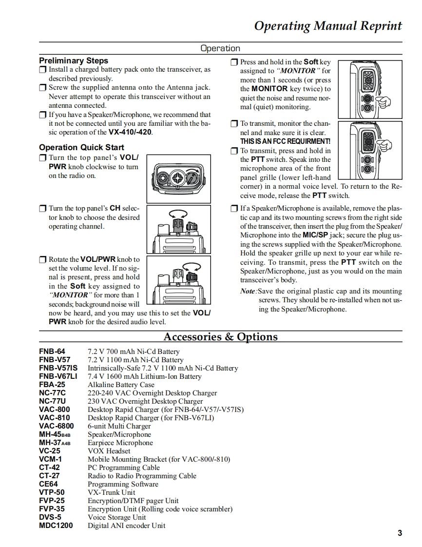 S Vertex StandardVERTEX STANDARD CO.,LTD.4-8-8 Nakameguro,Meguro-Ku,Tokyo 153-8644,JapanVERTEX STANDARDVHF FM TransceiverUS Headquarters10900 Walker Street,Cypress,CA 90630,U.S.A.VX-410/-420 seriesYAESU EUROPE B.V.P.O.Box 75525,1118 ZN Schiphol,The NetherlandsYAESU UK LTD.Service ManualUnit 12,Sun Valley Business Park,Winnall CloseWinchester,Hampshire,SO23 OLB.U.K.VERTEX STANDARD HK LTD.2004 VERTEX STANDARD CO.,LTD.ECO50N90AUnit 5,20/F.,Seaview Centre,139-141 Hoi Bun Road,Kwun Tong,Kowloon,Hong Kong置1)23)A456)B789c*)0#)《DVX-410 seriesVX-420 seriesIntroductionThis manual provides technical information necessary for servicing the VX-410/-420 series FM Transceiver.Servicing this equipment requires expertise in handling surface-mount chip components.Attempts by non-qualifiedpersons to service this equipment may result in permanent damage not covered by the warranty,and may be illegal insome countries.Two PCB layout diagrams are provided for each double-sided circuit board in the transceiver.Each side ofis referredto by the type of the majority of components installed on that side ("leaded"or"chip-only").In most cases one side hasonly chip components,and the other has either a mixture of both chip and leaded components(trimmers,coils,electrolyticcapacitors,ICs,etc.),or leaded components only.While we believe the technical information in this manual to be correct,VERTEX STANDARD assumes no liabilityfor damage that may occur as a result of typographical or other errors that may be present.Your cooperation in pointingout any inconsistencies in the technical information would be appreciated.ContentsOperating Manual Reprint.......2Board Unit (Schematics,Layouts Parts)MAIN Unit…19Specifications........8DUMMY Unit..34Exploded View Miscellaneous Parts .............9Optional Units (Schematics,Layouts Parts)Block Diagram11FVP-25 Encryption/DTMF Pager Unit ....35Circuit Description3VTP-50 VX-Trunk Unit.37DVS-5 Voice Storage Unit..39Alignment….15