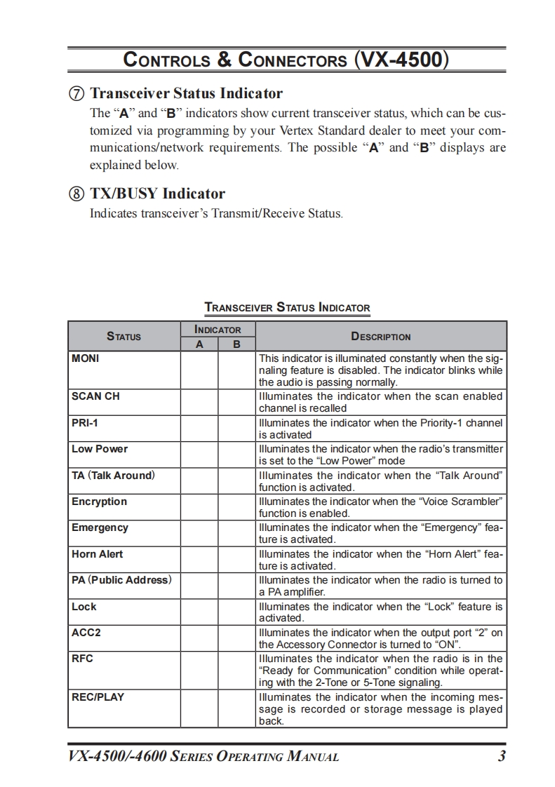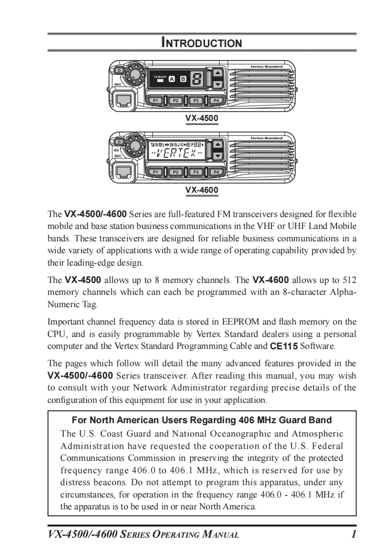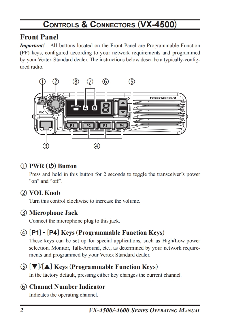 SVertex StandardVX-4500VX-4600OPERATING MANUAL80LgM9,0H日P884A B…VERTEX…PmP20PP1p2 pa pVX-4500VX-4600PROGRAMMABLE FUNCTIONS/FEATURES (VX-4600 ONLY)Six Programmable Function Keys 2-tone Encode/Decode5-tone Encode/DecodeMDC-1200 Encode/DecodeARTS (Auto Range Transpond System)REC PLAY (Requires DVS-8)Dimmer/LampClear VoiceHom AlertAF Min VolumePublic AddressTalk AroundLockEmergencyBeep OFFLone WorkerEncryptionDirect Channel Entry*ScanCode Up/DownGroup ScanCode SetDual WatchSpeed Dial*FM-Scan (Follow-Me Scan)DTMF Code SetTA ScanID CheckVOXTX Save Disable