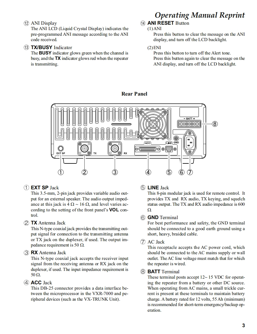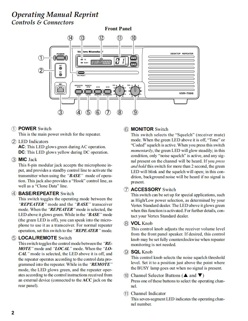 Vertex StandardVERTEX STANDARD CO..LTD.4-8-8 Nakameguo,Meguro-Ku,Tokyo 153-8644,JapanDesktop RepeaterVERTEX STANDARDUS Headquarters10900 Walker Street,Cypress,CA 90630,U.SA.VXR-7000 (UHF)YAESU EUROPE B.V.P.O.Box 75525,1118 ZN Schiphol,The NetherlandsYAESU UK LTD.Service ManualUnit 12,Sun Valley Business Park,Winnall CloseWinchester,Hampshire,SO23 0LB,U.K.VERTEX STANDARD HK LTD.2006 VERTEX STANDARD CO.,LTD.Unit 5,20/F.,Seaview Centre,139-141 Hoi Bun Road(E136890B)Kwun'Tong.Kowloon,Hong KongVertex StandardPOWERDESKTOP REPEATER006VXR-7000IntroductionThis manual provides technical information necessary for servicing the VXR-7000 FM Land Mobile Repeater.Servicing this equipment requires expertise in handling surface-mount chip components.Attempts by non-qualifiedpersons to service this equipment may result in permanent damage not covered by the warranty,and may be illegal insome countries.Two PCB layout diagrams are provided for each double-sided circuit board in the repeater.Each side of is referred toby the type of the majority of components installed on that side ("leaded"or"chip-only").In most cases one side has onlychip components,and the other has either a mixture of both chip and leaded components(trimmers,coils,electrolyticcapacitors,ICs,etc.),or leaded components only.While we believe the technical information in this manual to be correct,VERTEX STANDARD assumes no liabilityfor damage that may occur as a result of typographical or other errors that may be present.Your cooperation in pointingout any inconsistencies in the technical information would be appreciated.ContentsOperating Manual Reprint.........................2TXUnit Lot1-59).49TX-2Unit(L0t.60-).57CE27 Programming Software Instruction......m10RX Unit((L0t.1-59)65Specifications.........…16RX-2Unit(L0t.60-).75Exploded View Miscellaneous Parts....17CNTL Unit...........85Block Diagram….21Display Unit103Key Unit.107Interconnection Diagram.24Filter Unit (50W Type)....113Circuit Description25Filter-2 Unit (25W Type)119SWUnit (25W Type).125Board Unit (Schematics,Layouts Parts)SQL Unit...PA Unit(L0t.1-17,18,19-61)..33128PS Unit.....129PA-2 Unit (Lot.62-).............41