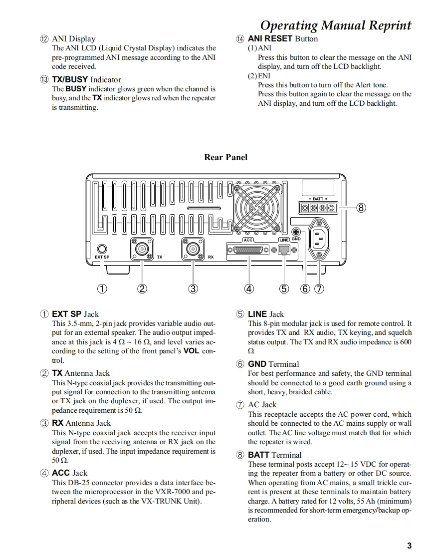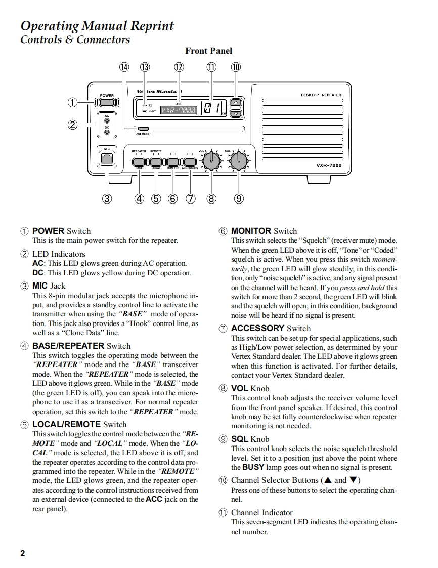 VERTEX STANDARD CO.,LTD.Vertex Standard4-8-8 Nakameguro,Meguro-Ku,Tokyo 153-8644,JapanVERTEX STANDARDUS HeadquartersDesktop Repeater10900 Walker Street,Cypress,CA 90630,U.S.A.YAESU EUROPE B.V.VXR-7000 (VHE)P.O.Box 75525,1118 ZN Schiphol,The NetherlandsYAESU UK LTD.Service ManualWimche NampCloseVERTEX STANDARD HK LTD.2003 VERTEX STANDARD CO.,LTD.E136790AUnit 5,20/F.Seaview Centre,139-141 Hoi Bun Road,Kwun Tong,Kowloon,Hong KongVertex StandardDESKTOP REPEATER00川6VXR-7000IntroductionThis manual provides technical information necessary for servicing the VXR-7000 FM Land Mobile Repeater.Servicing this equipment requires expertise in handling surface-mount chip components.Attempts by non-qualifiedpersons to service this equipment may result in permanent damage not covered by the warranty,and may be illegal insome countries.Two PCB layout diagrams are provided for each double-sided circuit board in the repeater.Each side of is referred toby the type of the majority of components installed on that side("leaded"or"chip-only").In most cases one side has onlychip components,and the other has either a mixture of both chip and leaded components(trimmers,coils,electrolyticcapacitors,ICs,etc.),or leaded components only.While we believe the technical information in this manual to be correct,VERTEX STANDARD assumes no liabilityfor damage that may occur as a result of typographical or other errors that may be present.Your cooperation in pointingout any inconsistencies in the technical information would be appreciated.ContentsOperating Manual Reprint....Board Unit (Schematics,Layouts Parts)CE27Programming Software Instruction..9PAUnit27Specifications ...........14RX Unit3Exploded View Miscellaneous Parts....15CNTL Unit......55Block Diagram……17LP℉Unit73Interconnection Diagram..........20Display Unit..........75Key UnitCircuit Description2179Filter Unit.87Alignment........23VR Unit.........95PS Unit......