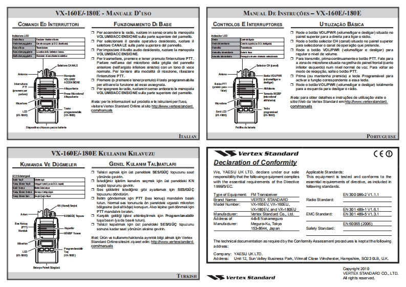 VX-160E/-180E OPERATING MANUALMANUEL D'UTILISATION VX-160E/-180ECONTROL SWITCHESBAISIC OPERATIONCOMMANDES ET INTERRUPTEURSUTILISATION DE BASETurn te top panef's VOL/PWR krob clockwise to tum on thendio.etL四Volume dans le sers horaire pour allumer votre radiaTurn the top panel's CH selector knob to dhoose the desired袖teooeaghdeSur la tace supereure,tournez le selecteu de cansu(CH)operaning channelpour choisir le canal regus.Rotate the VOU/PWR knob to set the desired audio levelReglez le rivesuaudioen toumantle baon MahelAmtTo transmit press and hold in the PTT switch.Speak into早,型Volume.the miaophone ar of the thont panel grlle (lowerlethandcomer)in a normal volce leveL To reoum to the Receivemode,release the PTT swtch.andnommale dans le microphone (situe derere la grlle dans lecoin inerieur gaudhe du parnesu avant).Pour revenir enPress (or press and hold in)the Programmable key tomode de reoepion,lb寸ez【AlernatCLP晴RKebactivate the function which is comrespanding wth that key--outon lar中afAppuyez ur ou mimtenez)le boutan programmable pourTurn the top panefs VOU/PWR kndb fuly counter clockwseAmdt-Volumeaciver foncion ambude a ce bouton.Puah To Takto tum off the radio.Sur la faoe supereure,toumez a tondTt达A海MarholAmt-Volume dans le sens and-horaire pourdNote:For product detail and istrucions for use go to Verte支目OCPeindre votre radio.Standard Orline at/www.vertestandard com/manuakdes instrucions d'udlisanon,allez sur le site Vertex Standard■■Onine:hp/www.venexstandard.com/manuals自t写xhL中hENGLISHFRENCHMANUAL DE INSTRUCCIONES DE VX-160E/-180EVX-160E/-180E BEDIENUNGSANLEITUNGCONTROL E INTERRUPTORESFUNCIONAMIENTO BASICOBEDIENELEMENTEKURZANLEITUNGGre el mndo de VOLUMEN/ENCEN DIDO-APAGADO▣um Einschaten s Funkgersts drchen Se den日N/AUSshusdo en el panel superor en el senddo de las aguas delLautstarkeg lor oben am Gerat im Uhrzdgersin.604红】relo para encender el transcegtor.Gre el mando de SELECCION DE CANAL stusdo en eldes Kanalwahlschaltors oben am Gerdt cin.panel superior para selecdona el canal de tundommientoSelen Sedie gewnschte Laustirke for de Tonasgabe duchdeseado.crt年echande Drehen企S EN/AU5 stiricgies ein.Greel mndo de VOLUMEN/ENCENDIDO-APA GADO poraZum Senden drocken Sle de Sendotaste und halten sleestablecer elnivel de audio deseado.gedrockt.Sprechen Sie mit normler Lautstsrke in denalec比nandPara tramsmtir,matenga pulssdo el intemuptor PTT.HableVikrotonbereich des vorderen Gmars (Ecke unten links).Fora la zona del mcroono situsda en la rejll del panel frontalVCLUNENEmptang geben Se de Sendetaste weder fel%a4000esquna nferior laquierda)con un volumen de voz nommal.bDrocken Sie de programmierbare Taste kurz zw.ng).APAGAOOPara vdver al modo de recepcion,suete el inemruptor PTT.L时rum de dieser Taste zugeordnete Funktion zu aktiveren.Puha paraPuse (o martenga pulsada)la teda PROGRAMABLE pora口Drehen9edem日NA US/L autstarkeregler oben2ma出rPTmactivarb funcion que corresponda a dicha teda.Furkg年rb地aum ArcHag entgegen dem UhrzeigersimGre el mndo de VOLUMEN/EN