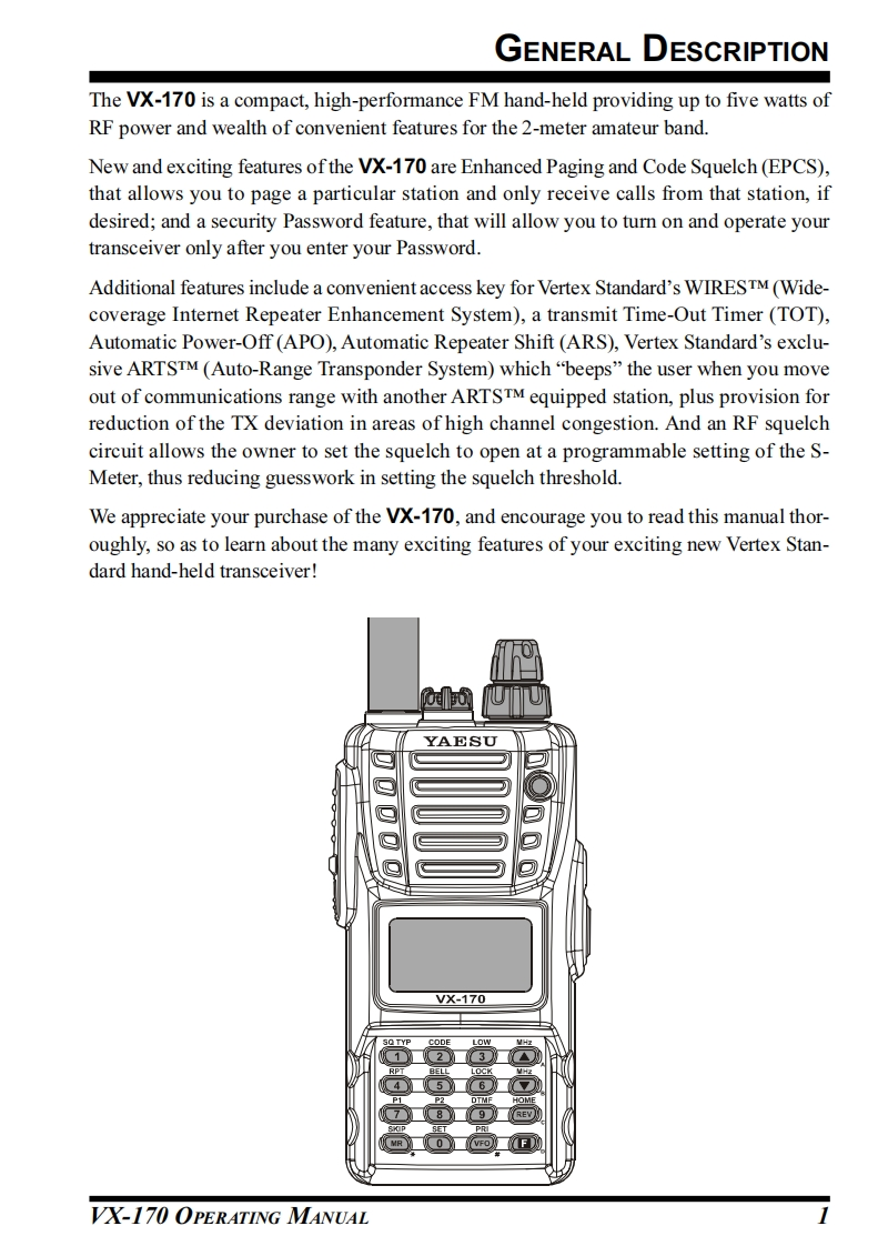 SYAESUVHF FM TRANSCEIVERVX-170OPERATING MANUALYAESUDownloaded byRadioAmateur.EU--VERTEX STANDARD CO.,LTD.55204-8-8 Nakameguro,Meguro-Ku,Tokyo 153-8644,JapanVERTEX STANDARDVX.170US Headquarters10900 Walker Street,Cypress,CA 90630,U.S.A.YAESU EUROPE B.V.P.O.Box 75525,1118 ZN Schiphol,The NetherlandsYAESU UK LTD.Unit 12,Sun Valley Business Park,Winnall CloseWinchester,Hampshire,SO23 0LB,U.K.VERTEX STANDARD HK LTDUnit 5,20/F.,Seaview Centre,139-141 Hoi Bun Road,Kwun Tong,Kowloon,Hong Kong