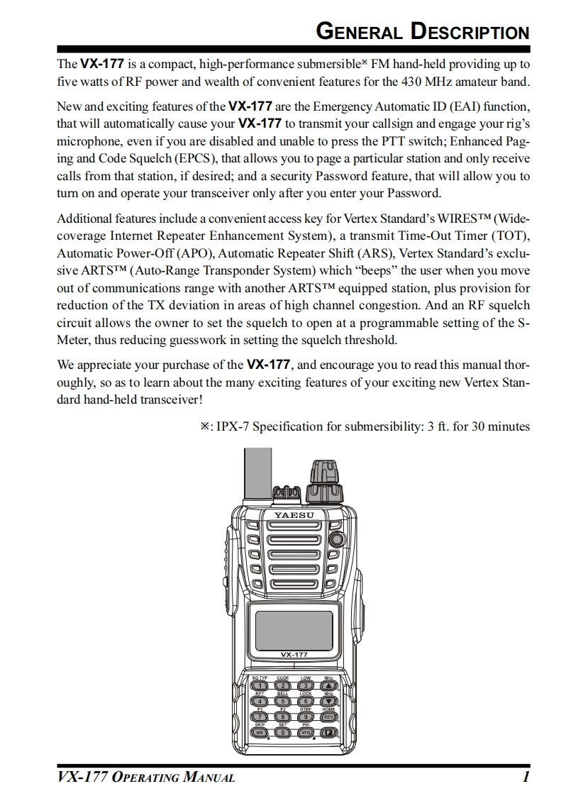 YAESUUHF FM TRANSCEIVERVX-177PERATING MANUALYAESU-8-VERTEX STANDARD CO.,LTD330884-8-8 Nakameguro,Meguro-Ku,Tokyo 153-8644,JapanVERTEX STANDARDVX.177US Headquarters10900 Walker Street,Cypress,CA 90630,U.S.A.YAESU EUROPE B.V.P.O.Box 75525,1118 ZN Schiphol,The NetherlandsYAESU UK LTD.Unit 12,Sun Valley Business Park,Winnall CloseWinchester,Hampshire,SO23 OLB,U.K.VERTEX STANDARD HK LTDUnit 5,20/F.,Seaview Centre,139-141 Hoi Bun Road.Kwun Tong,Kowloon,Hong Kong