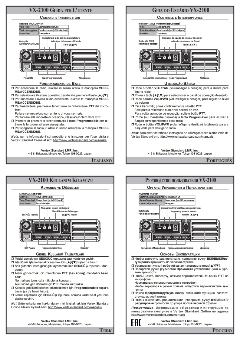 VX-2100 USER GUIDEGUIDE DE I'UTILISATEUR VX-2100CONTROL SWITCHESCOMMANDES ET INTERRUPTEURSTX/BUSY IndicatorGlow Green Signaing OfSigndetion decaciveeBlnk Greon Busy Chamel (ar SLf)btdg1 tant Cnal ooope (ou S的d垫鸣Glow Red TransmttingChannel Number IndicatorIndcaeurdu nu-eo decansVOL/PWR KnobW]倒MIC JackProgram“eKgSpe sker小ck MCROBouion ProgrmmbleHautpadeurBASIC OPERATIONUTILISATION DE BASETum the VOL/PWR knob clockwise to tum on the radio.Tournez le bouton Marche/Arret-Volume dans le sens horaire pourPress the [A]key to choose the desired operating channel.allumer votre radio.Rotate the VOU/PWR knob to set the desired audio level.▣Appuyez sur la touche【▲]M可pour choisir le canal requis.To transmit,press and hold in the microphone's PTT switch.Reglez le niveau audio en toumant le bouton Marche/Arret-Volume.Speak into the microphone in a normal voice level.Pour emettre,appuyez sur le bouton PTT du microphone.To retum to the Receive mode,release the PTT switch.Parlez d'une voix normale dans le microphone.Press (or press and hold in)the Programmable key to activate thePour revenir en mode de reception,relachez le bouton PTT.function that corresponds with that key.Appuyez sur (ou maintenez)le bouton Programmable pour activer laTum the VOL/PWR knob fully counter clockwise to tum off the radio.fonction attribuee a ce touche.Note:For product details and instructions for use go to Vertex StandardTournez a fond le bouton Marche/Arret-Volume dans le sens anti-Online at http://www.vertexstandard.com/manualshoraire pour eteindre votre radio.Remargue:pour obtenir des informations sur ce produit et des instruc-tions d'utilisation,allez sur le site Vertex Standard OnlineVertex Standard is a trademark of Vertex Standard LMR.Inc.bttp://www.vertexstandard.com/manualsAllother trademarks are the property of their respecfive owners.2015 Vertex Standard LMR,Inc.All rights reserved.Vertex Standard LMR,Inc.Vertex Standard LMR.Inc.4-6-8 Shibaura,Minato-ku,Tokyo 108-0023,Japan4-6-8 Shibaura,Minato-ku,Tokyo 108-0023,JapanENGLISHFRANCAISGUiA DE USUARIO DE VX-2100VX-2100 BENUTZERHANDBUCHCONTROL E INTERRUPTORESBEDIENUNGSANLEITUNGIndicador de TRANSMSIONOCUPADOg金Pemane nte hdca que地aP山Manitoreing escha betVerde lintem te nte Canal acpado (o SOLdesactivada)Gron Binkend Kanal bde呼r Rauscpeme(1)ag9hd的Gow Red■Funkger-Statusanzige监8品8e6hdicador del Numero de CansKanal-Nummer-AnzsigeTeca△W7]Conexon de MarofonoTeda PROGRAMABLEav0证MIK BuchseLau点peerFUNCIONAMIENTO BASICOKURZANLEITUNGGire el mando de VOLUMEN/ENCENDIDO-APAGADO en el sentidoZum Einschalten des Funkgerats drehen Sie den EIN/AUS/Lautstar-de las agujas del reloj para encender el transceptor.keregler im Uhrzeigersinn.Pulse la tecla[]para elegir el canal de funcionamiento deseado.Drocken Sie zur Wahl des gewunschten Betriebskanals die Taste [A]Gire el mando de VOLUMEN/ENCENDIDO-APAGADO para estable-IvIcer el nivel de audio deseado.Para transmitir,mantenga pulsado el interruptor PTTdel microono.Stellen Sie die gewunschte Lautstarke f