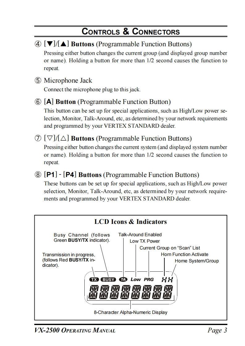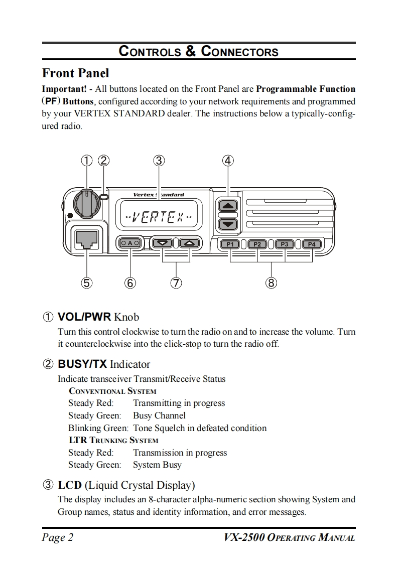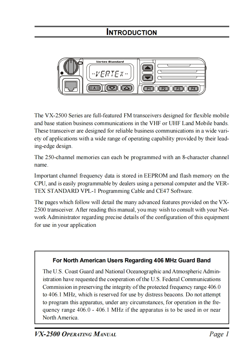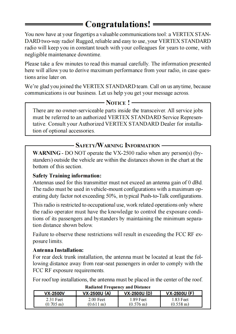 Vertex StandardVX-2500OPERATING MANUALVertex Standard…VERTEX…P10P20P30P4VERTEX STANDARD CO.,LTD.4-8-8 Nakameguro,Meguro-Ku,Tokyo 153-8644,JapanVERTEX STANDARDUS Headquarters17210 Edwards Rd.,Cerritos,CA 90703,U.S.AIntemational Division8350 N.W.52nd Terrace,Suite 201,Miami,FL 33166,U.S.A.YAESU EUROPE B.V.P.O.Box 75525,1118 ZN Schiphol,The NetherlandsYAESU UK LTD.Unit 12,Sun Valley Business Park,Winnall CloseWinchester,Hampshire,SO23 OLB,U.K.VERTEX STANDARD HK LTD.Unit 5,20/F.,Seaview Centre,139-141 Hoi Bun Road,Kwun Tong,Kowloon,Hong Kong