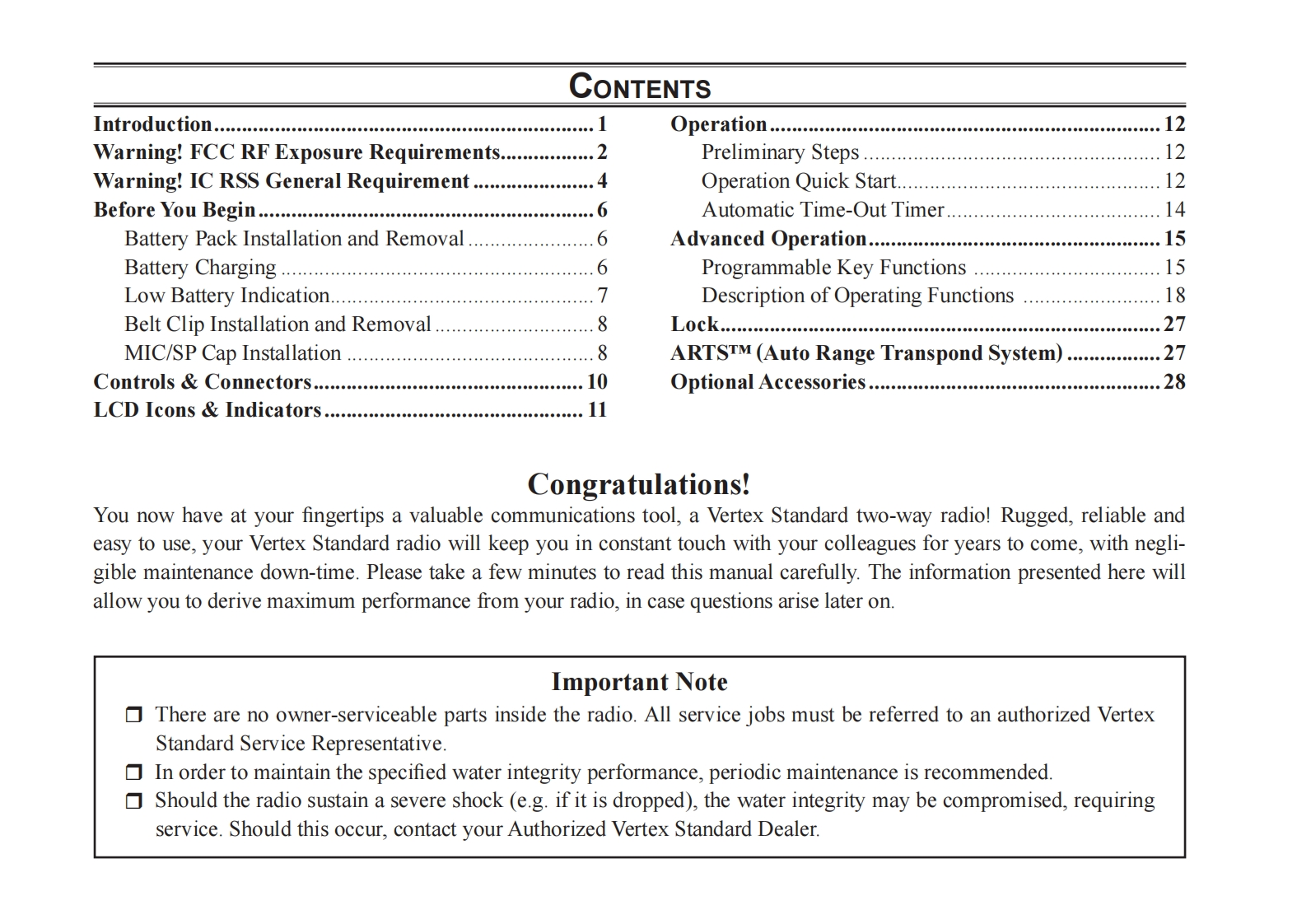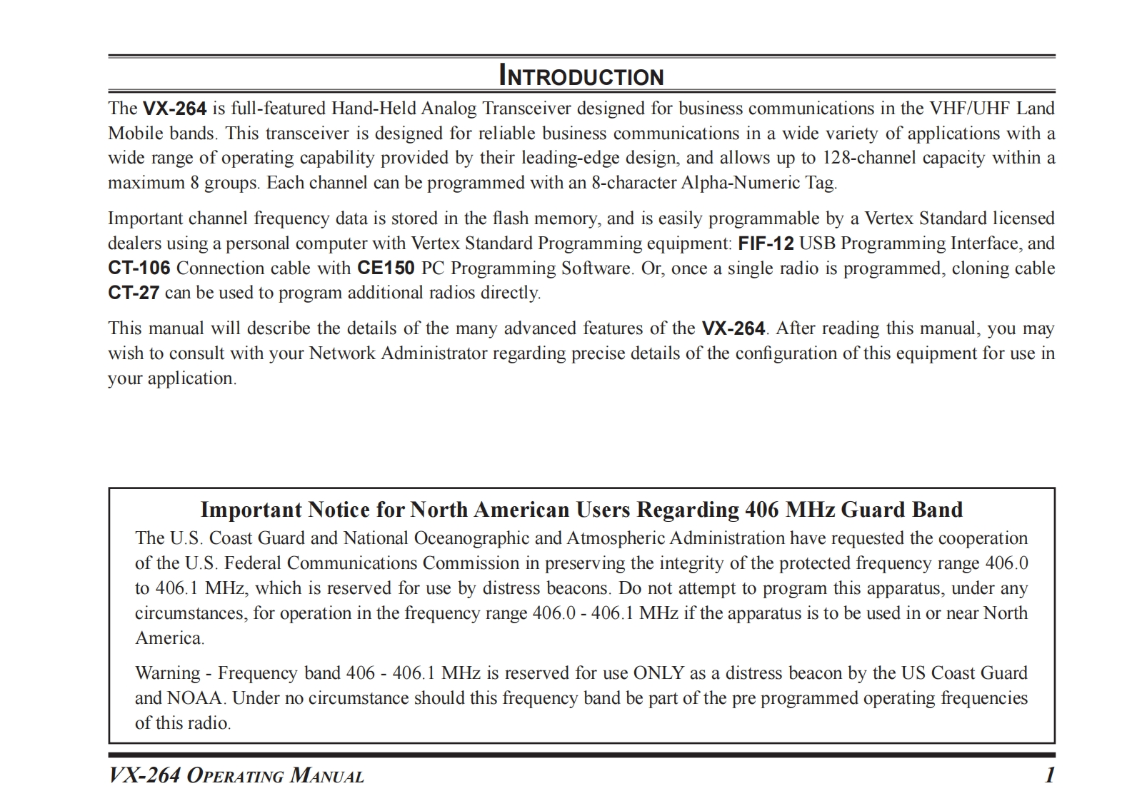 Vertex StandardVX-264OPERATING MANUALPROGRAMMABLE FUNCTIONS/FEATURES·lP55 Vater ResistantVertex Standard月Six Programmable Function Keys.2-Tone Encode/Decode.5-Tone Encode/Decode·MDC-1200®Encode(ANI Encode)·DTMF Encode●Scan●Group Scan品VX-264·Dual Watch●Follow-Me Scan·Talk Around ScanVoice Inversion Encryption·VoX。Talk AroundA B C D·Emergency·Lone Worker·TX Save Disable·LockARTSTM(Auto Range Transpond System)