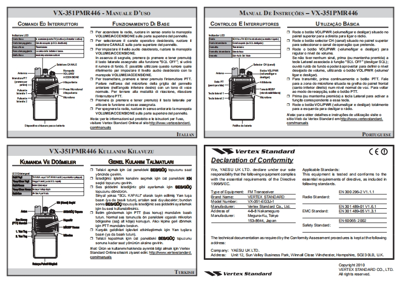 VX-351PMR446 OPERATING MANUALMANUEL D'UTILISATION VX-351PMR446CONTROL SWITCHESBAISIC OPERATIONCOMMANDES ET INTERRUPTEURSUTILISATION DE BASETurn te top panef's VOL/PWR krob clockwise to tum on theSur la tace supereure,toumezrado.tL四-Volumedanss lesem horare pour alumer vorerado.2 N BFRASCAN4国每os】Turn the top panel's CH selector knob to choose the desired袖te学aFss4aSur la tace supdricure,tourrez le sdlectour de canaux (CH)operating channelRiotate the VOL/PWR knob to set the desred audo levelRegez le riveau audo en toumant le boution Mahs/AntIf no sigmal is present,press (or press and hold in)the Sideb-Audb St MobeEn I'absence de signal appuyez su (ou mantanez)le boutonnow be heard,and youay use this to set the VOL/PWR knoblatal programme sur la fonction 'SOL Desactive.Vousor the desired audiolevel.andTo transmit press and hold in the PTT switch.Speak intoentndez le brutt de tond e vous pouvez Iudilser commenedrence pour regler le niveau auio avee le bouton Mardhalthe microphoe area of the front paned grlle dower nghtAmet-Volume.hand comer)n a nommal voicelevel.To retum to he ReceiveFour metre,mairtenez I'Alernat Parez dune vol romalePuath To Takmode,release the PTT swtch.口Pess你press and hold ir the Side key to actrate theundion which i corresponding wth that key.drot du pameau avant).Four revenir en mode de recegtionx或目OCP口Turn the top panefs VOU/PWR knc士ly counfer clockwsechez【Ah格m.to tum off the radio.Appuyez su (ou maintaez)le bouton latra pour aciver laNote:For product details and instrudions for use go to Vertexa℃on atrbude aceboutonSur la tace superieure,toumez a fond I'intemupteur MardhoAmlt -Volme dars le sens arti-horaire pour edndre vatreRemargue pou dbtenir des intommatiors sur ceproduitet desinsstudions duddisation,alez surleste Vertex Sandand Orine:山ta药P内dL山thha四山pud bataieENGLISHFRENCHMANUAL DE INSTRUCCIONES DE VX-351PMR446VX-351PMR446 BEDIENUNGSANLEITUNGCONTROL E INTERRUPTORESFUNCIONAMIENTO BASICOBEDIENELEMENTEKURZANLEITUNG口Gine el man由全OLUMENENCENDIDO-APAGADOS3iO口um日ne寸altn des Funkgers drehen Se den EN/AUS/en el panel superior an el sertido de las aguas del relj paraLautstirlereglor oben am Gerat im Uhracigersin.CAN RAGC利a幽eneender el trangoegtor.仑利WMO制是s架u山山当Gire el mando de SELECCION DE CAMAL suado en el pandhesa超dal同Kanawahbchals obon amGo chn.superior para seleodonar el cand de Lndoamiento deseadaGire d mando de VOLUMEN/ENCENDDO-APAGADO para画星1ertsprechendes Drehan des日N/AUS/Laut:星keglos cinestadecer el nivd座auLo金a鱼.0Sino hay sefaL pube《omartenga pusa由)la tocl LATERALLiegtkein Sigal vo,drocken Sie kurz bw.lng die seitlicheTaste,die der Rasdapementschaturktion zugeordndalc比nandasignadi a l tundon'S0Ldesacivado'.De esafoma esochardrido de tondo.que podrd utlizar para estbloer el volmenist.Jetzt sind auch Hntergnundgerdus che herbar.Se konnen罐aaBdies zum Erstela des EN/AUS/Lautstirkeregl auf denINCB00OArrmNU方gewCnsciten Kangpegel benuzenAPAGADOZum Sendion ducken Sle die Sendetaste und haten siezona del micrdlono sitada en b rejla d