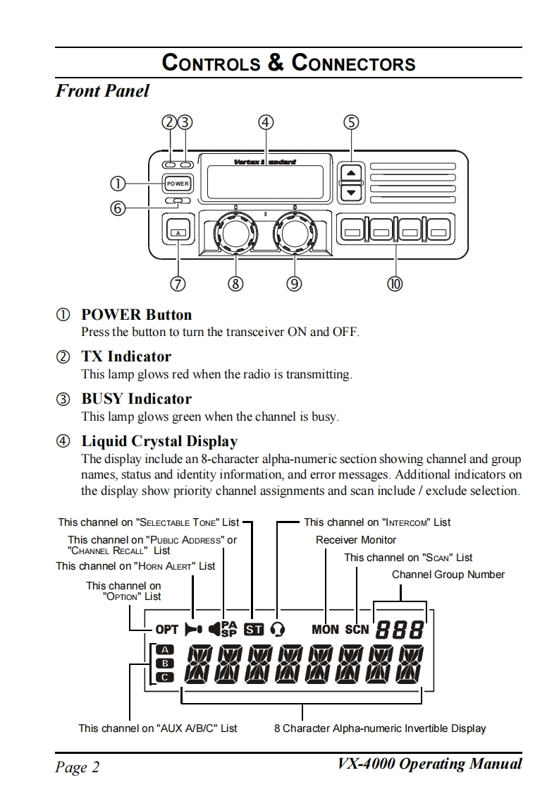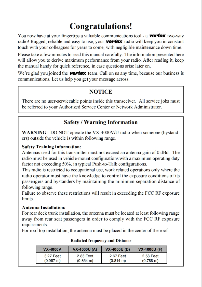Vertex StandardVX-4000OPERATING MANUALMANUAL DE OPERACIONPOWERVERTEX STANDARD CO.,LTD.4-8-8 Nakameguro,Meguro-Ku,Tokyo 153-8644,JapanVERTEX STANDARDUS Headquarters17210 Edwards Rd.,Cerritos,CA 90703,U.S.A.International Division8350 N.W.52nd Terrace,Suite 201,Miami,FL 33166,U.S.A.YAESU EUROPE B.V.P.O.Box 75525,1118 ZN Schiphol,The NetherlandsYAESU UK LTD.Unit 12,Sun Valley Business Park,Winnall CloseWinchester,Hampshire,SO23 0LB,U.K.YAESU GERMANY GmbHAm Kronberger Hang 2,D-65824 Schwalbach,GermanyVERTEX STANDARD HK LTD.Unit 5,20/F.,Seaview Centre,139-141 Hoi Bun Road,Kwun Tong,Kowloon,Hong Kong