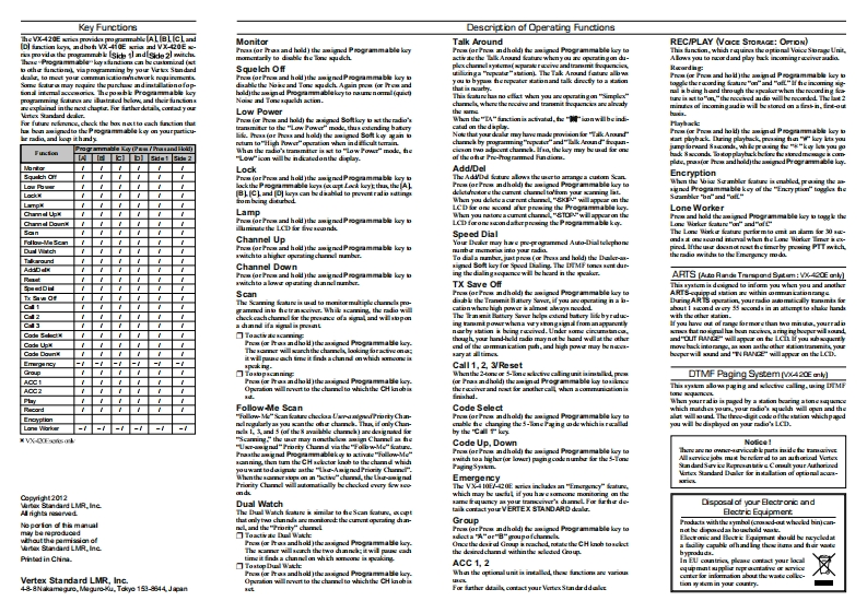 S Vertex StandardBelore You BegnOperationVX-410E/-420E SeriesBattery Pack Installationand RemovalPreliminary Stepsand hol in the Pogram-heh■a rechuarg ahbut可ka国to hetranubek等aignedto MO.N-Operating Manualaoyour palim ov the peaker and your hurrhi onthe topUk“emore fun I second(oraf ihe bet clp.Insrt hebattrypack into hebuattarycomCortrols Connectors口Scrow he甲d atm orto he Arterrupack.Nover动tempttoop rate his ramaine withot an antmu corneded.nd审tangof the VX40日-20E.Operation Quick S也rtand male aure t a cleara□Totrarumit,proo and hold n thqast在Bsay PakLacPThh.Speak irto the m心0U刚R士dio on.o remove the buttary,tumn herado aff andrmovs arryanorall voice level Torctun tothe Recive mode.release thePT.tTeT●pa心PTI withh在Tun the oppand's CH adectorknob tochoos the dairedoper-dating dumnd.☐f/'Microphone is言hic thetpk41在电NWrw的any of the清wa业如nd由锈o mourting acnew or用he柱ka国hearinst theninat he plug fromn he Spealor Micophone irtong the acrewaLow Battery Indicationupno口As the hatery山furges drng us,hevo lge山y□otate the VOL/PWR kn由tost包agWh上ng Totranenit.pras起PTthon he Spealen'Microphone,t题ya四woul on he mainandhhhrarcdver'kbody.2-多8N.e theorgn p山atic cap adi由outing cTewThey shouldbe roimtled whennotuing the SpalenP室L山过Aw oid rechurging batericso ten with Ettle use betwecnsecondg backg round noie wllhh品to st the VOLPW由红hOoeratng Temperature Rangethe operaSon广sh起r orota better long-m bate可px-24℃05℃tyLImpartart NaticeDisplay loons hdicators (VX-420E Only]Accessories CotionsVertex StandardCEΦ品u瑞地m7.2V 1 400 mAh N-MH BattryDeclaration of ConformityFNBV947.2V1Dmh-MHt证y日A.5AuM地ch”dh+购a上多o多a#y山dd当AC前(orF-V67LA)VAC80206-mmt MChngeriforF-WType ofE9车m在FUT oncakerPAdrandNumec可O5TORO■oMNubec0410C40C5m✉ncaEMof:48-8 Meguro-KuH-360SSpalen'Microphone (Mniature Type)MH-450SVc-25CUPTC¥.上C口◆.1VOCharader Aph-numeric口山y部第D200.083Rado RardardAa dmmn Bi or Ene器A1151○55As里C好L¥4AN Encoden/llcoder UntA#的到验Ed当CMC SandardATU-60bha Antmu45040eH红artex Stamdard duall a be lable野d山wwengknacwhd图A8观bbr Antm I34l4 Hx (Untund山d国a同由ns,a细o bon of bumorATVaCbbr Antmru 161-174 MHz,名dydd通n-hxd5ay2ndrtn与tdda以C第27Aasament proodures in k蓝he blowing addm正12Company:YAESUUK LTD.Urit12,Sun Vley Duatineu Park Wirnal Clate