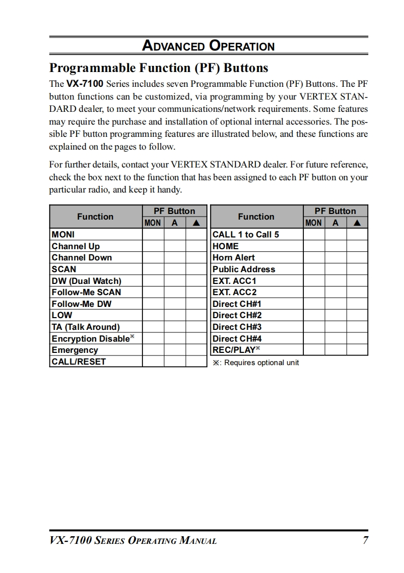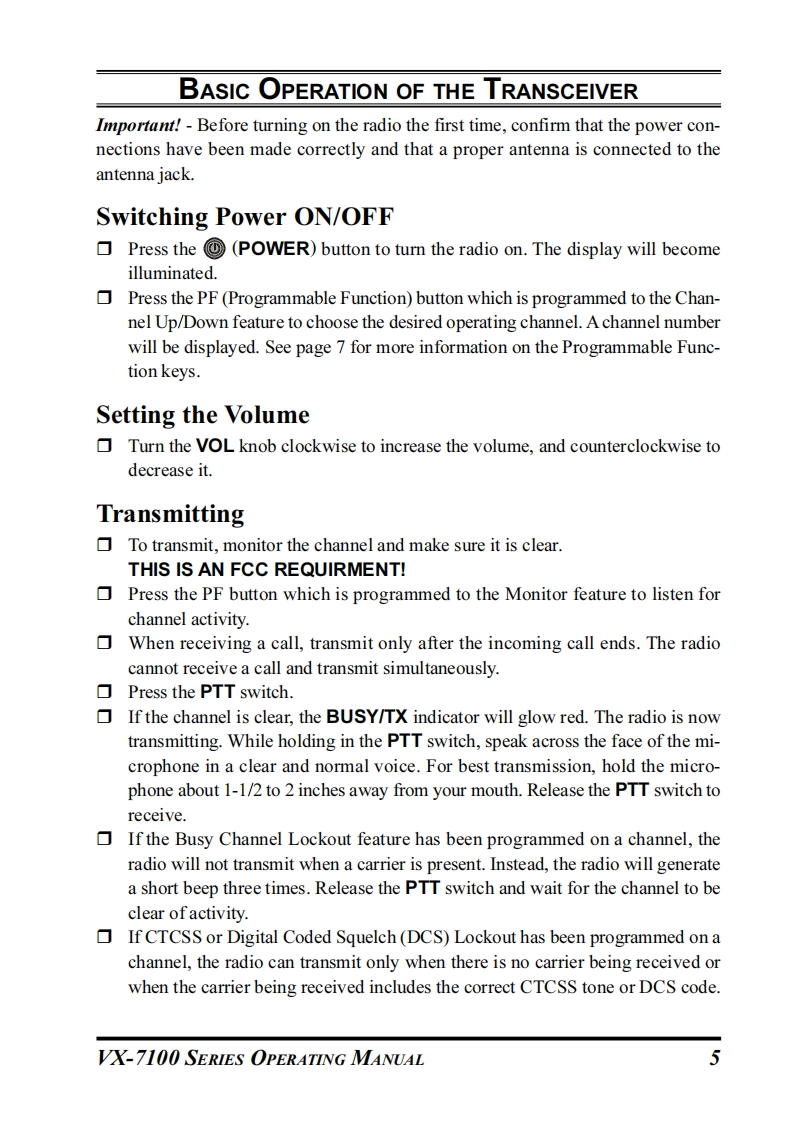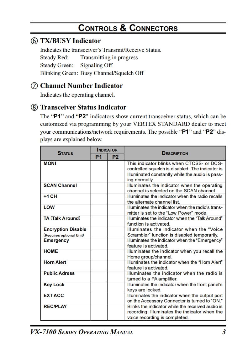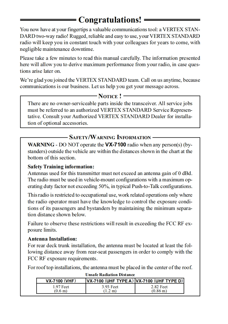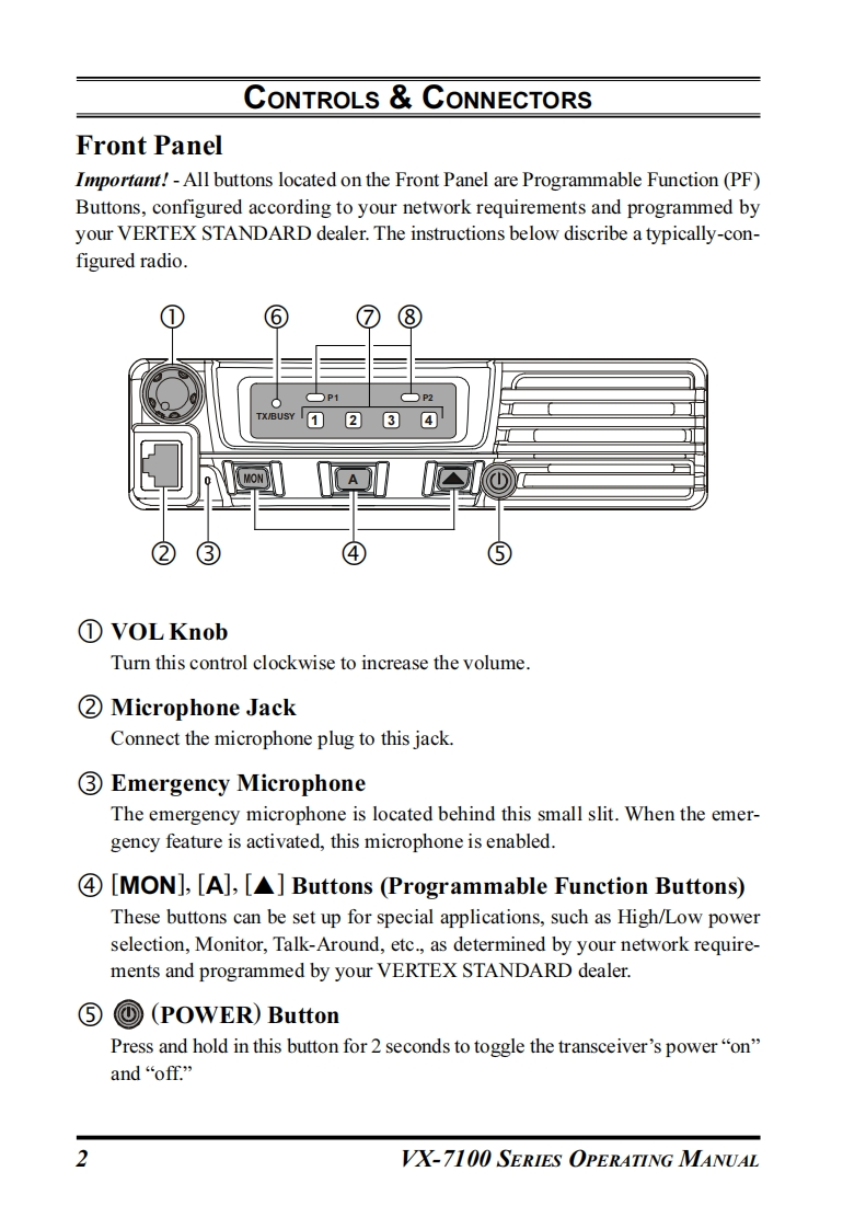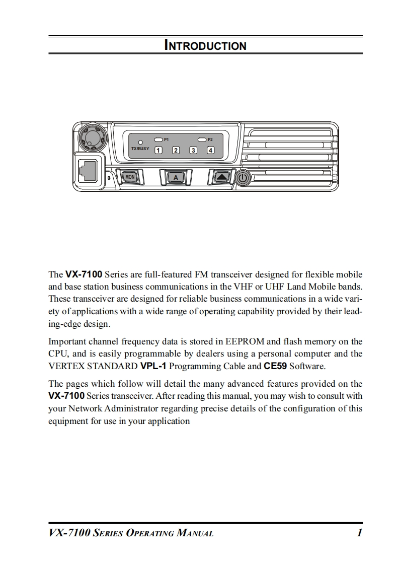 Vertex StandardVWX-7100SERIESOPERATING MANUAL☐P2TX/BUSY▣②VERTEX STANDARD CO.,LTD4-8-8 Nakameguro,Meguro-Ku,Tokyo 153-8644,JapanVERTEX STANDARDUS Headquarters10900 Walker Street,Cypress,CA 90630,U.S.A.YAESU EUROPE B.V.P.O.Box 75525,1118 ZN Schiphol,The NetherlandsYAESU UK LTD.Unit 12,Sun Valley Business Park,Winnall CloseWinchester,Hampshire,S023 0LB,U.K.VERTEX STANDARD HK LTD.Unit 5,20/F.,Seaview Centre,139-141 Hoi Bun Road,Kwun Tong,Kowloon,Hong Kong