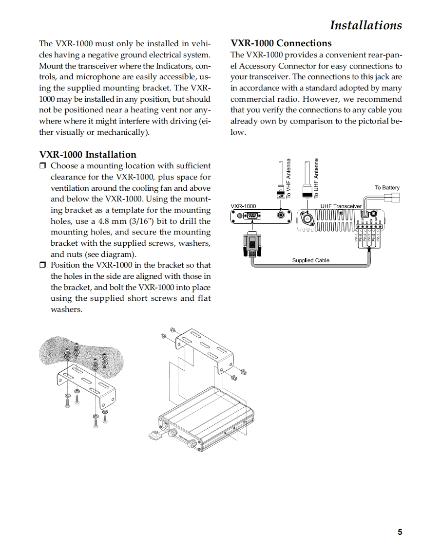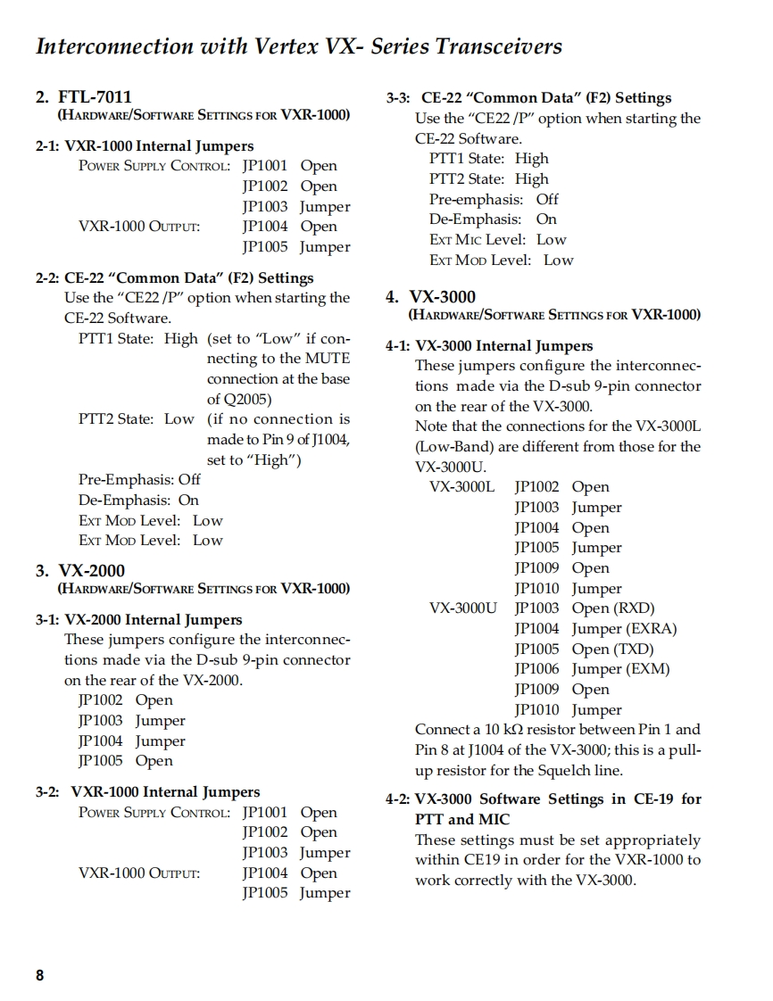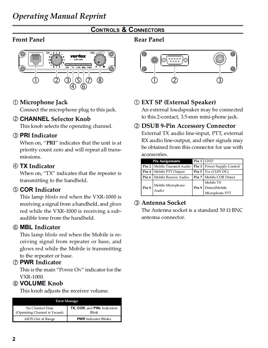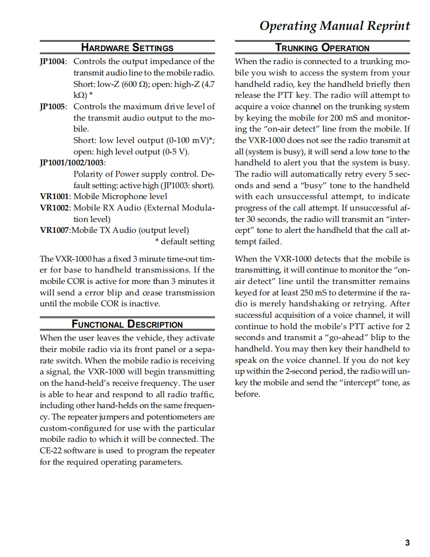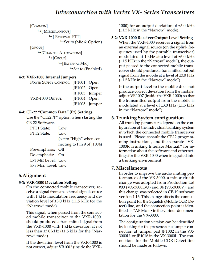 VehicularVERTEX STANDARD CO.,LTD.4-8-8 Nakameguro,Meguro-Ku,Tokyo 153-8644,JapanCross-band RepeaterVERTEX STANDARDUS Headquarters10900 Walker Street,Cypress,CA 90630.U.S.A.VXR-1000 (VHF)YAESU EUROPE B.V.P.O.Box 75525,1118 ZN Schiphol,The NetherlandsYAESU UK LTD.Unit 12,Sun Valley Business Park,Winnall CloseService ManualWinchester,Hampshire,SO23 OLB.U.K.VERTEX STANDARD HK LTD.Unit 5,20/F.,Seaview Centre,139-141 Hoi Bun Road,2003 VERTEX STANDARD CO.,LTD.E137190AKwun Tong,Kowloon,Hong KongCHVOvertexVXR-1000PRI TX COR MBL PWRThe VXR-1000 Series is designed to provide extended handheld coverage by repeating transmissionsin both directions through an existing high power mobile radio.Reliability is assured by a highly integrated surface mount circuit design and a aluminum extrusionchassis.Important channel frequency data is stored in EEPROM,and is easily programmable bydealers using a personal computer and the Vertex VPL-1 Programming Cable and CE-22 Software.Please take a few minutes to read this manual carefully.The information presented here will allowyou to derive maximum performance from your VXR-1000.After reading it,keep the manual handyfor quick reference,in case questions arise later on.We're glad you joined the Vertex team.Call on us any time,because our business is communications.Let us help you get your message across.ContentsOperating Manual Reprint.....2Exploded View Miscellaneous Parts........25Specifications¥Bl0 ck Diagram…26Installations5Circuit Description27Interconnection withAlignment29Vertex VX-Series Transceiver........7Repeater Cloning…32VXR-1000 Trunking Interface Manual......11Board Unit (Schematics,Layouts Parts)CE-22 Programming Software .........14Main Unit……33