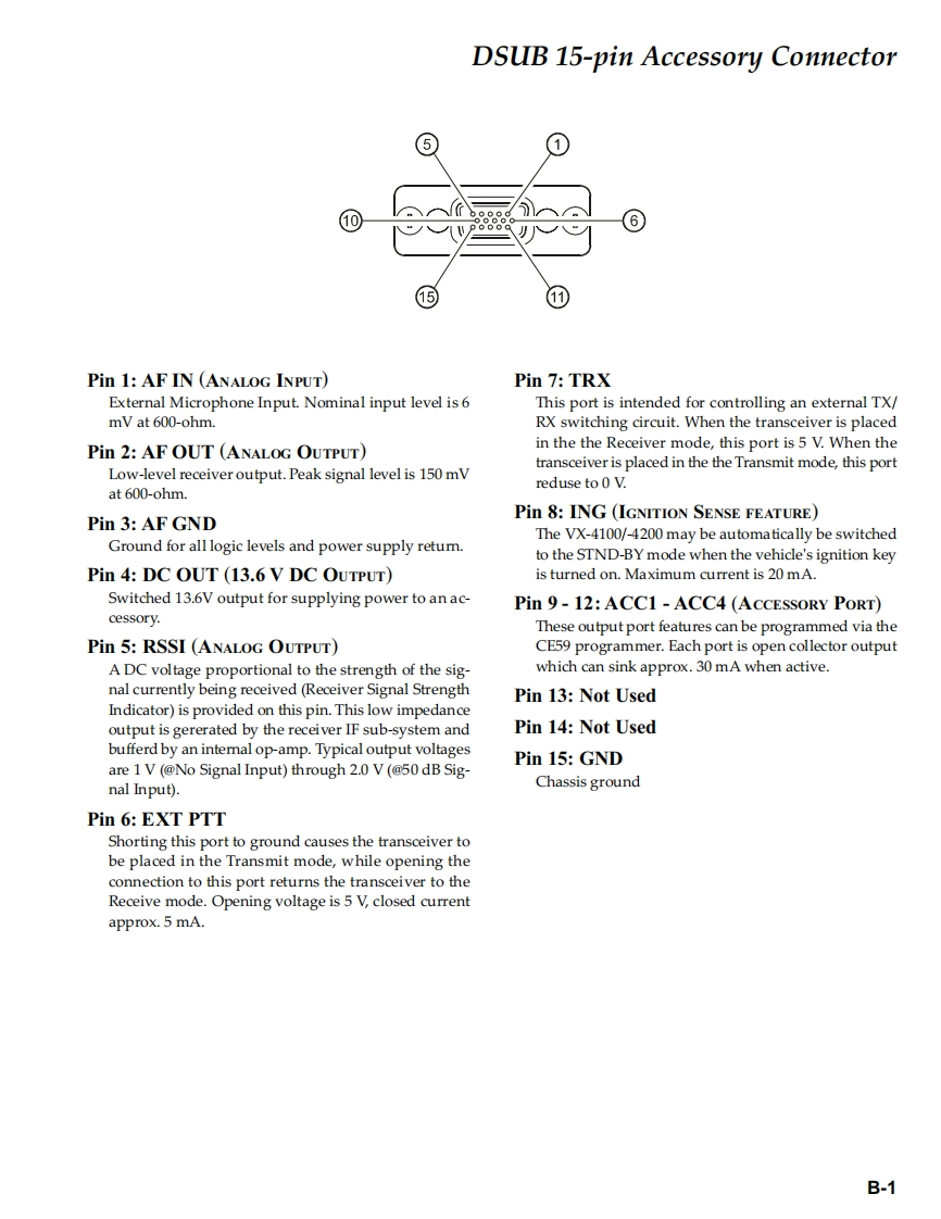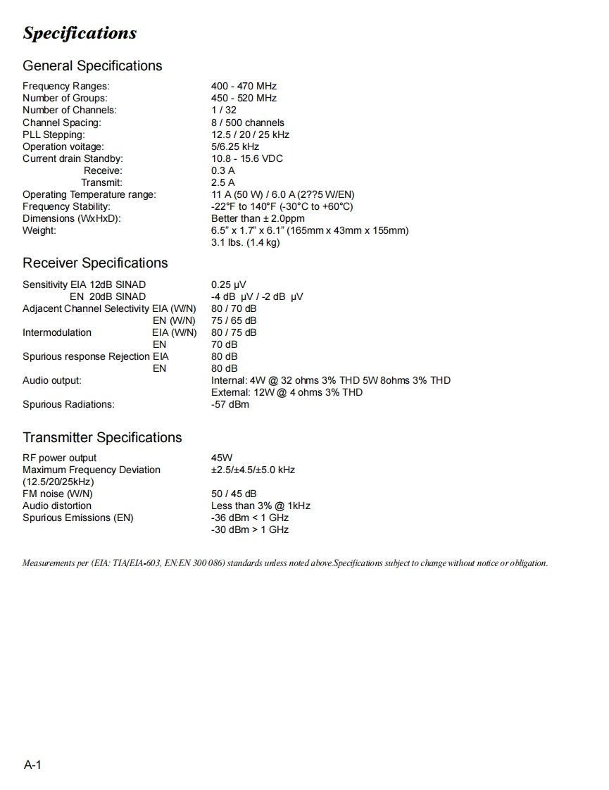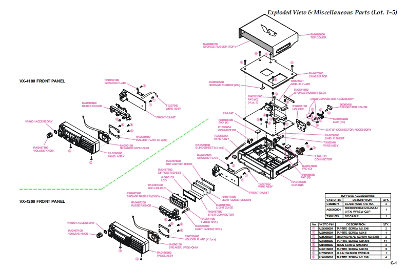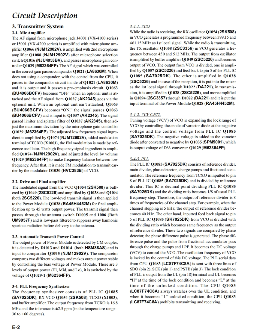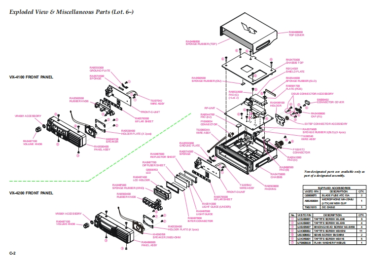 Vertex StandardVERTEX STANDARD CO.,LTD.4-8-8 Nakameguro,Meguro-Ku,Tokyo 153-8644,JapanVERTEX STANDARDUHF FM TransceiverUS Headquarters10900 Walker Street,Cypress,CA 90630,U.S.A.VX-4200 SeriesYAESU EUROPE B.V.P.O.Box 75525,1118 ZN Schiphol,The NetherlandsVX-4100 SeriesYAESU UK LTD.Unit 12,Sun Valley Business Park,Winnall CloseWinchester,Hampshire,S023 OLB,U.K.Service ManualVERTEX STANDARD HK LTD.Unit 5,20/F.,Seaview Centre,139-141 Hoi Bun Road,Kwun Tong,Kowloon,Hong KongC2004 VERTEX STANDARD CO.,LTD.EC035U90BP回回同回LERTEX-VX-4100 SeriesVX-4200 SeriesIntroductionThis manual provides the technical information necessary for servicing the VX-4200/-4100 Series Mobile Transceiver.Servicing this equipment requires expertise in handing surface-mount chip components.Attempts by non-qualifiedpersons to service this equipment may result in permanent damage not covered by the warranty,and may be illegal insome countries.Two PCB layout diagrams are provided for each double-sided board in this transceiver.Each side of the board isreferred to by the type of the majority of components installed on that side ("Side A"or "Side B").In most cases oneside has only chip components(surface-mount devices),and the other has either a mixture of both chip and leadedcomponents(trimmers,coils,electrolytic capacitors,ICs,etc.),or leaded components only.As described in the pages to follow,the advanced microprocessor design of the VX-4200/-4100 allows a completealignment of this transceiver to be performed without opening the case of the radio;all adjustments can be performedfrom the personal computer,using with the Vertex Standard VPL-1 Programming Cable and CE59 Software.While we believe the information in this manual to be correct,Vertex Standard assumes no liability for damage thatmay occur as a result of typographical or other errors that may be present.Your cooperation in pointing out anyinconsistencies in the technical information would be appreciated.ContentsSpecificationsA-1Board Units (Schematics,Layouts Parts)DSUB 15-pin Accessory Connector.............B-1RP Uhit.H-1Exploded View Miscellaneous Parts ............C-1FRONT-C Unit (VX-4100).I-1Block Diagram.….D-1FRONT-D Unit (VX-4200)..J-1Circuit Description..E-1Optional Units(Schematics,Layouts Parts)Alignment....……F-1FVP-25 Encryption/DTMF Pager Unit.........K-1Installation of Option...G-1DVS-5 Voice Storage Unit...L-1VTP-50 VX-Trunk Unit.........m.M-1