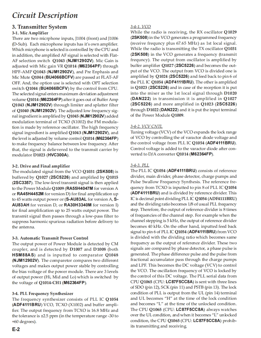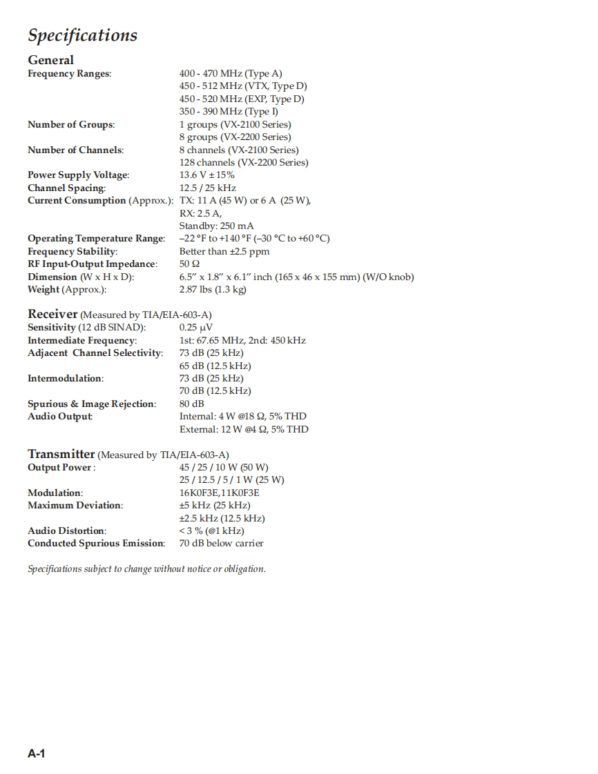 Vertex StandardVERTEX STANDARD CO.,LTD.4-8-8 Nakameguro,Meguro-Ku.Tokyo 153-8644.JapanVERTEX STANDARDUHF FM TransceiverUS Headquarters10900 Walker Street,Cypress,CA 90630,U.S.A.VX-2100 SeriesYAESU EUROPE B.V.P.O.Box 75525,1118 ZN Schiphol,The NetherlandsVX-2200 SeriesYAESU UK LTD.Unit 12.Sun Valley Business Park,Winnall CloseWinchester,Hampshire,SO23 OLB.U.K.Service ManualVERTEX STANDARD HK LTD.Unit 5,20/F.,Seaview Centre,139-141 Hoi Bun Road,Kwun Tong,Kowloon,Hong KongC2007 VERTEX STANDARD CO.,LTD.EC061U90B8日uwm色0州P84OU A BVERTEX-■■■VX-2100 SeriesVX-2200 SeriesIntroductionThis manual provides the technical information necessary for servicing the VX-2100/-2200 Series Mobile Transceiver.Servicing this equipment requires expertise in handing surface-mount chip components.Attempts by non-qualifiedpersons to service this equipment may result in permanent damage not covered by the warranty,and may be illegalin some countries.Two PCB layout diagrams are provided for each double-sided board in this transceiver.Each side of the board isreferred to by the type of the majority of components installed on that side("Side A"or "Side B").In most cases oneside has only chip components(surface-mount devices),and the other has either a mixture of both chip and leadedcomponents(trimmers,coils,electrolytic capacitors,ICs,etc.),or leaded components only.As described in the pages to follow,the advanced microprocessor design of the VX-2100/-2200 allows a completealignment of this transceiver to be performed without opening the case of the radio;all adjustments can be performedfrom the personal computer,using with the Vertex Standard VPL-1 Programming Cable and CE82 Software.While we believe the information in this manual to be correct,Vertex Standard assumes no liability for damage thatmay occur as a result of typographical or other errors that may be present.Your cooperation in pointing out anyinconsistencies in the technical information would be appreciated.Important NoteThis transceiver was assembled using Pb(lead)free solder,based on the RoHS specification.Only lead-free solder(Alloy Composition:Sn-3.0Ag-0.5Cu)should be used for repairs performed on this ap-paratus.The solder stated above utilizes the alloy composition required for compliance with the lead-freespecification,and any solder with the above alloy composition may be used.ContentsSpecifications.A-1Board Units(Schematics,Layouts Parts)DSUB 15-pin Accessory Connector..................B-1MAIN Unit..H-1Exploded View Miscellaneous Parts ..............C-1FRONT-A Unit (VX-2100)..I-1Block Diagram..D-1FRONT-B Unit (VX-2200)......J-1Circuit Description.n…E-1Optional Units(Schematics,Layouts Parts)Alignment..n…f-1FVP-25 Encryption/DTMF Pager Unit.........K-1Installation of Option ...........G-1FVP-36 Voice Inversion Type Encryption Unit.....L-1