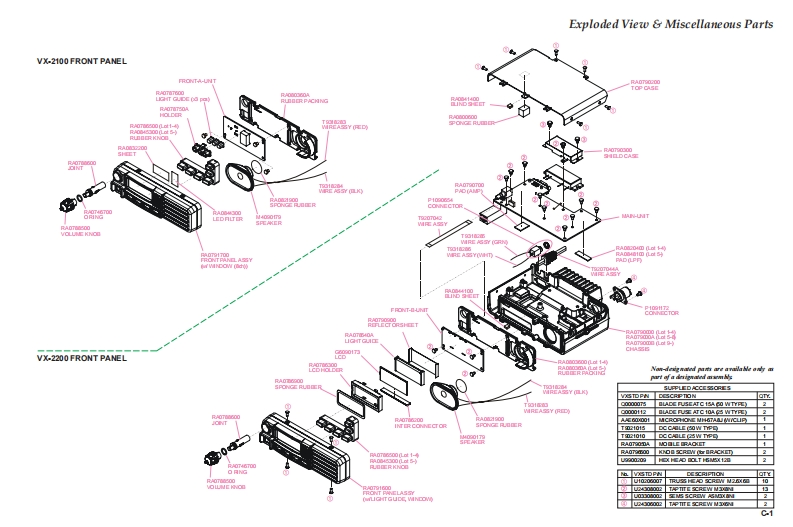 Vertex StandardY5EXsANPAR8,C9aR64.JpanVERTEX STANDARDVHF FM Transceiver9859eStcps,cA90630,UsAYAESU EUROPE B.V.VX-2100 SeriesP.O.Box 75525,1118 ZN Schiphol,The NetherlandsYAESU UK LTD.VX-2200 SeriesWnceserName CosVERTEX STANDARD HK LTD.Unit 5,20/F.,Seaview Centre,139-141 Hoi Bun Road,Service ManualKwun Tong.Kowloon,Hong KongVERTEX STANDARD (AUSTRALIA)PTY.,LTD.2006 VERTEX STANDARD CO.,LTD.EC061N90CNormanby Business Park,Unit 14/45 Normanby RoadNotting Hill 3168,Vicloria,Australia■■■VX-2100 SeriesVX-2200 SeriesIntroductionThis manual provides the technical information necessary for servicing the VX-2100/-2200 Series Mobile Transceiver.Servicing this equipment requires expertise in handing surface-mount chip components.Attempts by non-qualifiedpersons to service this equipment may result in permanent damage not covered by the warranty,and may be illegalin some countries.Two PCB layout diagrams are provided for each double-sided board in this transceiver.Each side of the board isreferred to by the type of the majority of components installed on that side("Side A"or"Side B").In most cases oneside has only chip components(surface-mount devices),and the other has either a mixture of both chip and leadedcomponents(trimmers,coils,electrolytic capacitors,ICs,etc.),or leaded components only.As described in the pages to follow,the advanced microprocessor design of the VX-2100/-2200 allows a completealignment of this transceiver to be performed without opening the case of the radio;all adjustments can be performedfrom the personal computer,using with the Vertex Standard VPL-1 Programming Cable and CE82 Software.While we believe the information in this manual to be correct,Vertex Standard assumes no liability for damage thatmay occur as a result of typographical or other errors that may be present.Your cooperation in pointing out anyinconsistencies in the technical information would be appreciated.Important NoteThis transceiver was assembled using Pb(lead)free solder,based on the RoHS specification.Only lead-free solder(Alloy Composition:Sn-3.0Ag-0.5Cu)should be used for repairs performed on this ap-paratus.The solder stated above utilizes the alloy composition required for compliance with the lead-freespecification,and any solder with the above alloy composition may be used.ContentsSpecifications......A-1Board Units(Schematics,Layouts Parts)DSUB 15-pin Accessory Connector...............B-1MAIN Unit..H-1Exploded View Miscellaneous Parts .............C-1FRONT-A Unit (VX-2100).1-1Block Diagram ....….D-TFRONT-B Unit (VX-2200)..J-1Circuit Description....…E-1Optional Units (Schematics,Layouts Parts)Alignment…f-1FVP-25 Encryption/DTMF Pager Unit...........K-1Installation of Option ...…G-1FVP-36 Voice Inversion Type Encryption Unit.....L-1