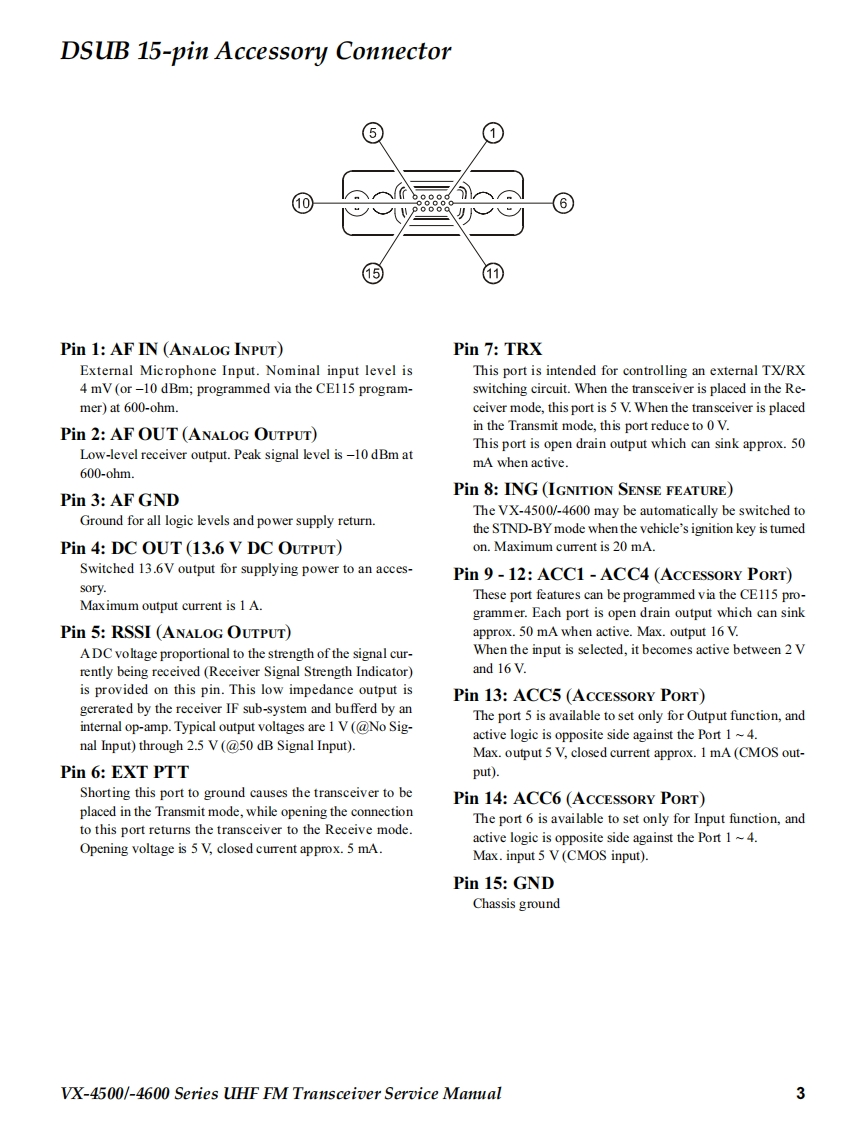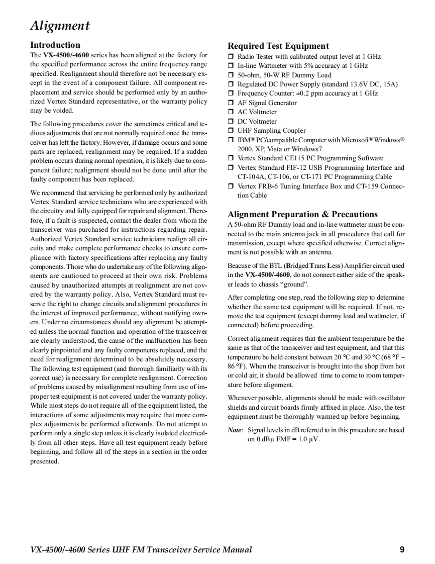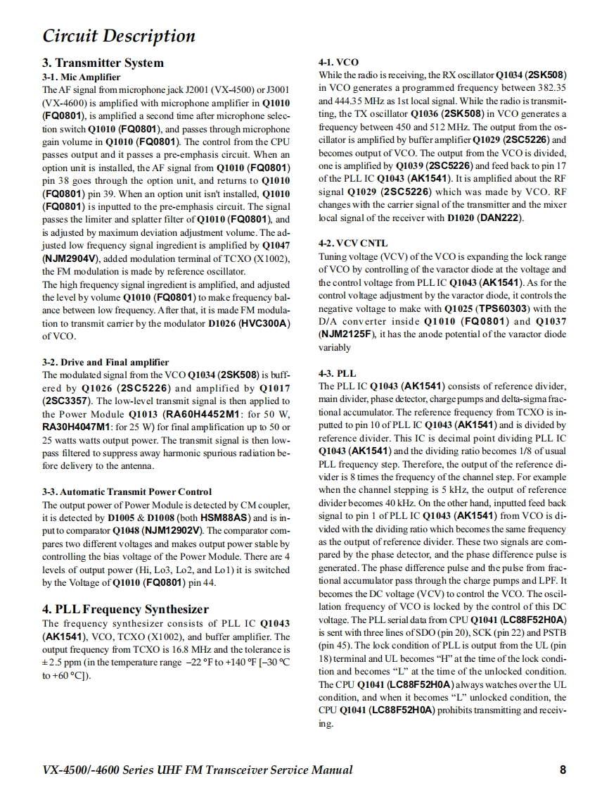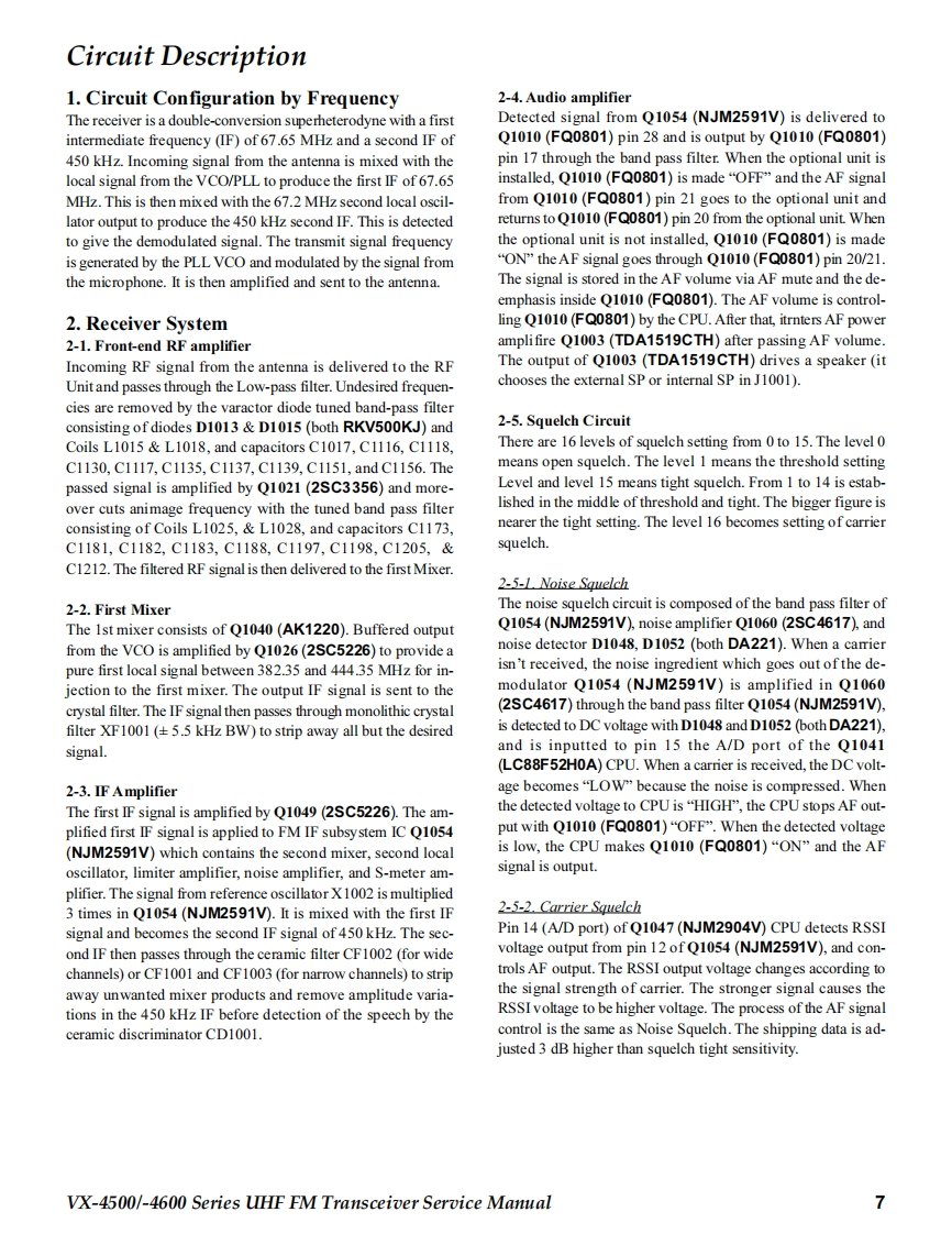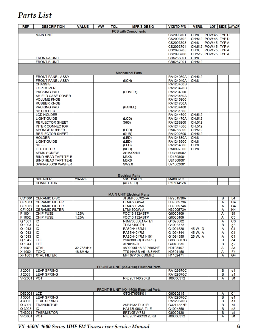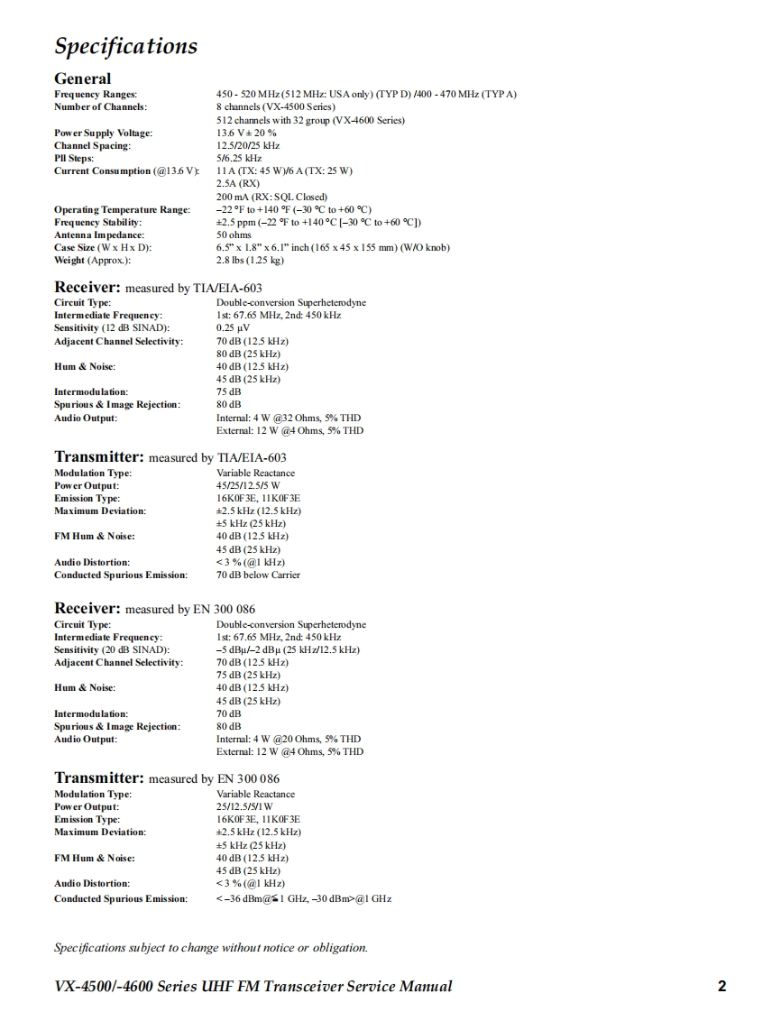SVertex StandardUHF FM TransceiverVertex Standard LMR,Inc.4-8-8 Nakameguro,Meguro-Ku,Tokyo 153-8644,JapanVX-4500 SeriesVX-4600 SeriesC2013 Vertex Standard LMR,Inc.EC093U90GService Manual☑酸8L精0dH日P88A B-VERTEX-P1P41】VX-4500 SeriesVX-4600 SeriesIntroductionThis manual provides the technical information necessary for servicing the VX-4500/-4600 Series Mobile Transceiver.Servicing this equipment requires expertise in handing surface-mount chip components.Attempts by non-qualified persons toservice this equipment may result in pemmanent damage not covered by the warranty,and may be illegal in some countries.Two PCB layout diagrams are provided for each double-sided board in this transceiver.Each side ofthe board is referred to by thetype of the majority of components installed on that side("Side A"or"Side B").In most cases one side has only chip components(surface-mount devices),and the other has either a mixture of both chip and leaded components(trimmers,coils,electrolyticcapacitors,ICs,etc.),or leaded components only.As described in the pages to follow,the advanced microprocessor design of the VX-4500/-4600 allows a complete alignment ofthis transceiver to be performed without opening the case of the radio;all adjustments can be performed from the personalcomputer,using with the Vertex Standard FIF-12 USB Programming Interface and CE115 Software.While we believe the information in this manual to be correct,Vertex Standard assumes no liability for damage that may occur asa result of typographical or other errors that may be present.Your cooperation in pointing out any inconsistencies in the technicalinformation would be appreciated.Important NoteThe VX-4500/-4600 was assembled using Pb(lead)free solder,based on the RoHS specification.Only lead-free solder(Alloy Composition:Sn-3.0Ag-0.5Cu)should be used for repairs performed on this apparatus.Thesolder stated above utilizes the alloy composition required for compliance with the lead-free specification,and any solderwith the above alloy composition may be used.ContentsSpecificatio nS2Installation of Option23DSUB 15-pin Accessory Connector...3Board Units(Schematics Layouts)Exploded View Miscellaneous Parts...4MAIN Unit.24Block Diagram ..........nn5FRONT-A Unit(VX-4500)36Parts List。6FRONT-B Unit (VX-4600).40Circuit Desc ription......7Optional Units (Schematics Layouts)AlignmeDVS-8 Voice Storage Unit..4VX-4500/-4600 Series UHF FM Transceiver Service Manual1
