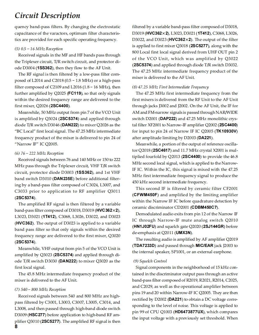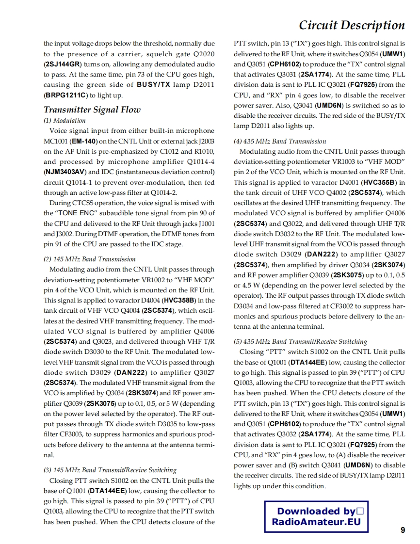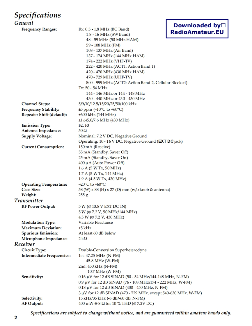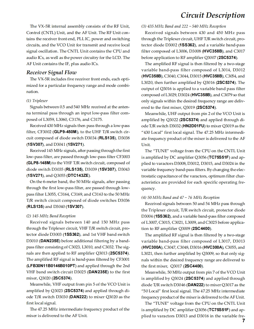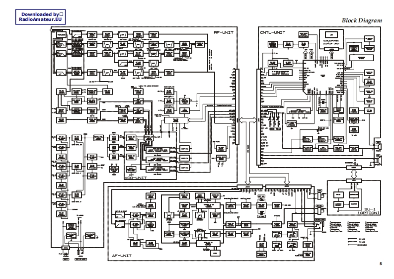 50/144/430 MHz Triple-BandVERTEX STANDARD CO..LTD.4-8-8 Nakameguro,Meguro-Ku,Tokyo 153-8644,JapanHeavy Duty FM TransceiverVERTEX STANDARD以auartersVX-5R8350 N.W.52nd Terrace,Suite 201,Miami,FL 33166,U.S.A.YAESU EUROPE B.V.P.O.Box 75525,1118 ZN Schiphol,The NethedandsYAESU UK LTD.Technical SupplementUnit 12,Sun Valley Business Park,Winnall CloseWinchester,Hampshire,SO23 0LB,U.K.VERTEX STANDARD HK LTD.Unit 5.20F..Seaview@2003 VERTEX STANDARD CO.,LTD.E126990ACentre.139-141 Hoi Bun Road,Kwun Tong.Hong KongIntroductionThis manual provides the technical information necessary for servicingthe VX-5R Triple-Band Heavy Duty FM Transceiver.Servicing this equipment requires expertise in handing surface-mountchip components.Attempts by non-qualified persons to service thisequipment may result in permanent damage not covered by the war-ranty,and may be illegal in some countries.Two PCB layout diagrams provided for each double-sided board inFM TRANSCEIVER VX-6this transceiver.Each side of the board is referred to by the type of themajority of components installed on that side("Side A"or"Side B").InmD0most cases one side has only chip components,and the other has ei-◎0咖咖0咖ther a mixture of both chip and leaded components(trimmers,coils,A@西electrolytic capacitors,ICs,etc.),or leaded components only.YAESUWhile we believe the information in this manual to be correct,VER-TEX STANDARD assumes no liability for damage that may occur as a的可简result of typographical or other errors that may be present.Your coop-eration in pointing out any inconsistencies in the technical informa-tion would be appreciated.ContentsSpecification..,2Exploded View Miscellaneous Parts...............,3Block Diagram…5Interconnection Diagram....................6Circuit Description…7Alignment.…11Board Unit(Schematics,Layouts Parts)CNTL Unit..17AF Unit…35RF Unit .....51VCO Unit73Downloaded by▣RadioAmateur.EU