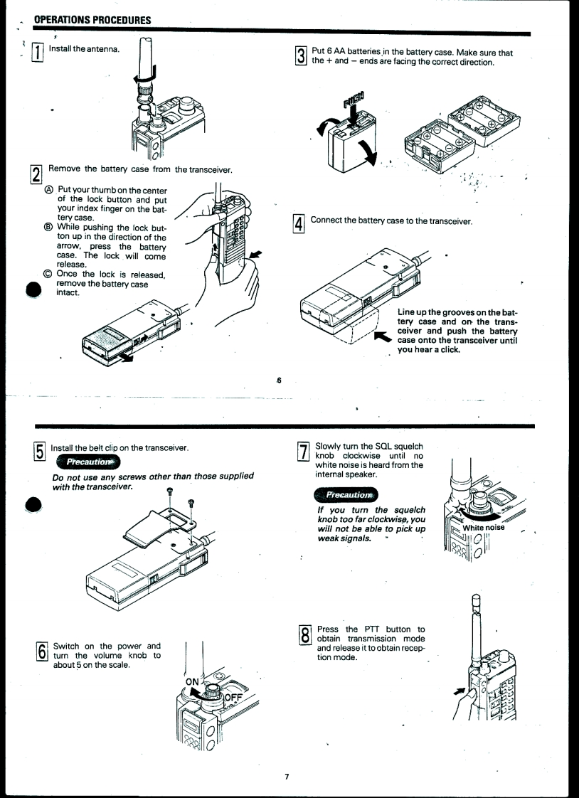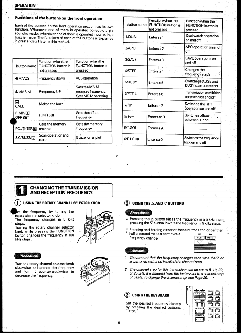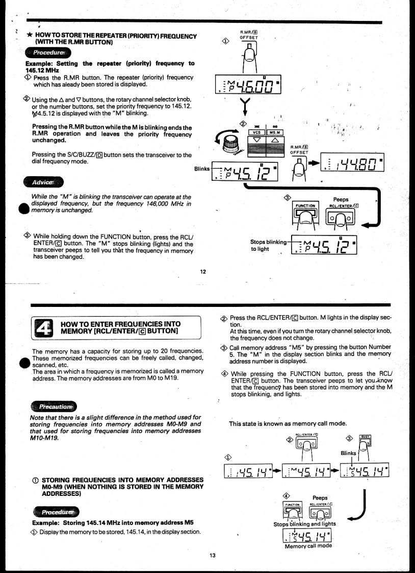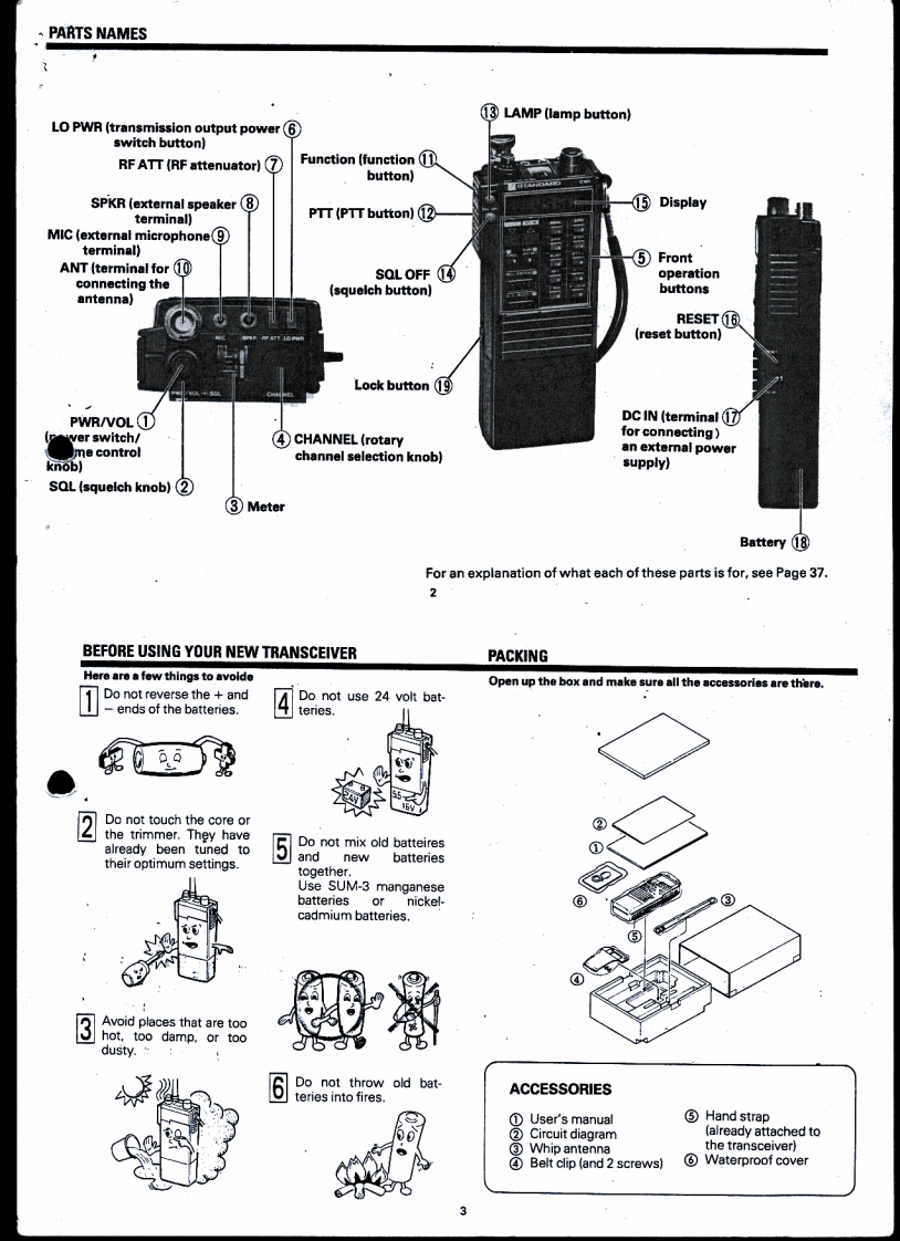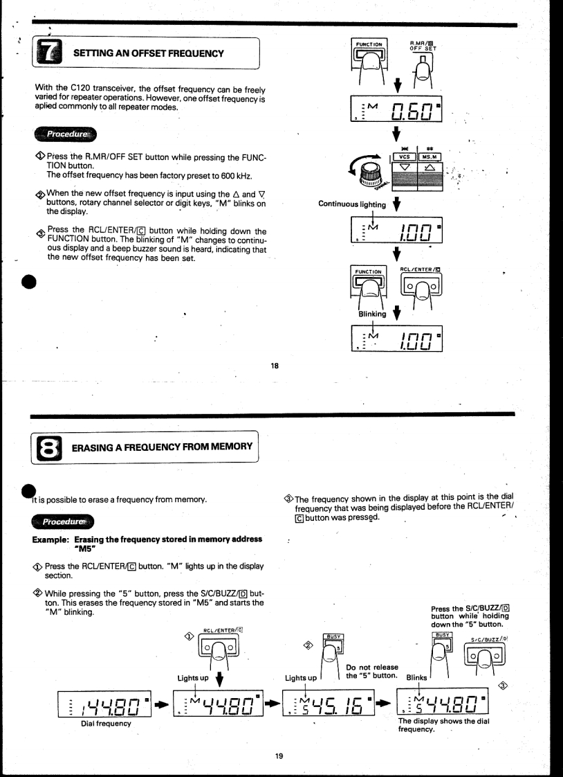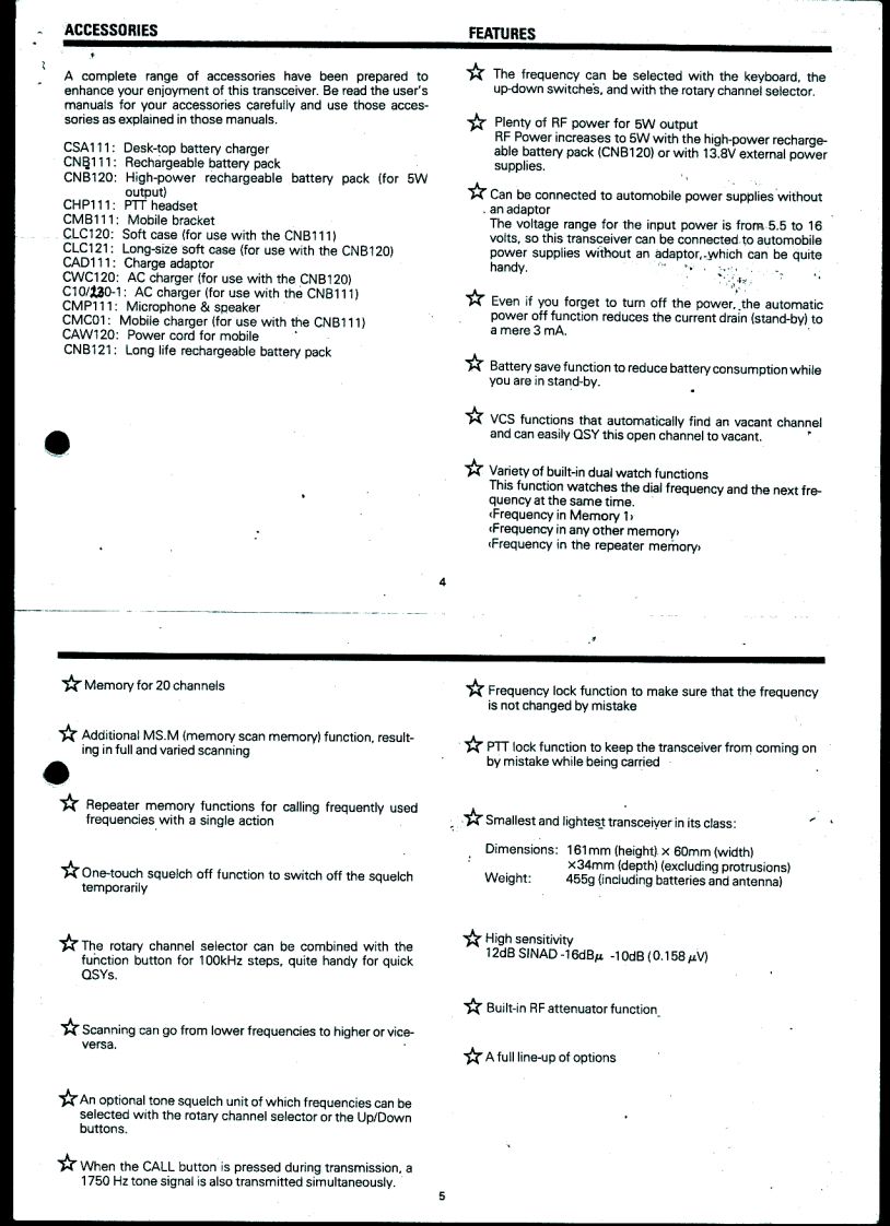 STANDARD.c120VHF Hand-Held TransceiverOWNER'S MANUAL等留国醒倒冒留国耳留Beh.T.HultermansPostbus42285604 EEEindhovenTABLE OF CONTENTSPARTS NAMESBEFORE USING YOUR NEW TRANSCEIVERPACKING.44444ACCESSORIESFEATURESOPERATIONS PROCEDURESOPERATIONTank you for purchasing this 144-MHzFUNCTIONS OF THE BUTTONS ON THE FRONT OPERATIONband hand-held transceiver.We have pro-CHANGING THE TRANSMISSION AND RECEIVE FREQUENCIESduced and shipped this transceiver withHOW TO CALL THE REPEATER ICALL/A BUTTONI....11stringent quality control and testing.If there3HOW TO CALL THE REPEATER FREQUENCIES WITH THE R.MR BUTTON ...11is any problem with this unit,please bring itHOWTO ENTER FREQUENCIES INTO MEMORY IRCLENTER/to the store where you purchased it or theBUTTON].13nearest one of our stores or service centersCALLING A FREQUENCY IN MEMORY WITH THE [RCLENTER/as soon as possible.回UTTON15So that you will be able to take full advan-CHANGING THE STORED FREQUENCY16tage of all the functions this transceiver hasSETTING AND OFFSET FREQUENCY.18to offer and use it for a long time,pleaseERASING A FREQUENCY FROM MEMORY19read through this entire user's manualMULTI-FUNCTION SCAN OPERATIONS [S/C/BUZZ/BUTTONIbefore using your new transceiver.DUALWATCH FUNCTION [1/DUAL BUTTONI,28AUTOMATIC POWER OFF FUNCTION WITH THE I2/APOI BUTTON28BATTERY SAVE FUNCTION WITH THE (3/SAVE]BUTTON29CHANNEL STEP SWITCH FUNCTION WITH THE I4/STEPI BUTTONm.30PAUSE SCAN/BUSY SCAN SWITCHING WITH THE I5/BUSYI BUTTON.........30MAKING THE PTT BUTTON NONEFFECTIVE WITH THE I6/PTT.LI BUTTON ...31REPEATER FUNCTION WITH THE [7/RPTI BUTTON .....31SWITCHING+/-SHIFT DIRECTION WITH THE [8/+/-I BUTTON32FREQUENCY LOCK FUNCTION WITH THE [O/F LOCKI BUTTON32TURNING OFF THE BUZZER WITH TEH [S/C/BUZZ BUTTON夕20 VCS FUNCTION FOR AUTOMATICALLY FINDING AN VACANT CHANNELIWITH THE(米vCS]BUTTONTHE NAMES AND JNCTIONS OF EACH PART38CONCERNING THE LITHIUM BATTERY......41BEFORE BRINGING YOUR TRANSCEIVER IN FOR SERVICING41RATINGS.......43