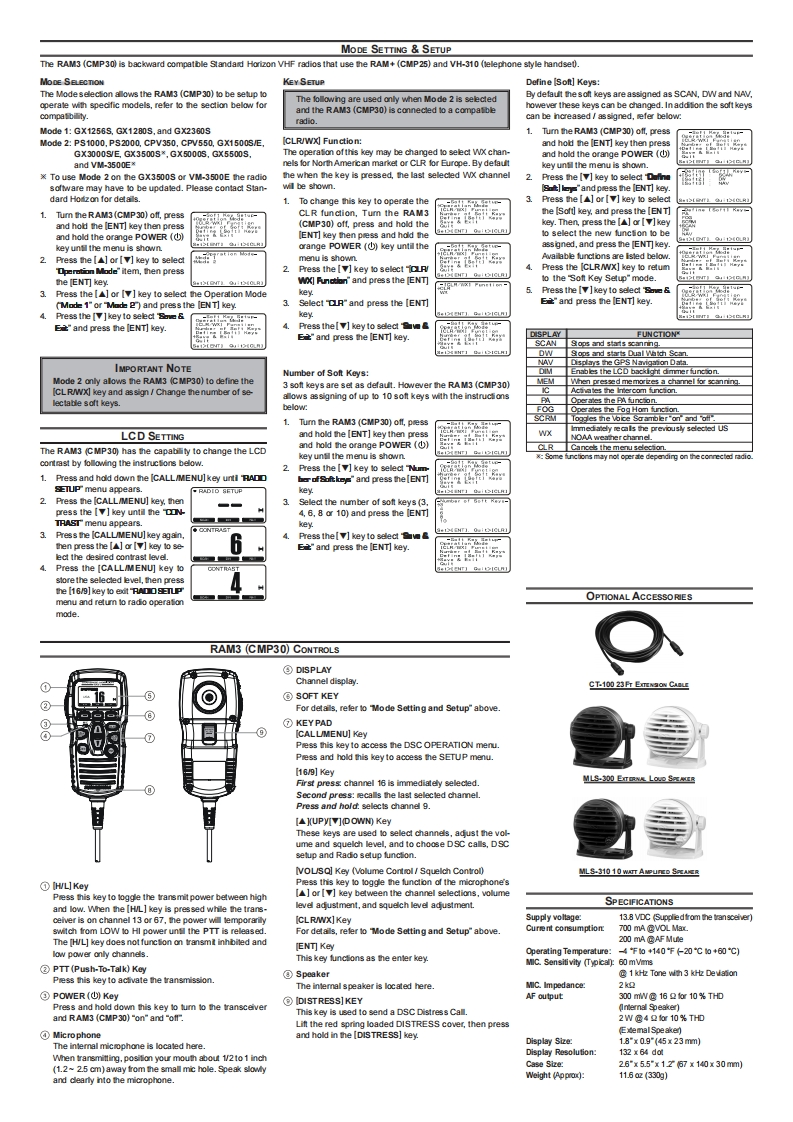 This device comples with part 15 of the FCC Rules.Operation is subject to theSTANDARD HORIZONlollowing to conditons:(1)This device may not cause harmlull interlerence.RAM3(CMP30)that may cause undesired operaton.Remote Station MicrophoneINCLUDED ACCESSORIES AND REPLACEMENT PART NUMBERS161.23-Foot Routng Cable (S8101512)2.Rubber Cap (RA052520A)3.Mounting Bracket (RA052510)&Screws (U24312020 x 4 pcs)4.Microphone Hanger (RA458800:Black or RA436000:Whte)&Screws (U40412220 x2 pcs)5.Ferrite Core (L9190182)团回The RAM3 (CMP30)alows you to remotely control all functions of Standard Horizonfxed mount VHF radios which indlude the Quantum series,Matrkx series,Quest-X,3Quest+,PS1000 and PS2000.The full dot matrix display and programmable keys45make operaton smple and fast.Additional features nclude turing the radio onoffand all DSC functions including Distress.When comecled to the Matrk GX3000S,orthe Quantum sedes,this remote station microphone also controls the 30W PA/hailerfuncsons.The RAM3 (CMP30)can be exlended up to 70 feetusing the cosonal CT-100 (23 Foon)exlension cabie.The RAM3(CMP30)is backed by an industry leading3-year waterproof warmanty.VERTEX STANDARD CO.,LTD.ERTEX STANDARD644.JapaCopyright 2009VERTEX STANDARD CO.,LTDr Cen.CA 0630.U5AAll rights reserved.YAESU UK LTD.No porton ofthis manualY器收cemay be eproducedOwner's ManualVERTEX STANDARD HK LTD.The detais of the nstallason and operaton of the RAM3(CMP30)is includedin the owner's manual of the compatble fxed mount radio,or it can be down-VERTEX STANDARD (AUSTRALIA)PTY.,LTD.loaded at www.stand ardhorizon.com.If you have any questions or comments,please contact Standard Horizon Matne Product Support at 800/767-2450.RAM3 (CMP30)INSTALLATIONSTANDARD HORIZON1.Connect the Exension Cable to the 8-pin conneclor on the transceivers rear panell,then tighten the Cable Nut (Figure 1).Declaration of Conformity2.Refering to Figure 2,attach the supplied ferritecore as cose as possible to the MICplug of the Routing Cable and Extemal Speaker Connections,then snap its twoWe,YAESU UK LTD.dedare under our sole responsiblity that the followinghaves together.And then,wind some plastic tape anound the ferrte core,to preventequipment complies with the essential requirements of the Diective 1999/5/EC.Mibration from causing the two halves to split apart and fall olf the wies.Type of Equipment:Handset3.Referring to Figue 3,make a 1.2"(30 mm)hole in the wall then insert the Exten-Beand Name:STANDARD HORIZONsion Cable into this hole.Connect the Gasket and Mount Base to the ExtensionModel Number:CMP30Cable Connector using the Nut.ManufactuerVertex Standard Co.,Lid.4.Drill the four Screw holes (appeox.2 mm)on the wall then install the MountingAddress of Manufactuer:48-8 Nakameguro Meguo-Ku,Tokyo 153-8644,JapanBracket to the wall using four scsews.5.Putthe Rubber Cap on to the Nut.Applicable Standards:6.The installation is now complete.Connect the RAM3 (CMP30)to the ExtensionThis equipment is tested and conforms to the essentia