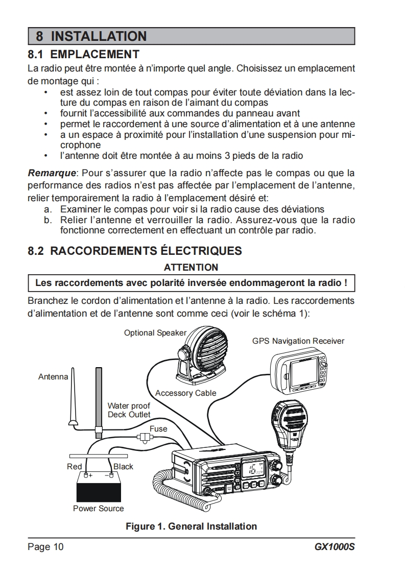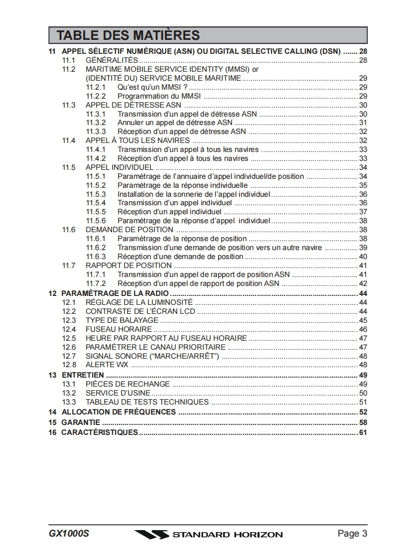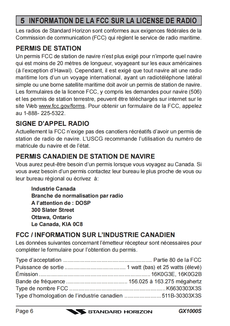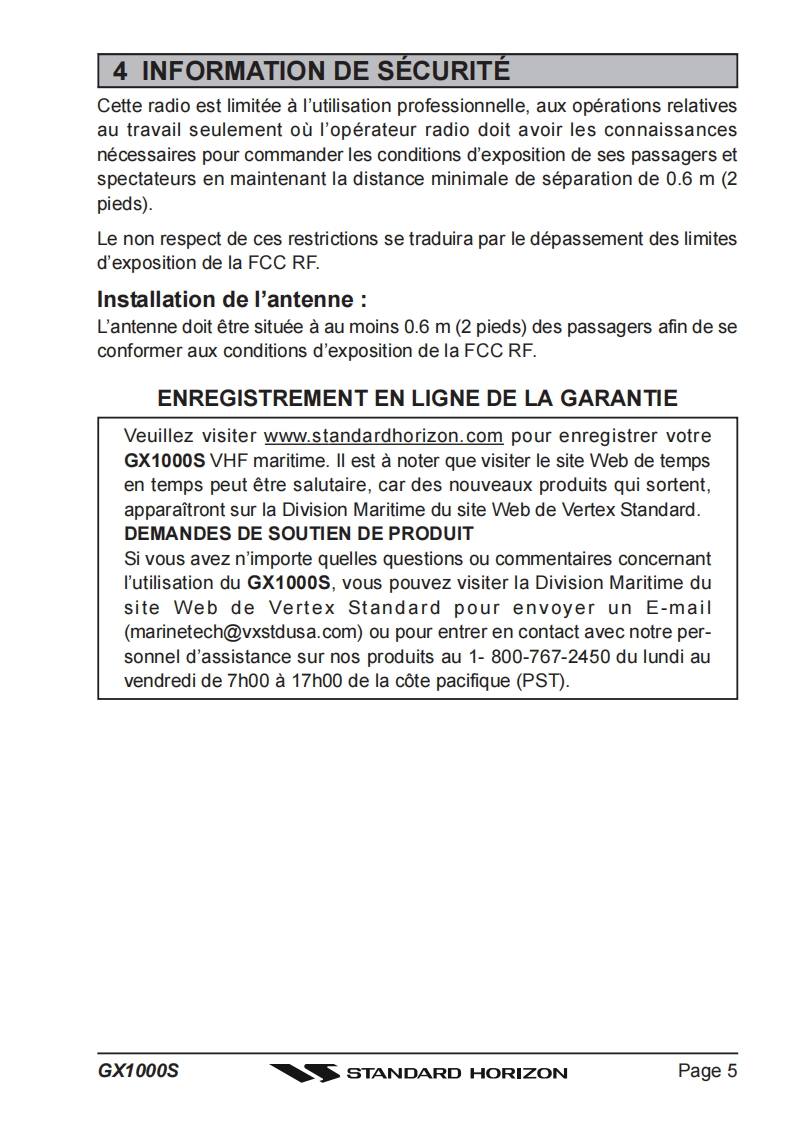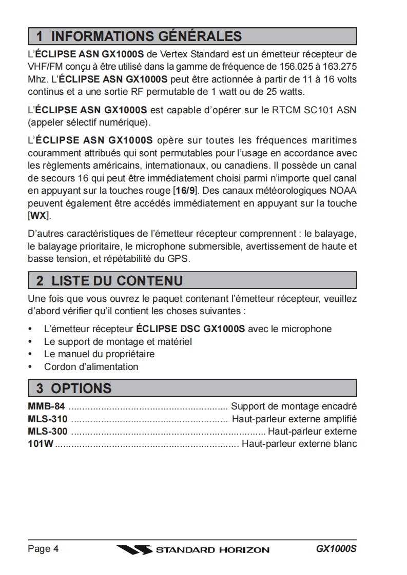 STANDARD HORIZONECLIPSE DSC GX1000S25 Watt VHF/FMEmetteur recepteur marin avec ASNLe manuel du proprietaireRadio VHF ultra compacte a montage fixe abordable●Panneau avant IPX7 submersibleSC-101 ASN (Appel Selectif Numerique)avec rapport et demande depositionLe balayage programmable,le balayage prioritaire,et Double VeilleChoix de noms de canaux ou LAT LON GPS affichees sur l'ecranOperation simple●Tous les canaux maritimes des Etats-Unis,internationaux et canadiens●Canaux meteorologiques de NOAA avec l'alerte de tempsUne fois attache au recepteur de GPS四ECLIPSE DSCs//L