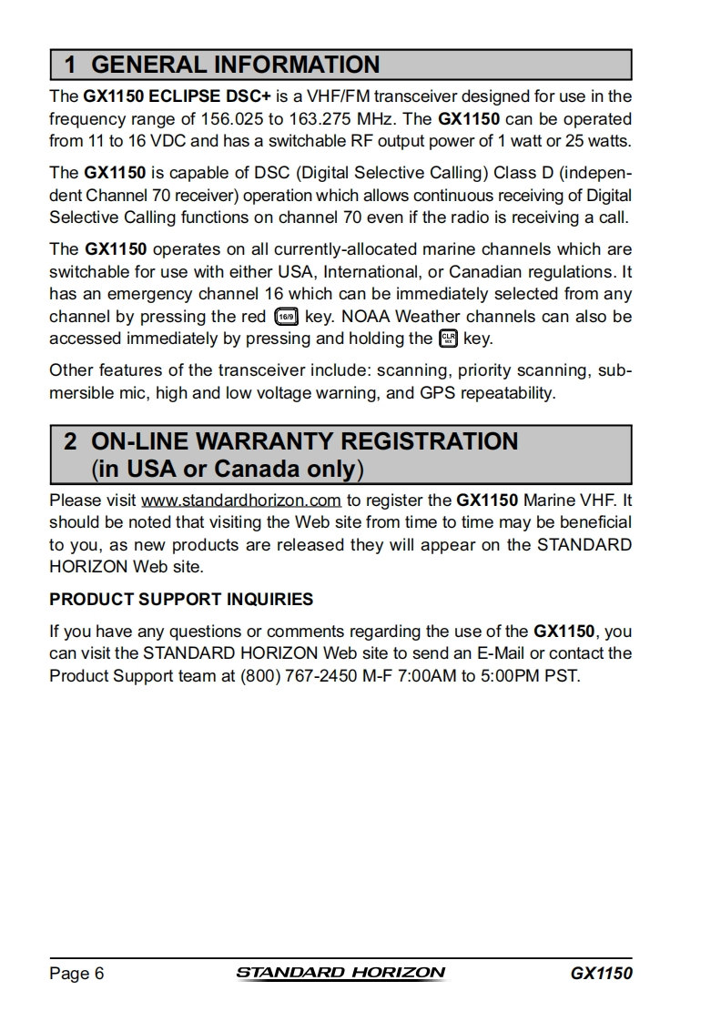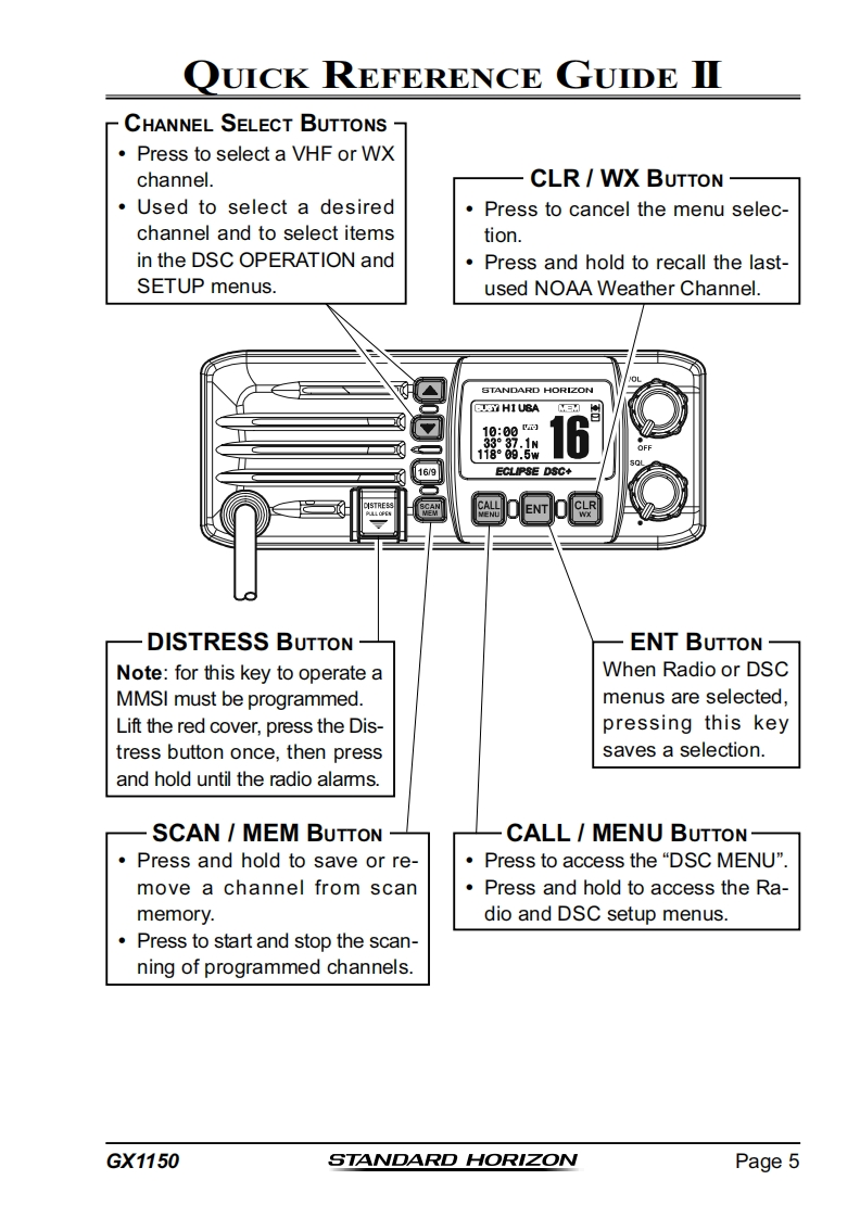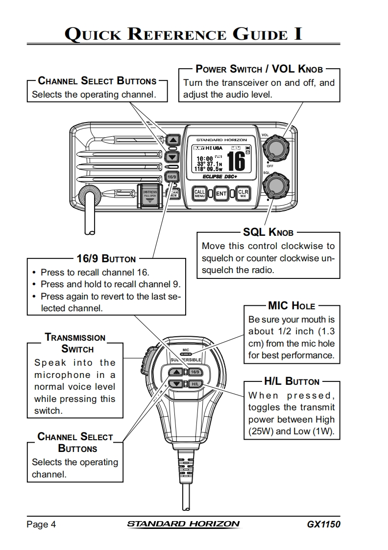 STANDARD HORIZONNothing takes to water like Standard HorizonECLIPSE DSC+GX115025 Watt VHF/FMClass D DSC Marine TransceiverOwner's Manual●Replaces older Eclipse+and Eclipse DSC ModelsMeets ITU-R M493-12 regulation●16/9,H/L and channel keys on the mic●DSC test call●Auto DSC channel change selectionFull dot matrix displaySubmersible JIS-7 /IPX7(3.3 feet for 30 minutes)NMEA 0183 Input and OutputTime and GPS position information shown on display*Programmable Scan,Priority Scan,and Dual WatchNOAA Weather Channels with AlertAll USA/Intemational and Canadian Marine Channels3 Year Waterproof Warranty米When GPS connectedCCLASE DSO16b四四四
