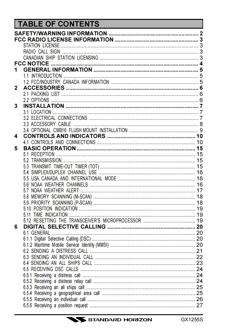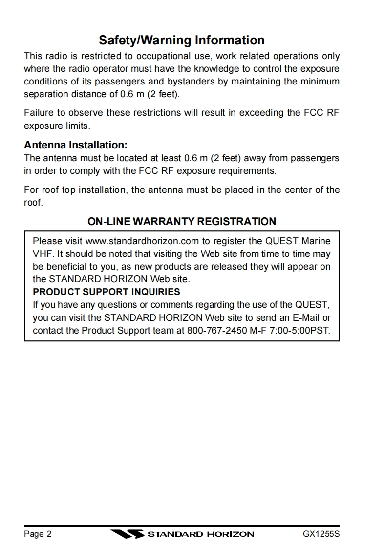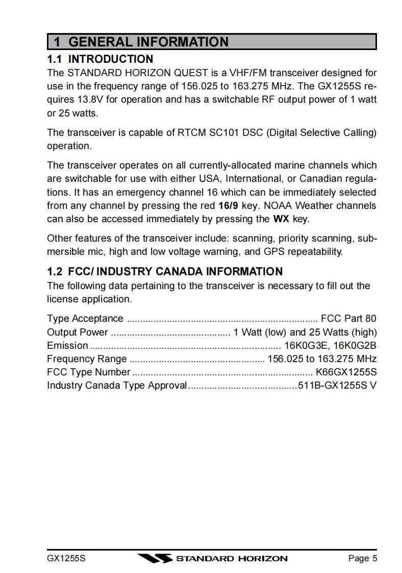 STANDARD HORIZONQUEST GX1255S25 Watt VHF/FMMarine TransceiverOwner's ManualRTCM SC-101 DSC Distress call with your exact posi-tion when connected to a GPSCompact and Simple Operation3 year waterproof warrantyBacklit Keypad and LCD displays latitude/longitudewhen connected to a GPSChannel Name,GPS Time or GPS Position Repeatingshown on the display●NOAA Weather AlertOne-button access to Channel 16 and 9Access to all US,Canadian and International ChannelsVersatile User-programmable Scan,Priority Scan andDual WatchMicrophone with Channel Slection.006國园品