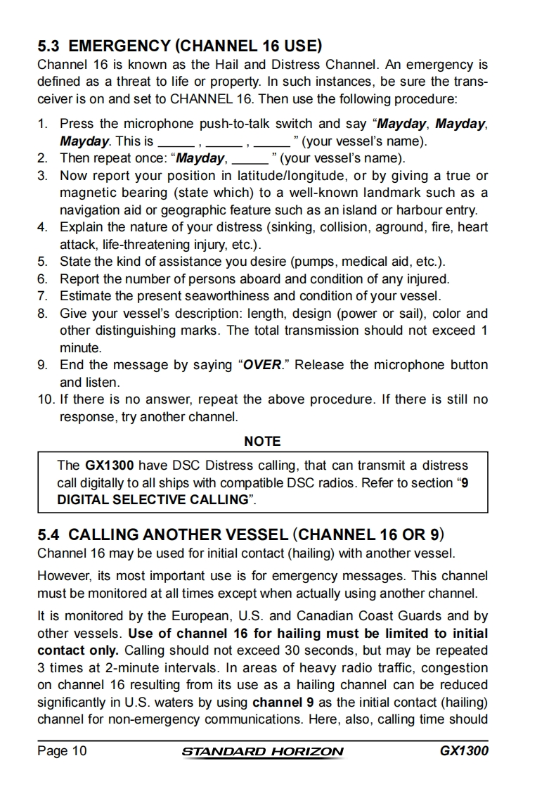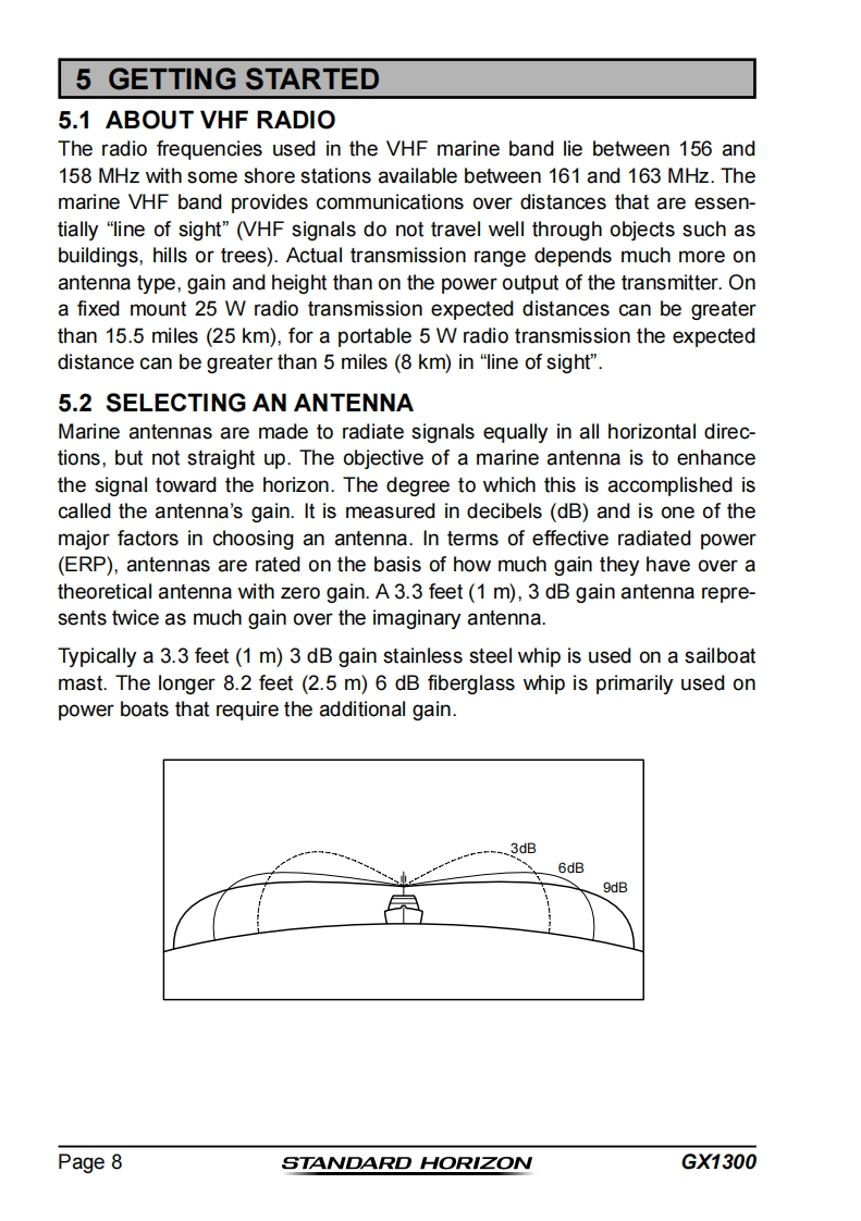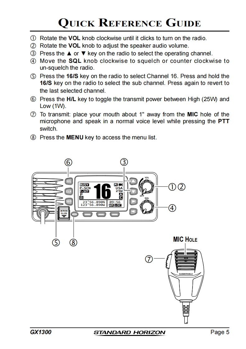 STANDARD HORIZONNothing takes to water like Standard HorizonECLIPSE GX130025 Watt VHF/FMClass D DSC Marine TransceiverOwner's ManualAffordable compact class D fixed mount VHF radio●Submersible IPX8 class (4.92 feet for 30 minutes)Meets ITU-R M493-13 class D DSC (Digital Selective Calling)Built in Separate Receiver for CH70(Receiving DSC Calls)Programmable soft keysEasy to Operate Icon/Menu System●Oversized Full dot matrix display (31 mm x 55 mm)GPS position and time shown*on a full dot matrix displayDSC distress,individual,group,all ships,position request,positionreport and DSC test callProgrammable scan,priority scan,and Multi Watch(Dual Watch orTriple Watch)NMEA in and output connections to a compatible GPS chart plotterAll USA/International and Canadian marine channelsPreset Key used to recall up to 10 favorite channels●Automaticarry poll the GPS position of up to 6 ships using DSC●NOAA weather channel selection with Weather AlertWhen GPS connected