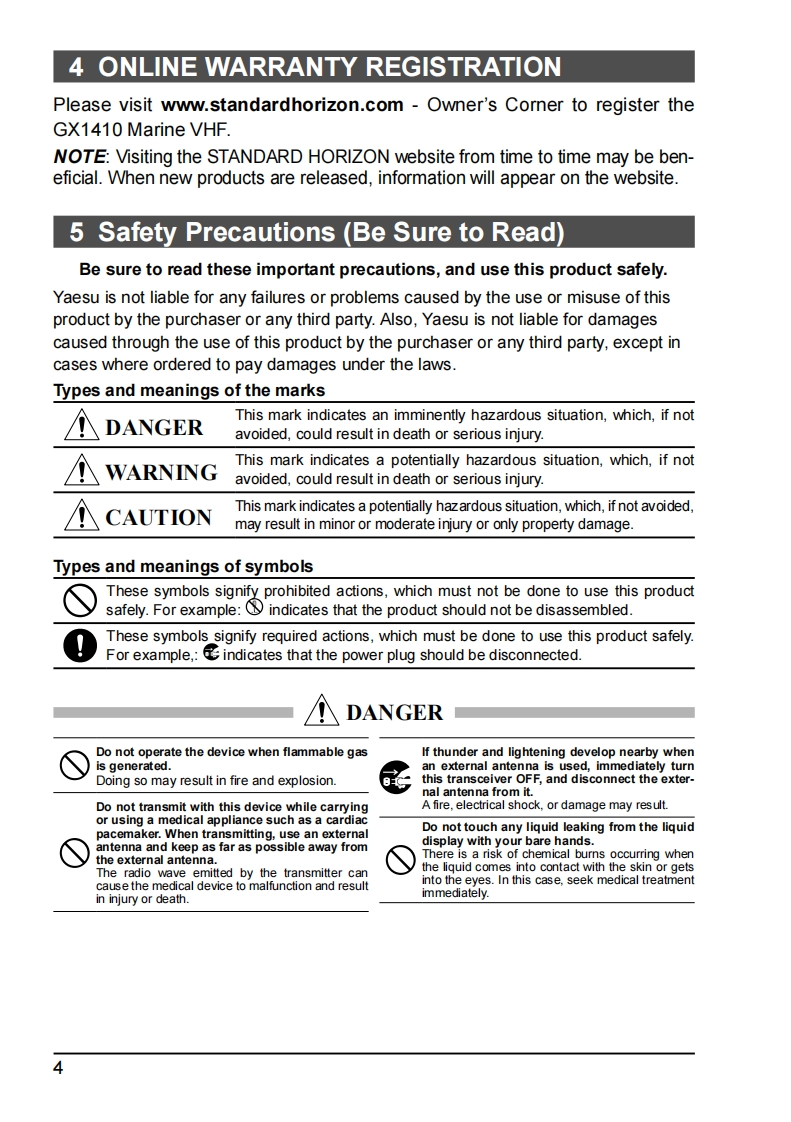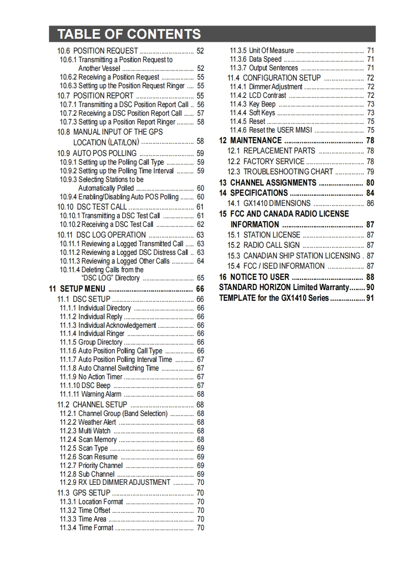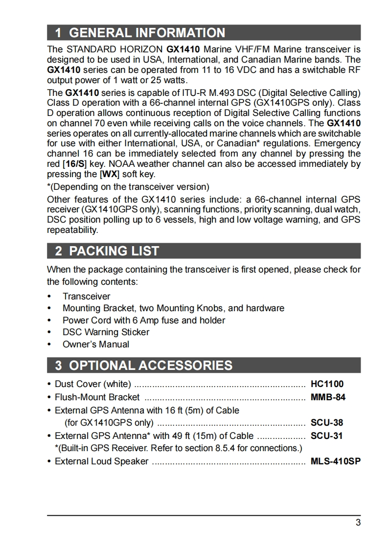 Owner's ManualECLIPSE GPSGX1410GPSECLIPSEGX1410Meets ITU-R M.493-16 class D DSC(Digital Selective Calling)Input and Output of GPS information to NMEA0183 compatible devicesIntegrated 66 Channel Internal GPS receiver(GX1410GPS only)Built in Separate Receiver for CH70(Receiving DSC Calls)Automatic DSC polling of up to 6 ships GPS positions*Auto DSC channel selection DSC test callDSC distress,individual,group,all ships,position request and position reportLarge Viewable Display,Easy to Mount,Submersible IPX8(5 feet or 1.5 m for 30 minutes)Noise canceling microphone with channel change,16/S and H/L key buttonsGPS position and time shown on a full dot matrix display*Preset Key used to recall up to 10 favorite channelsProgrammable scan,priority scan,and Multi Watch(Dual Watch or Triple Watch)Noise cancelling microphone with channel change selection,16/S and H/L keys"External GPS device required for GX1410.16移超题16超:刻离STANDARD HORIZONNothing takes to water like Standard Horizon
