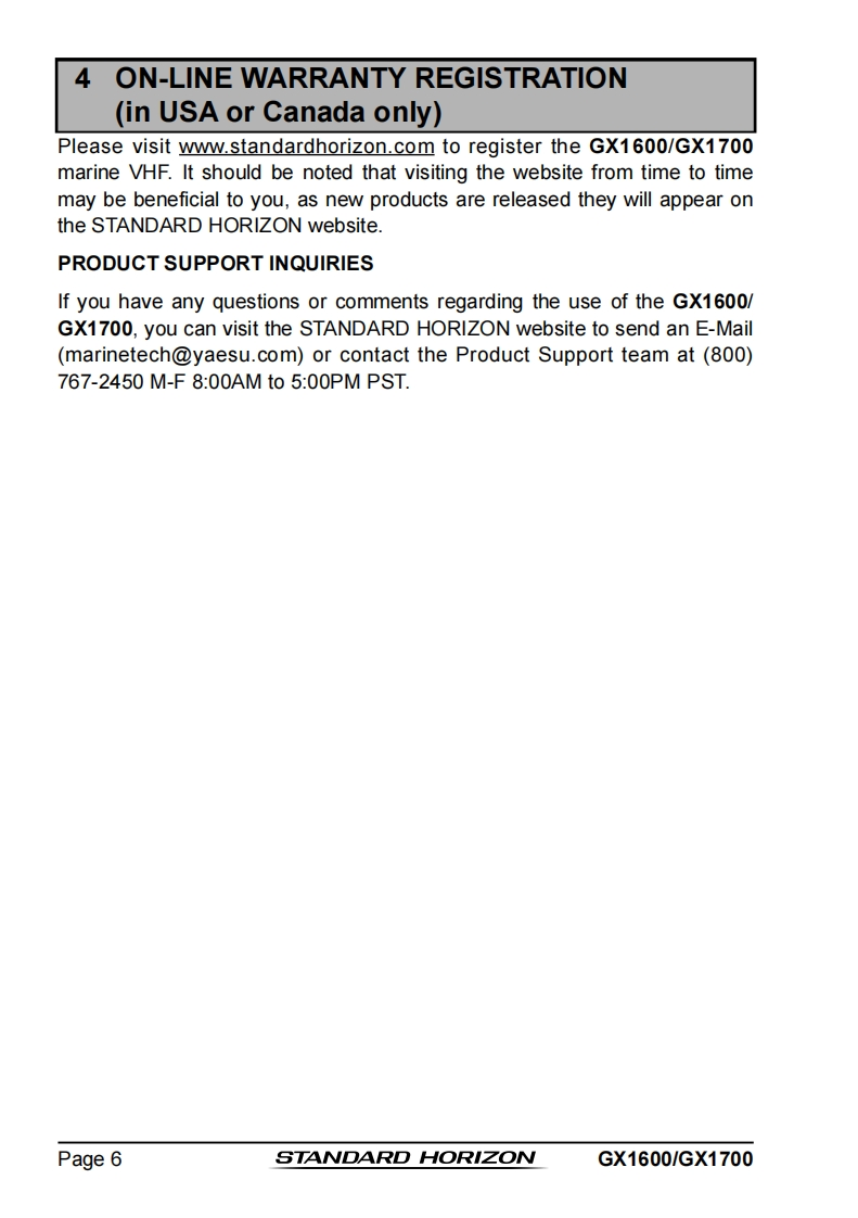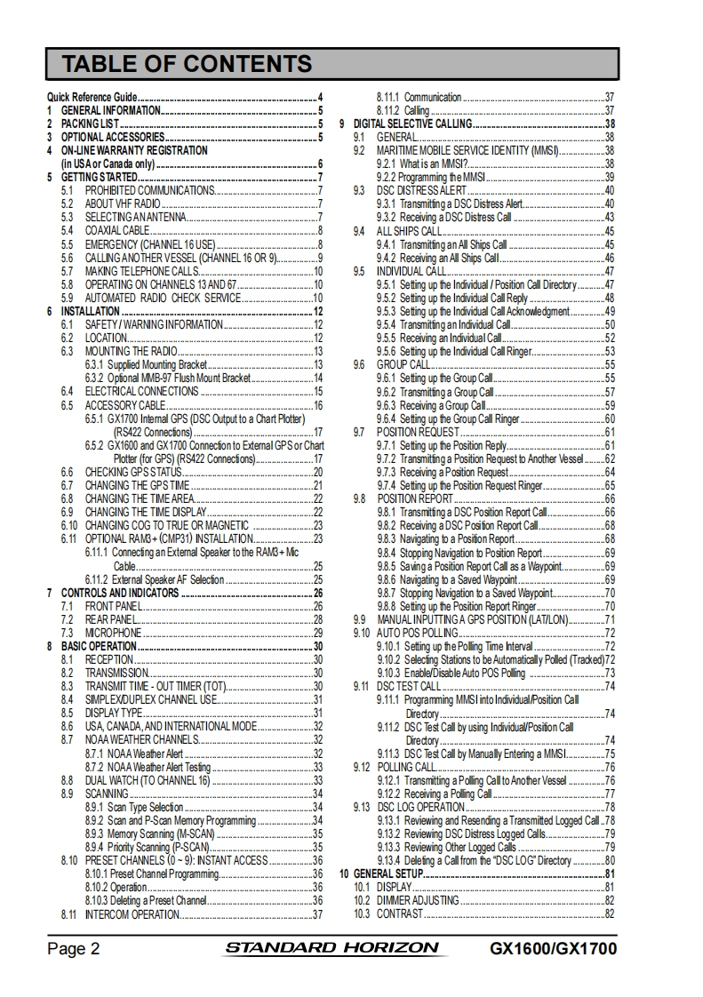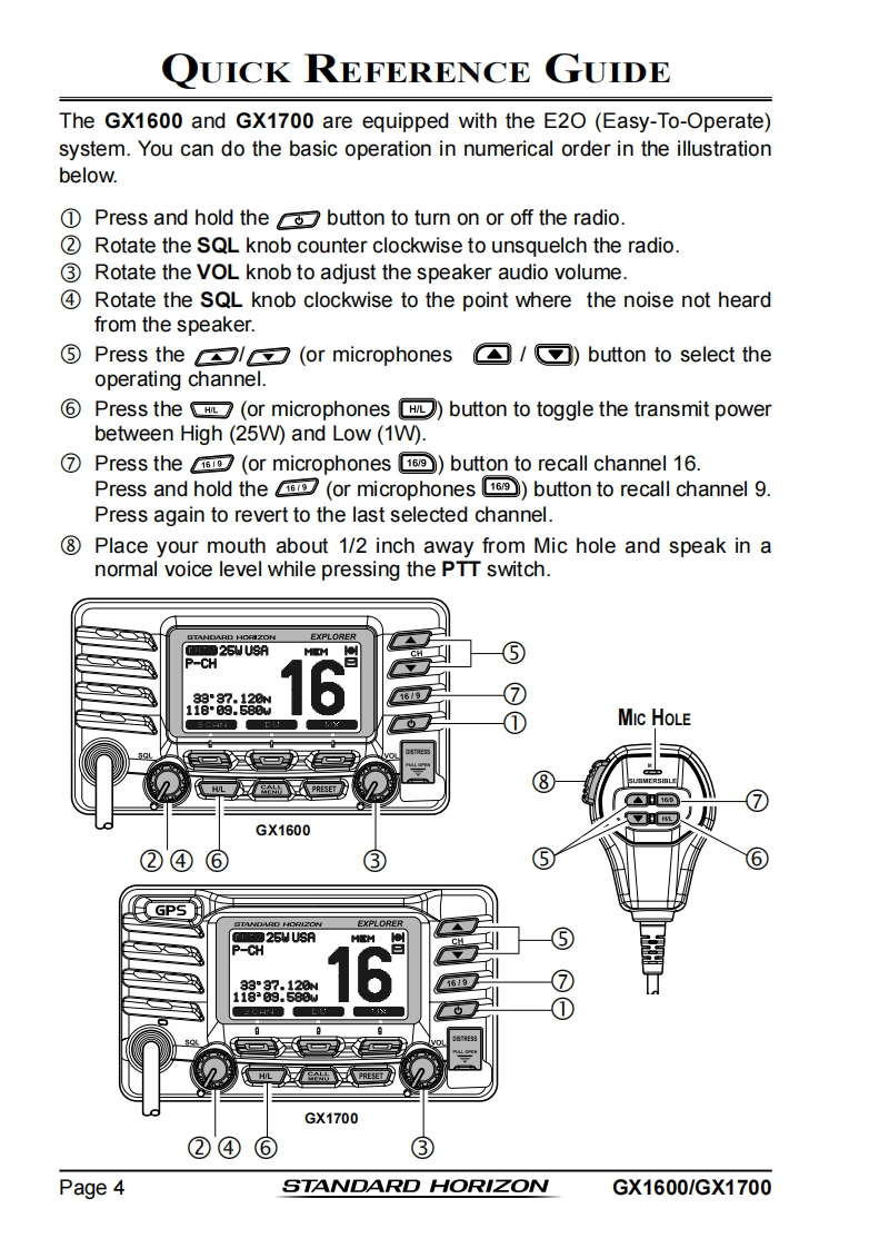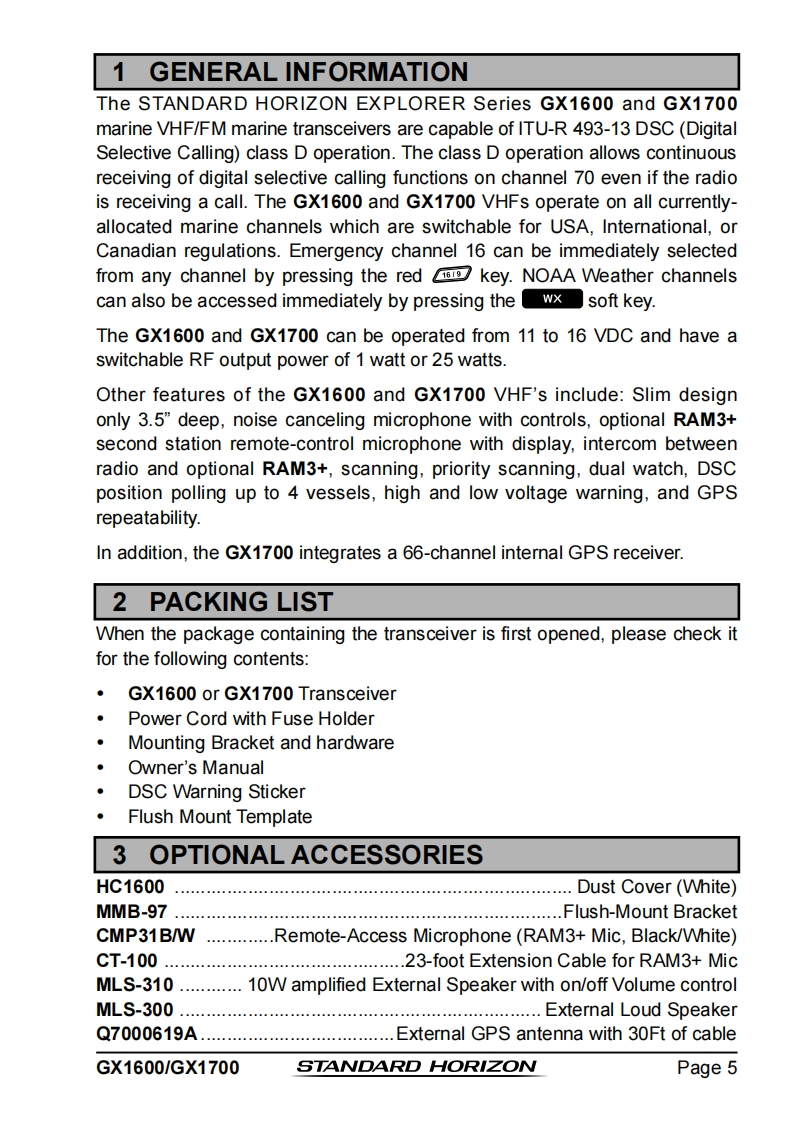 STANDARD HORIZONNothing takes to water like Standard HorizonEXPLORER SERIESGX1600 and GX170025 Watt VHF/FMMarine TransceiverOwner's ManualUltra thin and compact rear case design(3.5"depth)Meets ITU-R M493-13 Class D DSC(Digital Selective Calling)Integrated 66 Channel WAAS GPS receiver(GX1700)GPS antenna built-in to the front panel allows reception when bracket or flush mounted(GX1700)Navigation to a DSC Distress Call with compass pageDSC test call and Auto DSC channel change selectionAutomatically poll the GPS position of up to 4 ships using DSC●Enter,Save,and Navigation to a waypoint with Compass pageNavigation (LATLON,SOG,and COG)information shown on displaySubmersible JIS-8 class 1.5M (4.92Ft)for 30 minutesNoise canceling microphone with channel selection,16/9 and H/L keys●NOAAweather channel selection with alertProgrammable Scan,Priority Scan,and Dual WatchPreset key stores up to 10 favorite channels,with scan functionOversized dot matrix display with customizable channel names and GPS Compass displayNMEA Input and Output of GPS information to other NMEA compatible devicesProgrammable soft keysCapable of connecting to a Second Station Remote-Access Microphone CMP31●Die-cast chassis●Dimensions:5.9"Wx 3.4"Hx 3.6"DFlush mount cutout:5.4"Wx 2.8"H x 2.6"D3 Year Waterproof WarrantyWhen connected to an optional GPS for GX1600EXPLORER GPS GX1700