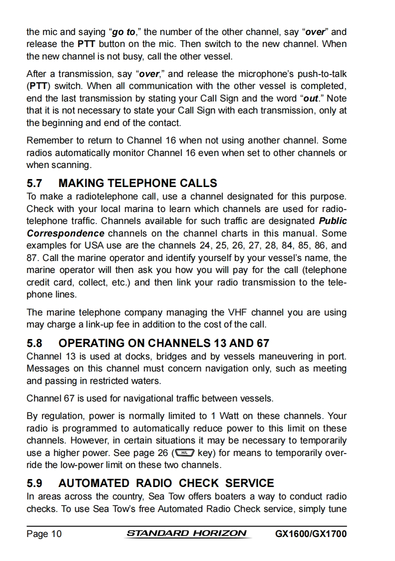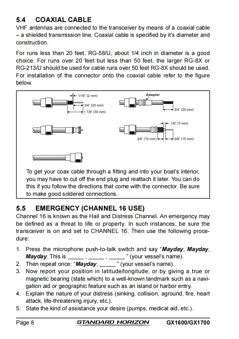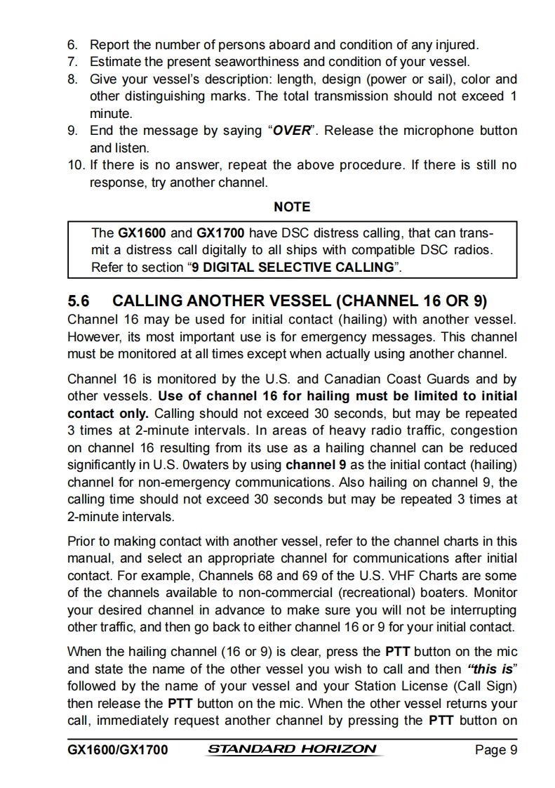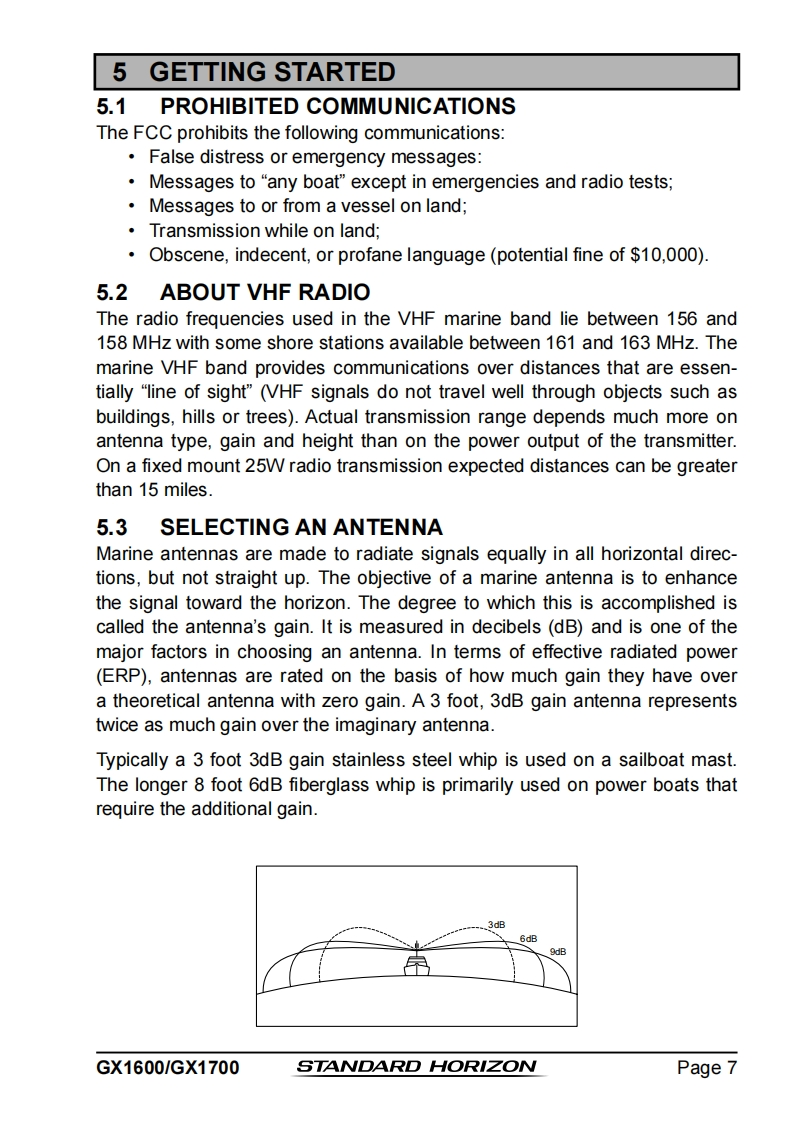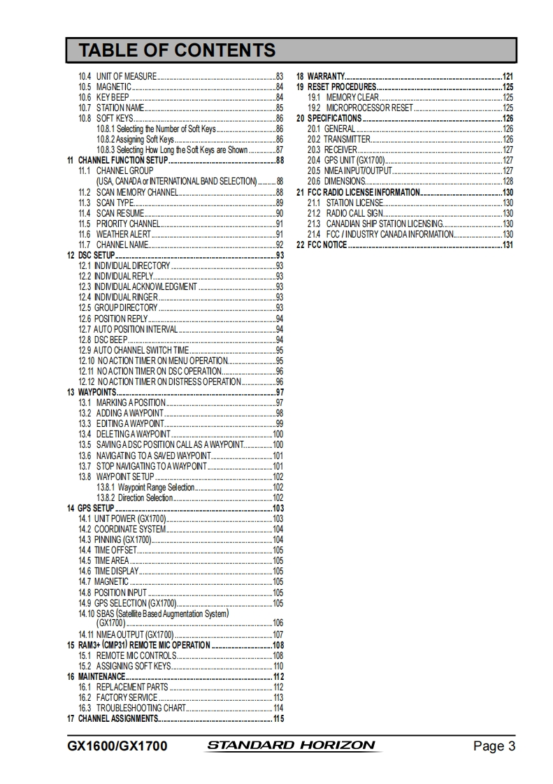 STANDARD HORIZONNothing takes to water like Standard HorizonEXPLORER SERIESGX1600 and GX170025 Watt VHF/FMMarine TransceiverOwner's ManualUltra thin and compact rear case design(3.5"depth)Meets ITU-R M493-13 Class D DSC(Digital Selective Calling)Integrated 66 Channel WAAS GPS receiver(GX1700)GPS antenna built-in to the front panel allows reception when bracket or flush mounted(GX1700)Navigation to a DSC Distress Call with compass pageDSC test call and Auto DSC channel change selectionAutomatically poll the GPS position of up to 4 ships using DSC●Enter,Save,and Navigation to a waypoint with Compass pageNavigation (LATLON,SOG,and COG)information shown on displaySubmersible JIS-8 class 1.5M (4.92Ft)for 30 minutesNoise canceling microphone with channel selection,16/9 and H/L keys●NOAAweather channel selection with alertProgrammable Scan,Priority Scan,and Dual WatchPreset key stores up to 10 favorite channels,with scan functionOversized dot matrix display with customizable channel names and GPS Compass displayNMEA Input and Output of GPS information to other NMEA compatible devicesProgrammable soft keysCapable of connecting to a Second Station Remote-Access Microphone CMP31●Die-cast chassis●Dimensions:5.9"Wx 3.4"Hx 3.6"DFlush mount cutout:5.4"Wx 2.8"H x 2.6"D3 Year Waterproof WarrantyWhen connected to an optional GPS for GX1600EXPLORER GPS GX1700