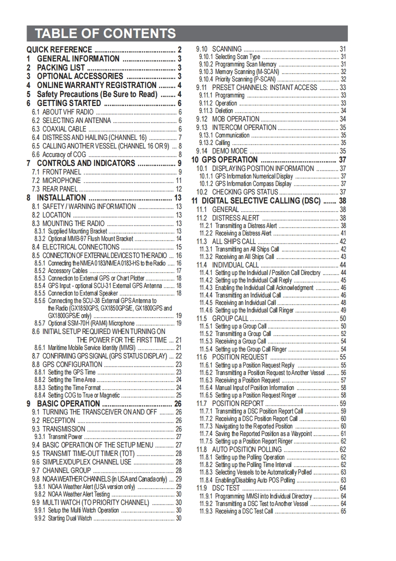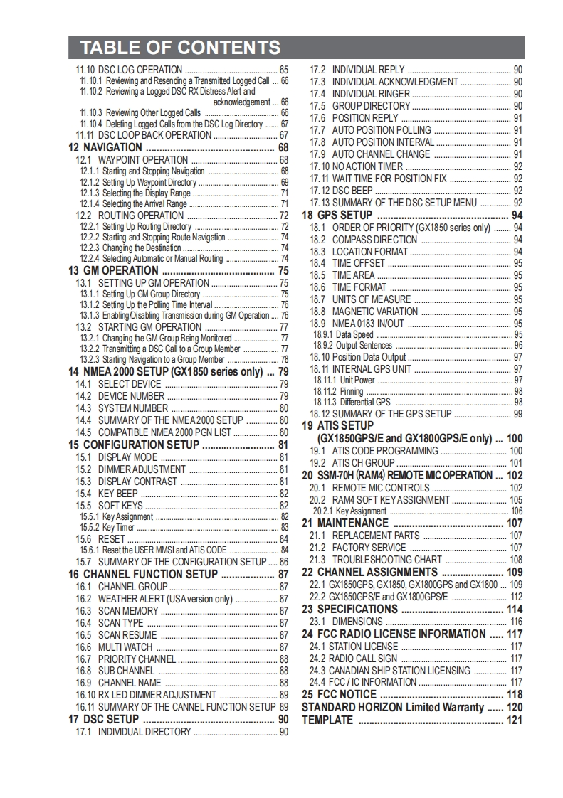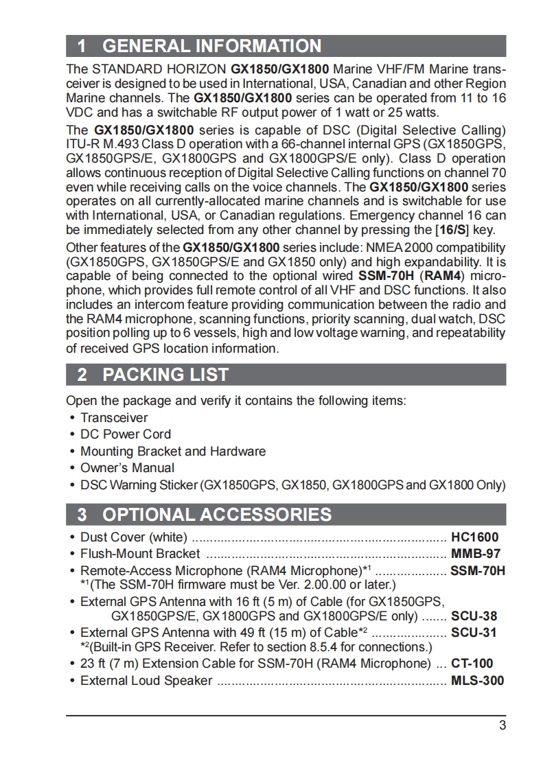 Owner's ManualEXPLORER NMEA2000 GPSGX1850GPS GX1850GPS/E(European Version)EXPLORER NMEA2000GX1850EXPLORER GPSGX1800GPSGX1800GPS/E(European Version)EXPLORERGX1800International ITU-R M.493-13 Class D DSC (Digital Selective Calling)(European Version:Meets ITU-R M.493-14)NMEA 2000 Compatible (GX1850GPS,GX1850GPS/E and GX1850 only)Input and Output of GPS information to NMEA0183 compatible devicesIntegrated 66 Channel Internal GPS receiver (GX1850GPS,GX1850GPS/E,GX1800GPS and GX1800GPS/E only)Automatic DSC polling of up to 6 ships GPS positions*Auto DSC channel selection DSC test callGPS Compass Page*,Enter and Save Waypoints*,Navigate Routes to Locations*Automatic Distress Messaging*,MOB Report Location*,MOB Location Navigation*Large Viewable Display,Easy to Mount,Submersible IPX8(5 feet or 1.5 m for 30 minutes)Noise canceling microphone with channel change,16/S and H/L key buttonsSSM-70H Remote-Access RAM4 Microphone Second Station IntercomATIS Mode for European Inland Waterways(GX1850GPS/E and GX1800GPS/E only)"Extemal GPS device required for GX1850 and GX1800.6°四国16需田0▣▣▣a回四丽STANDARD HORIZONNothing takes to water like Standard Horizon