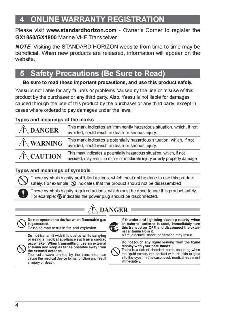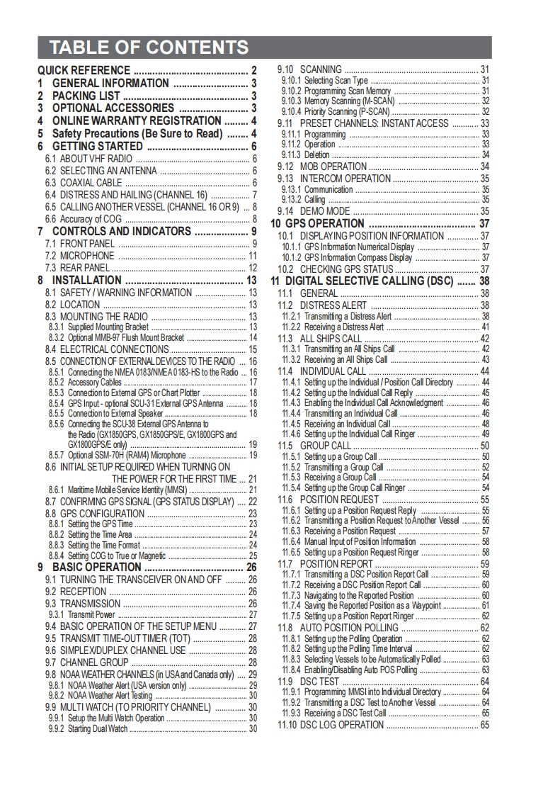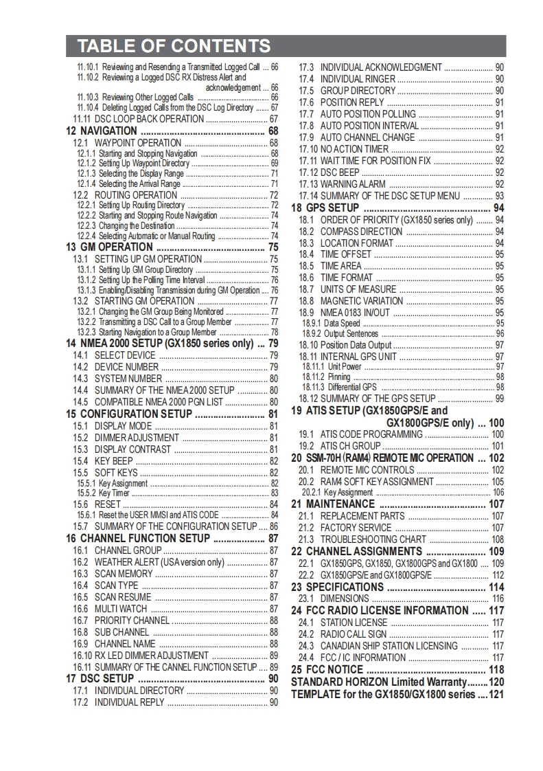 Owner's ManualEXPLORER NMEA2000 GPSGX1850GPS GX1850GPS/E(European Version)EXPLORER NMEA2000GX1850EXPLORER GPSGX1800GPSGX1800GPS/E(European Version)EXPLORERGX1800International ITU-R M.493-13 Class D DSC (Digital Selective Calling)(European Version:Meets ITU-R M.493-14)NMEA 2000 Compatible (GX1850GPS,GX1850GPS/E and GX1850 only)Input and Output of GPS information to NMEA0183 compatible devicesIntegrated 66 Channel Internal GPS receiver (GX1850GPS,GX1850GPS/E,GX1800GPS and GX1800GPS/E only)Automatic DSC polling of up to 6 ships GPS positions*Auto DSC channel selection DSC test callGPS Compass Page*,Enter and Save Waypoints*,Navigate Routes to Locations*Automatic Distress Messaging*,MOB Report Location*,MOB Location Navigation*Large Viewable Display,Easy to Mount,Submersible IPX8(5 feet or 1.5 m for 30 minutes)Noise canceling microphone with channel change,16/S and H/L key buttonsSSM-70H Remote-Access RAM4 Microphone Second Station IntercomATIS Mode for European Inland Waterways(GX1850GPS/E and GX1800GPS/E only)"Extemal GPS device required for GX1850 and GX1800.6°四国16需田0▣▣▣a回四丽STANDARD HORIZONNothing takes to water like Standard Horizon