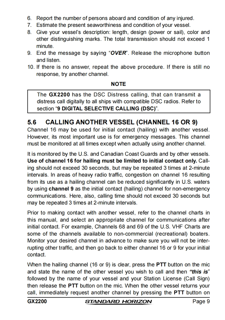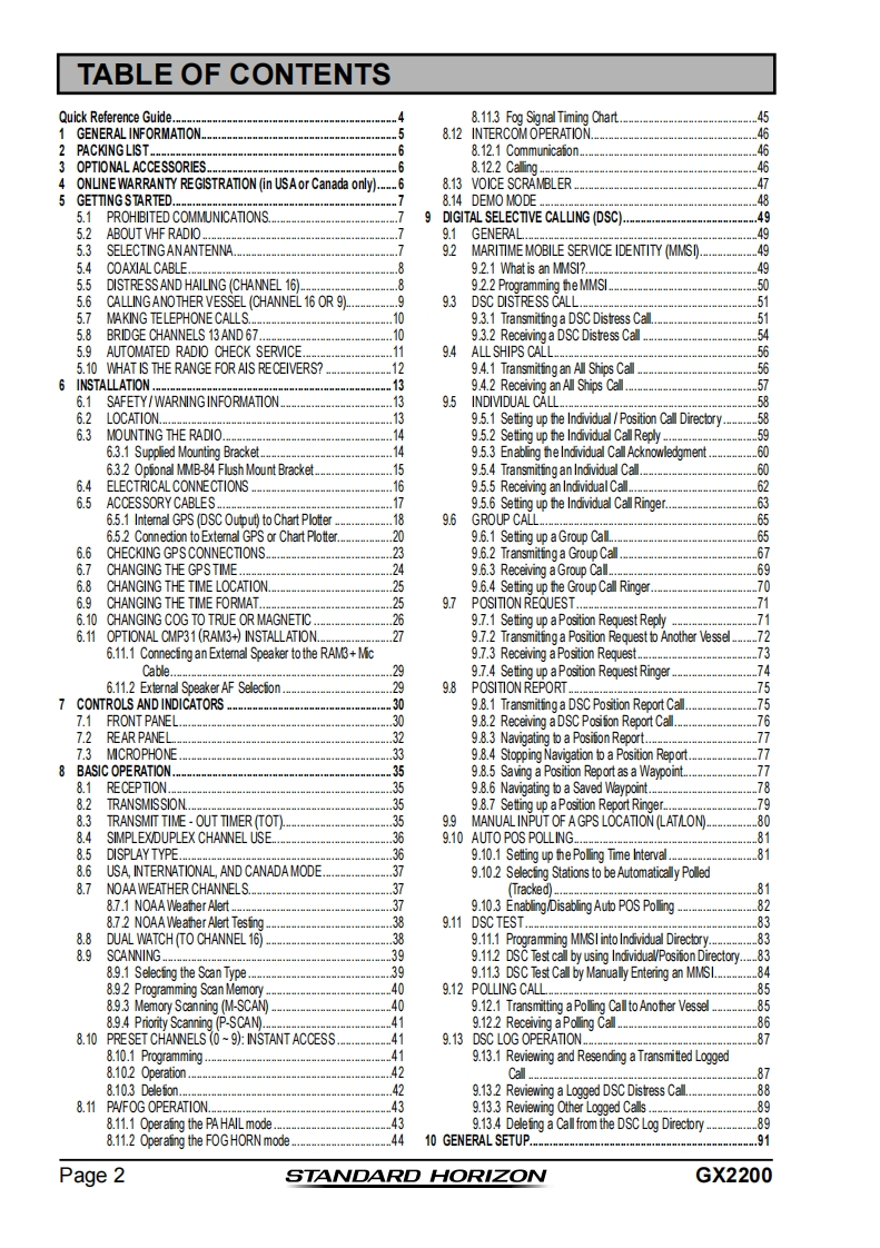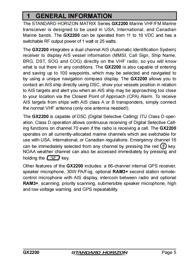 STANDARD HORIZONNothing takes to water like Standard HorizonMATRIX AIS/GPSGX220025 Watt VHF/FMMarine TransceiversOwner's ManualIntegrated 66 Channel GPS antennaIntegrated dual channel AIS (Automatic ldentification System)receiver●AIS /AIS SART target display:MMSI,Call Sign,Ship Name,BRG,DST,SOG and COG4800 or 38400 NMEA baud rate selection,for plotters with 1 NMEAportTrue and Magnetic bearing selection on AIS displayContact Class Aor BAIS Ship with DSCProgrammable CPAor TCPA collision avoidance alamsMeets ITU-R M493-13 Class D DSC (Digital Selective Calling)●Submersible IPX7(3.3 feet or 1 meter for 30 minutes)front panel80dB Commercial grade receiverDSC position request and report functions30 Watt PA/Loud Hailer with preprogrammed fog signals and listen backClearVoice noise canceling speaker microphone with channel selection and 16/9 keyGPS Compass,Waypoint and GPS status pages●Navigation (LAT/LON,Time,SOG and COG)information shown on displayEnter,Save and Navigate to waypoints with Compass pageE20 (Easy-To-Operate)menu systemUser customizable soft keys for easy menu operationVersatile user-programmable scanning,priority scan and Dual WatchOversized rotary channel knob with push to enter,backlit display and keysLocal/Distance attenuatorOptional connection for RAM3+second station remote microphone with AlS displayIntercom between radio and RAM3+Voice Scrambler (optional)
