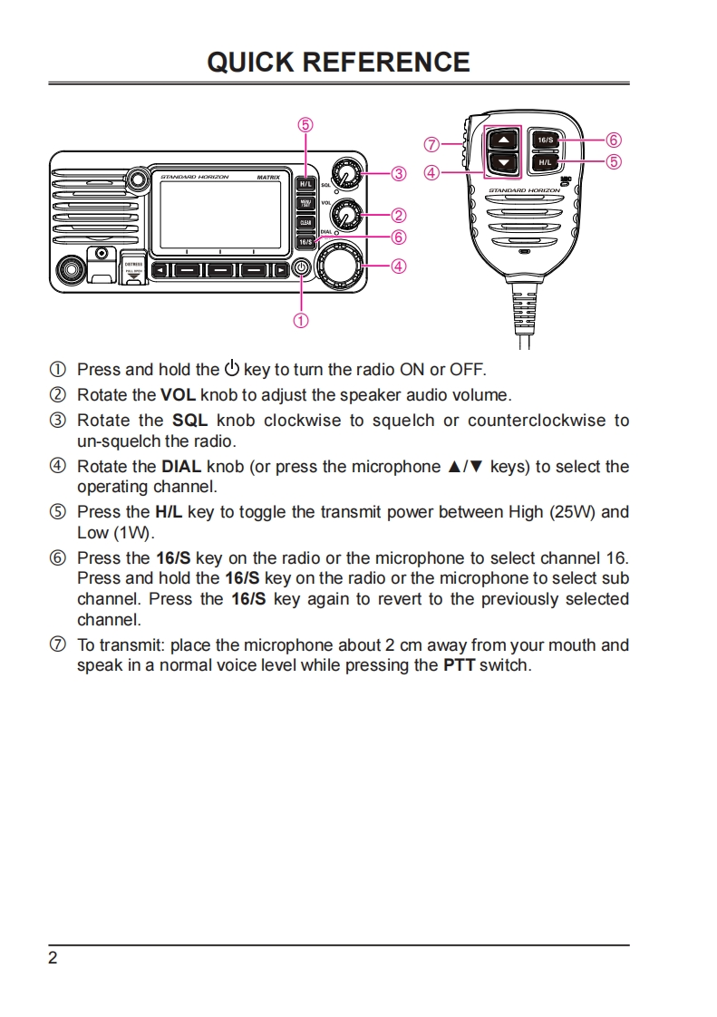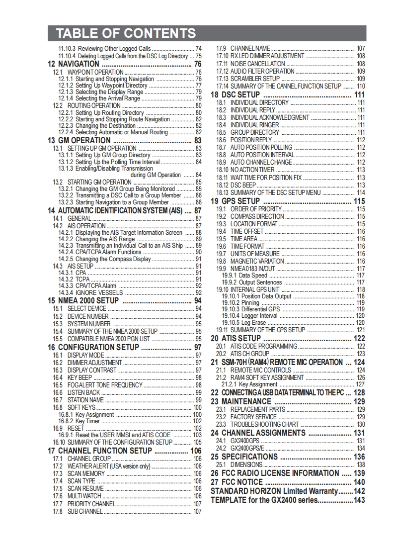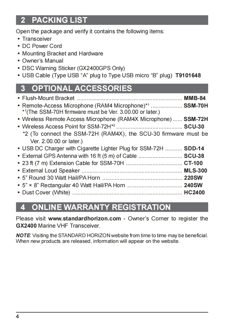Owner's ManualMATRIX NMEA2000 GPSGX2400GPSGX2400GPS/E (European Version)International ITU-R M.493-15 Class D DSC(Digital Selective Calling)Integrated dual channel AlS (Automatic Identification System)receiverAIS/AIS SARTtarget display:MMSI,Call Sign,Ship Name,BRG,DST,SOG and COGNMEA 2000 and NMEA0183 CompatibleIntegrated 66 Channel Internal GPS receiverContact Class A or B AIS Ship with DSCProgrammable CPA or TCPA collision avoidance alarmsSubmersible IPX8(1.5 meter for 30 minutes)80dB Commercial grade receiverDSC position request and report functionsGM(Group Monitor)using DSC Group Position CallingNavigation (LAT/LON,SOG and COG)information shown on displayMOB (Man Over-Board)OperationVersatile user-programmable scanning,priority scan and Dual/Triple WatchIntegrated 32 Code Voice Scrambler and 4 Code Voice Scrambler30 Watt PA/Loud Hailer with preprogrammed fog signals and listen backNoise canceling for both transmit and receive audioSecond Station Remote Microphone*Intercom Feature between Radio and Second Station Remote Microphone*ATIS Mode for European Inland Waterways(GX2400GPS/E only)*(Optional SSM-70H (RAM4)or SSM-72H (RAM4X)required)STANDARD HORIZONNothing takes to water like Standard Horizon