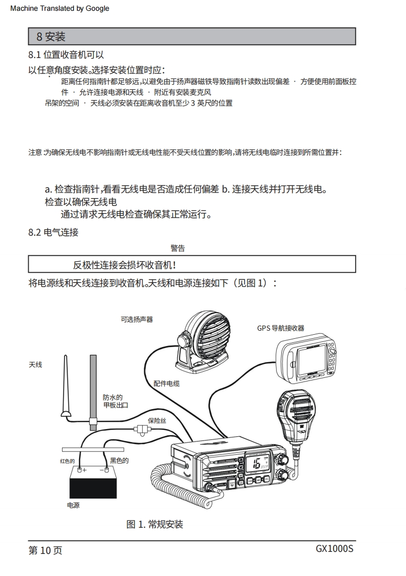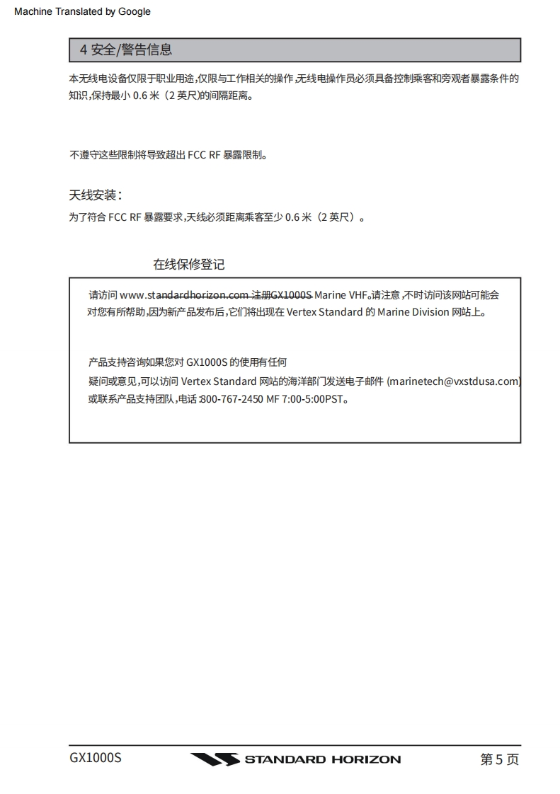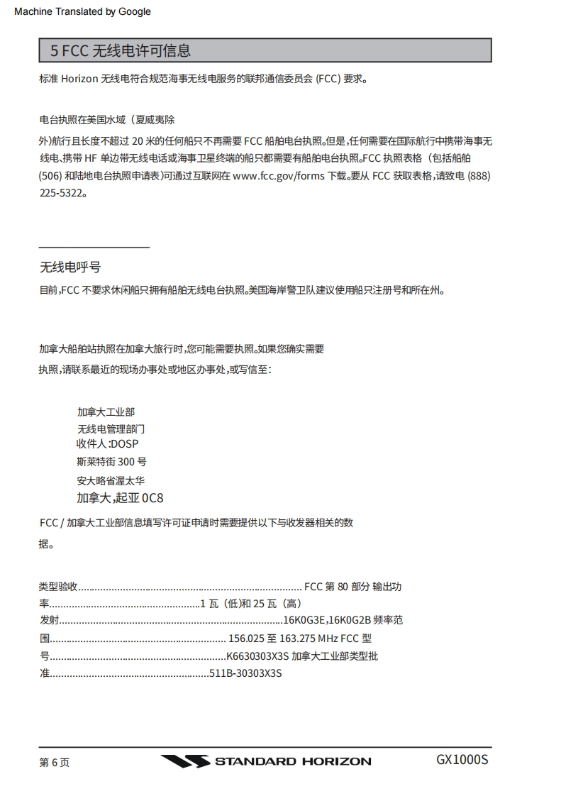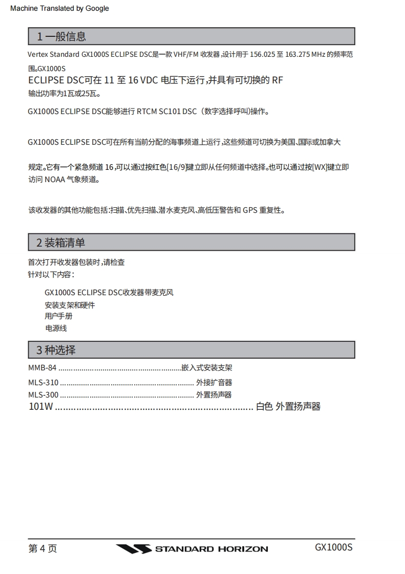 Machine Translated by GoogleSTANDARD HORIZONECLIPSE DSC GX1000S25瓦甚高频/调频DSC船用收发器用户手册经济实惠的超紧凑型固定安装甚高频无线电潜水IPX7前面板带位置报告和请求的SC-101DSC(数字选择性呼叫)可编程扫描、优先扫描和双守望显示屏上显示可选通道名称或GPS纬度/经度操作简单所有美国/国际和加拿大海事频道带有天气警报的NOAA天气频道连接至GPS接收器时ANOARD HORIZONMEMECLAPSE DSCGX1000S第1页
