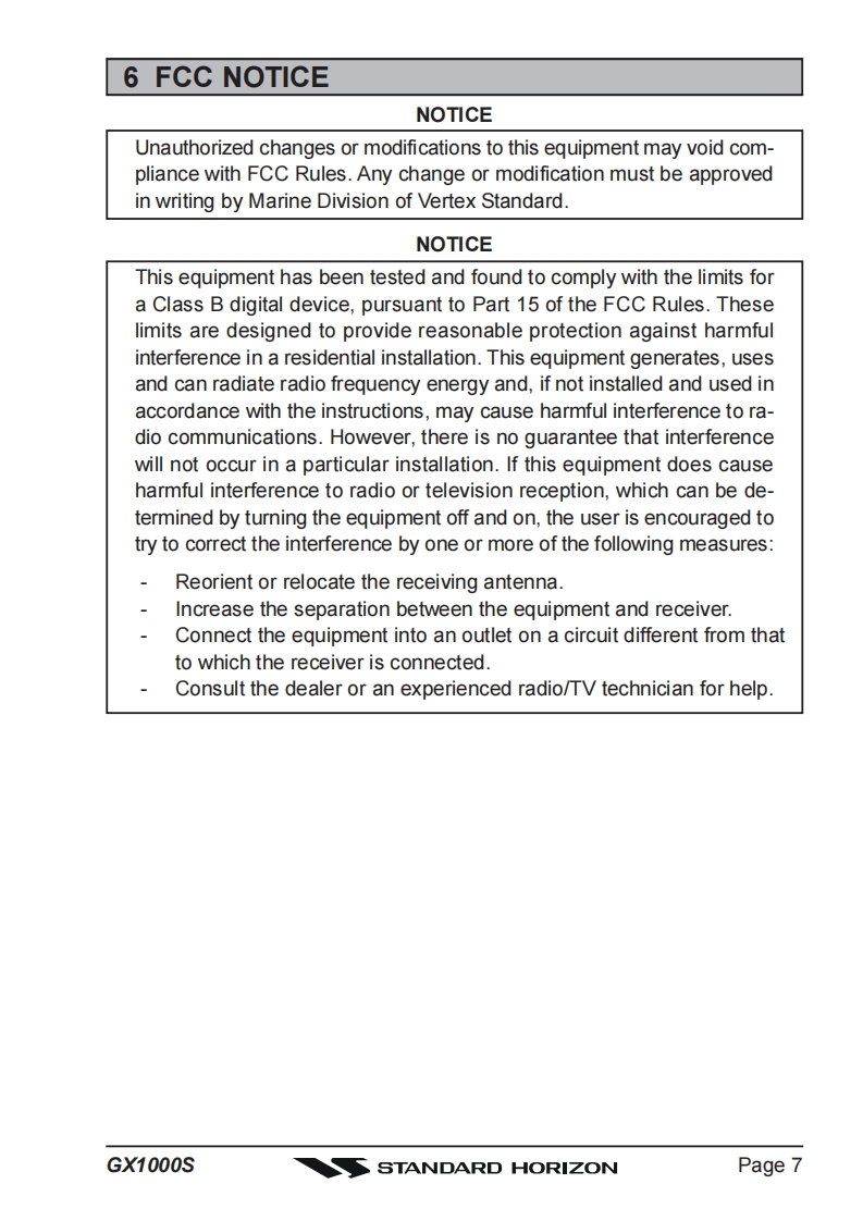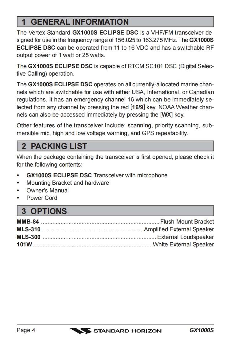 STANDARD HORIZONECLIPSE DSC GX1000S25 Watt VHF/FMDSC Marine TransceiverOwner's ManualAffordable Ultra Compact Fixed Mount VHF radioSubmersible IPX7 Front Panel●SC-101 DSC(Digital Selective Calling)with Position Report and Request●Programmable Scan,Priority Scan,and Dual Watch●Selectable Channel Names or GPS LAT LON shown*on display●Simple OperationAll USA/International and Canadian Marine ChannelsNOAA Weather Channels with Weather AlertX When Attached to GPS Receiver四ECLIPSE DSCs//L