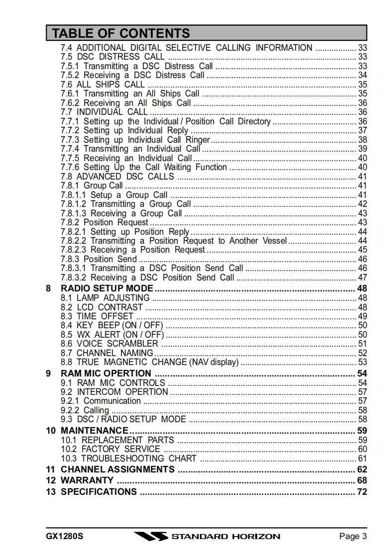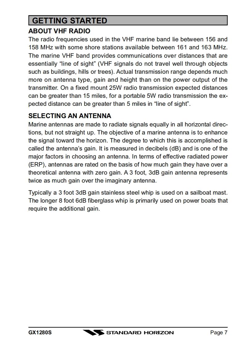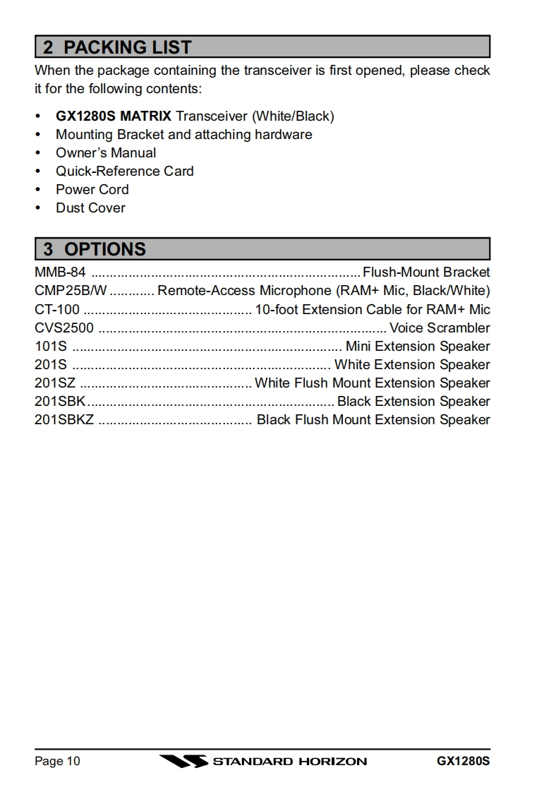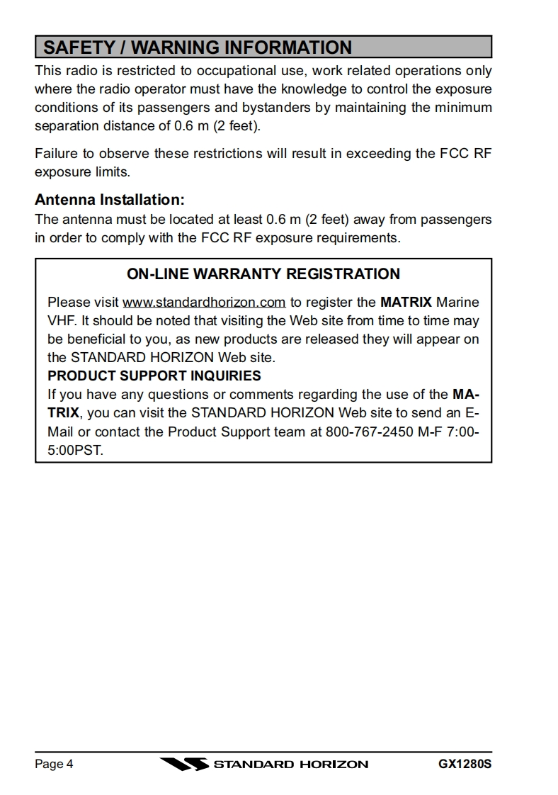 STANDARD HORIZONMATRIX GX1280S25 Watt VHF/FMMarine TransceiverOwner's Manual●SubmersibleDSC distress call automatically broadcasts lat/long and vessel ID*DSC position request function and NMEA data input/outputLatitude/Longitude and SOG/COG display*Channel name capabilityOptional RAM+second station remote microphoneVersatile user-programmable Scanning,Priority Scan and Dual Watch●NOAA Weather AlertOne-button access to Channel 16 and 9Access to all US,Canadian and International channelsBig,back-lit display and keyswith GPS attached○SUBMERS制BLEDISTRESSSCAN DA