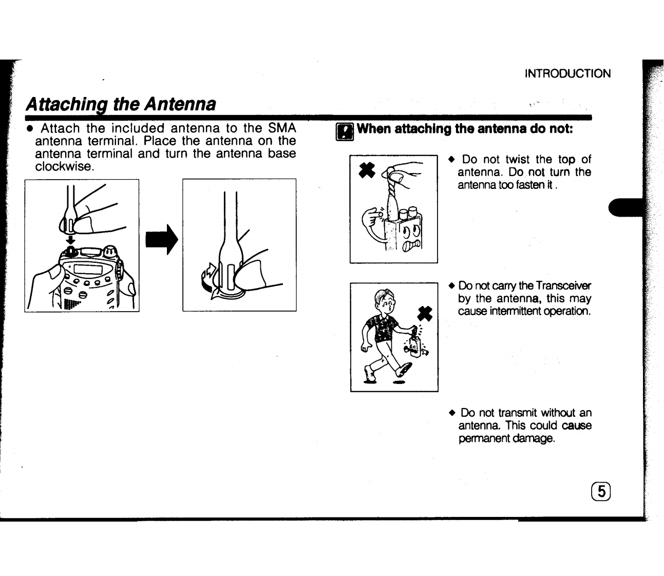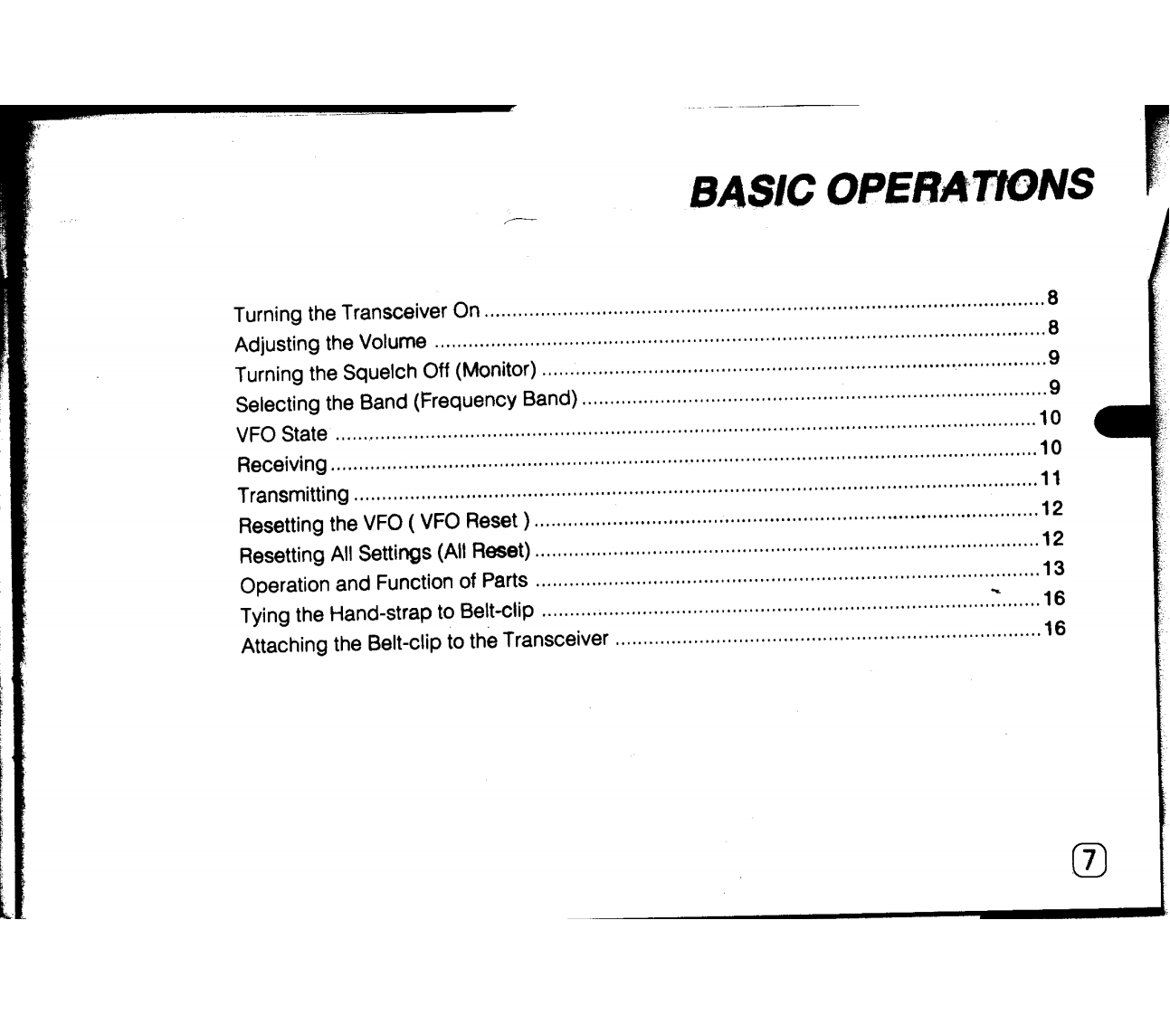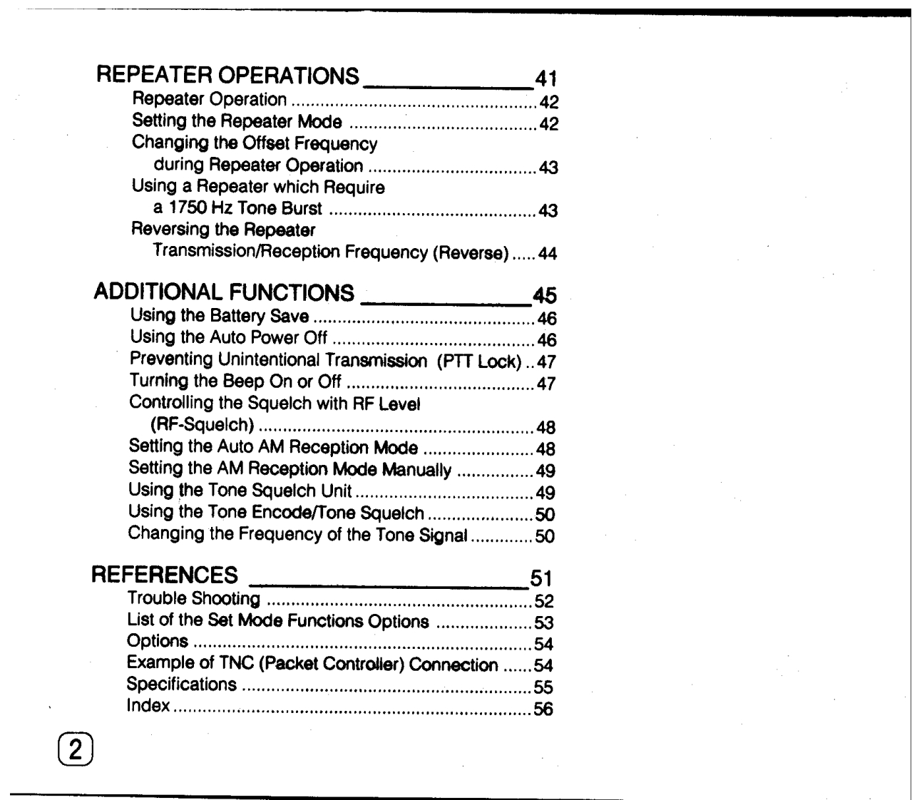 Table of ContentsINTRODUCTION3Precautions....................4Using the Selector in Frequency Lock Mode ............21Attaching the Antenna.......5Using the Selector beyond Band LimitsBattery Insertion and Removal6(Band Setting)..22Changing the Set Mode Function (My Key)..............22BASIC OPERATIONS7Quick Recall of Often Used Set Menus23Turning the Transceiver On .................8Lighting the Display Lamp ........23Adjusting the Volume……8Turning the Squelch Off (Monitor).............................9MEMORY FUNCTIONS25Selecting the Band (Frequency Band)........................9The Memory Function .............................…26VFO State….10Storing the Memory...........................26Receiving.…10Recalling the Memory.................2Transmitting...............11Changing the Memory.….27Resetting the VFO VFO Reset ).....12Erasing the Memory .........Resetting All Settings (All Reset).............2812Storing Various Modes in a Memory.28Operation and Function of Parts .............13Setting the Split Memory ............29Tying the Hand-strap to Belt-clip…16Displaying the Memory Address.30Attaching the Belt-clip to the Transceiver .................16SCAN31ADVANCED OPERATION17Scan Function.…32Changing the Frequency Step .................18Changing the Scan Type......................................33Changing the Frequency in 1 MHz,100 kHzScan within 1 MHz (1 MHz Scan).............................33or 10 MHz Steps..............18Scan the Entire Band Width (All Scan)......................34Using the CALL Frequency ..........................19Scan a Specific Range (Program Scan)........34Changing the CALL Frequency (1)....................19Scan Frequencies in Memory (Memory Scan)...........36Changing the CALL Frequency (2)..........20Scan Specific Memory FrequenciesStoring Associated Data with the CALL Frequency ..20(Memory Scan Memory)...............................37Using the Frequency Lock ........................................21Scan a Block(Block Memory Scan).….38Scan the Tone Frequency(Tone Squelch Scan)......39