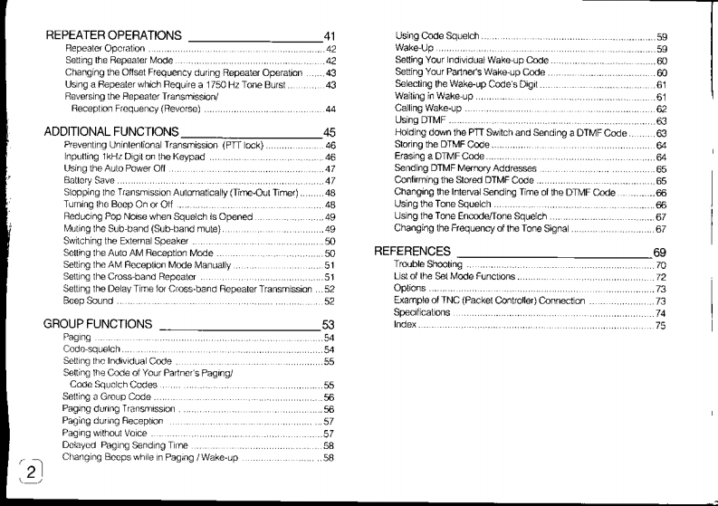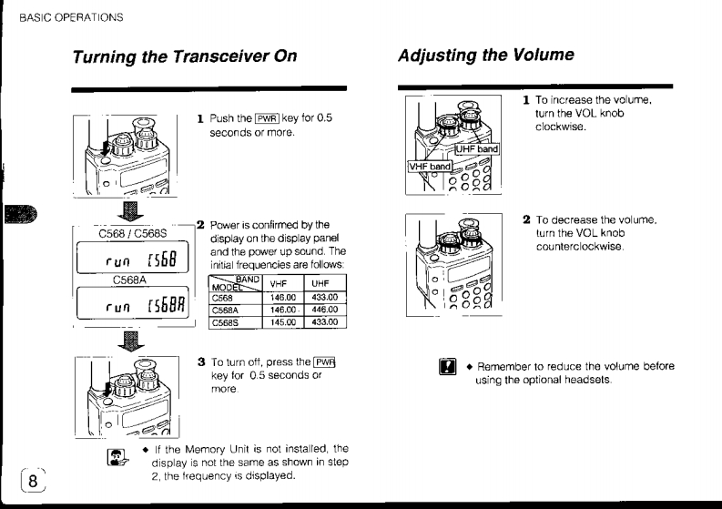 STANDARDTINBANDERC568/C568A/C568SINTRODUCTIONpage 3Twin band FM TransceiverBASIC OPERATIONSpage 7OWNER'S MANUALADVANCED OPERATIONS page 17Thank you for purchasing our Transceiver.MEMORY FUNCTIONSpage 25To use this Transceiver correctly,please read thismanual thoroughly before uses.SCANpage 31Keep this manual handy for reference.REPEATER OPERATIONS page 41ADDITIONAL FUNCTIONS page 45GROUP FUNCTIONSpage 53REFERENCEpage 69MARANTZ JAPAN,INC.