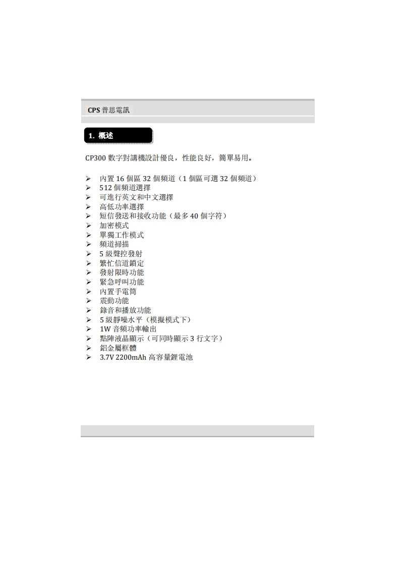 CP300用户使用说明书手册指南找手册网32天前发布关注私信0.84MB31页026CP300用户使用说明书手册指南此内容为付费资源,请付费后查看¥19¥21黄金会员免费钻石会员免费登录购买付费资源 第1页 / 共31页 第2页 / 共31页 第3页 / 共31页 第4页 / 共31页 第5页 / 共31页 第6页 / 共31页 第7页 / 共31页 第8页 / 共31页 第9页 / 共31页 第10页 / 共31页 试读已结束,还剩21页,您可下载完整版后进行离线阅读 THE END摩托罗拉 文本预览 CP300DMR Handheld TransceiverUser ManualD001品01P3 查看更多 收起部分 喜欢就支持一下吧收藏