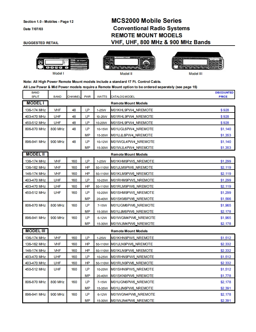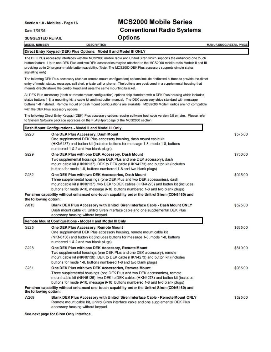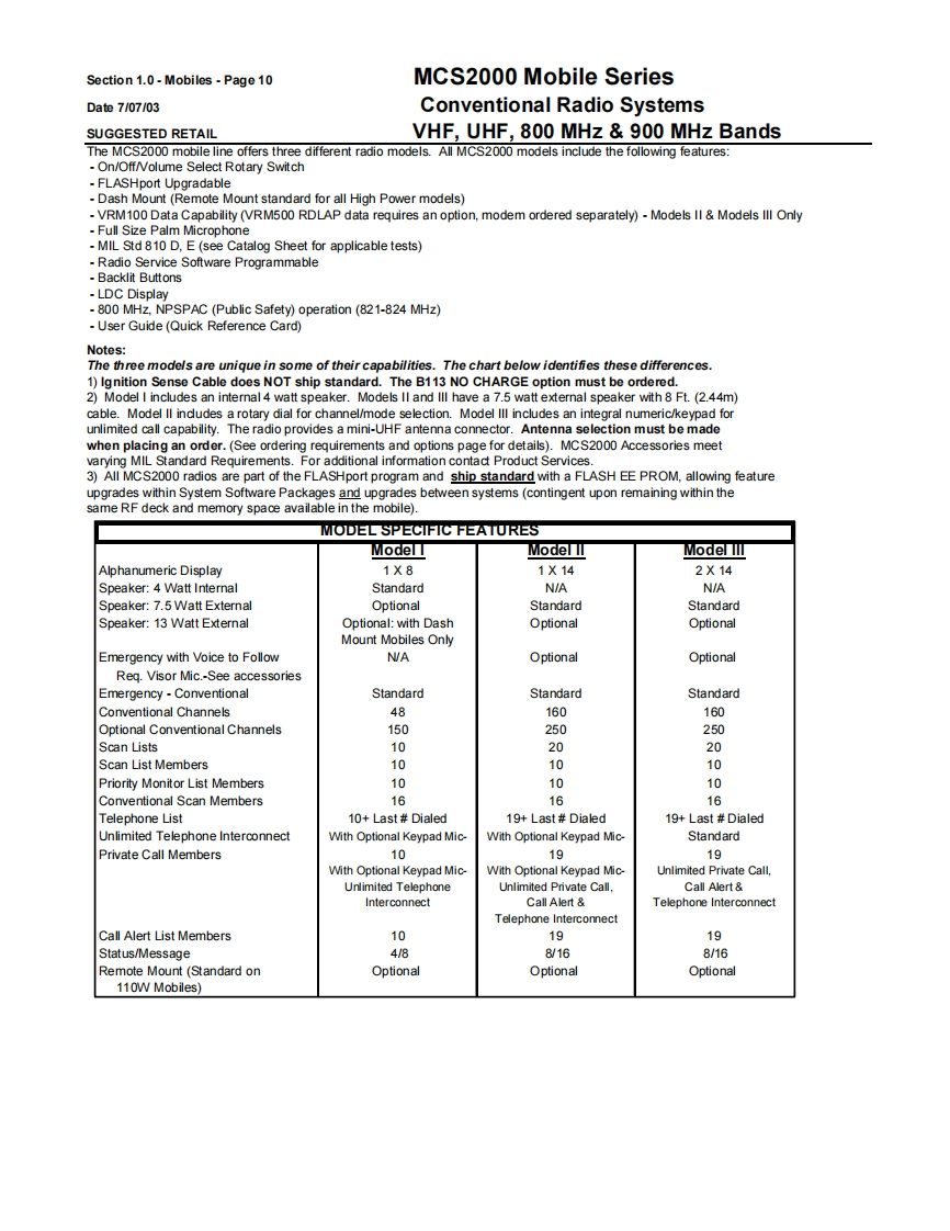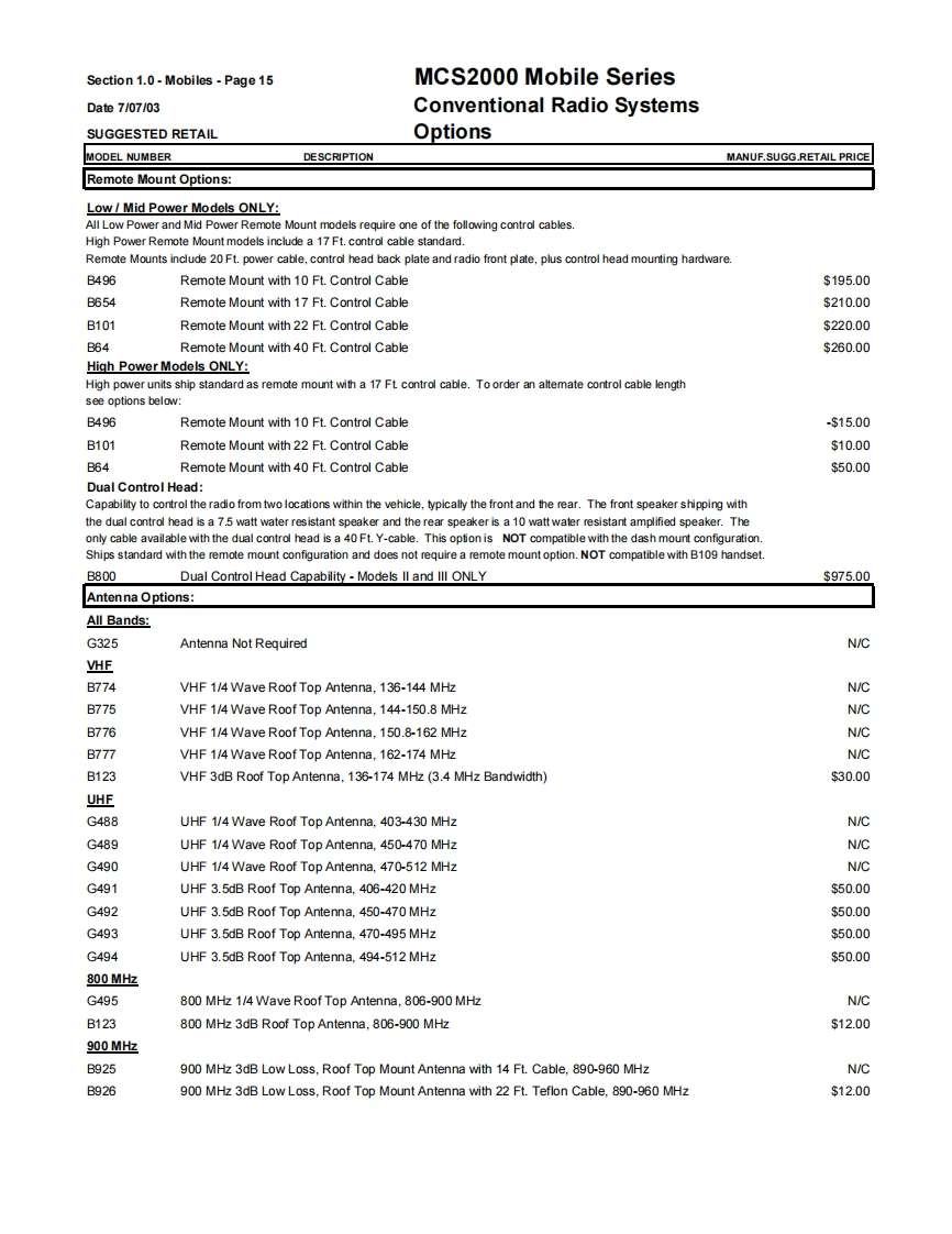 Section 1.0-Mobiles-Page9MCS2000 Mobile SeriesDate7/07/03Conventional Radio SystemsSUGGESTED RETAILVHF,UHF,800 MHz 900 MHz BandsGeneral Ordering InformationAll mobiles ship standard with speaker,microphone,negative ground power cable,mounting hardware and Quick Start User Guide.1)Order the MCS2000 mobile as a main line item.Dash or Remote Models available.See model pages.2)One antenna option MUST be ordered as a sub-item.(see option page)3)The MCS2000 Mobile Series radios are part of the FLASHport Program.This means that MCS2000 models can be loaded withdifferent software packages.Indicate the appropriate System Software Package (H35)as second sub-item.A System SoftwarePackage MUST be ordered for each radio unit ordered.4)Frequency and squelch information are not required.Orders will be accepted without this information.5)There are no restrictions as to the number of individual decode and encode PL and DPL codes that can be assigned in a radio.PL and DPL codes can be mixed on a mode.MCS2000 does not support unique PL's.6)System Enhanced Options can be loaded at the time of radio purchase or at a later date through the use of softwarefield upgrades (a FLASHport package,Smart RIB,RSS Terminal and RSS package are required for all software upgrades).The MCS2000 mobiles can be upgraded electronically in the field with new features in the current system or to newsystems operation(contingent upon utilizing the same RF deck and other hardware limitations)by ordering upgradekits from the MCS2000 FLASHport Aftermarket upgrade price page which appears later in this section.7)ANTENNAS:All mobiles MUST INCLUDE AN ANTENNA Option or a NO ANTENNA REQUIRED G325 option (ordering theB665 control station option the antenna or no antenna options must STILL be ordered).8)Order RSS programming software package ifrequired.(For programming of the radio in the field an IBM 486(or compatible)computer with 5.0 DOS or higher and 8MB RAM is highly recommended).9)Names and aliases must be programmed via Radio Service Software in the field.All Stat-Alert parameters must befield programmed.FCC INFORMATION FOR ALL MCS2000 MODELSPowerTransmitter TypeApplicableBandFrequencyOutputAcceptanceAuthorized EmissionParts of RulesVHF136-174MHz25WAZ492FT379116K0F3E,11K0F3E20K0F1E90Note:Frequencies 168.000 151.200 MHz does not meet Motprola's performance criteria are not valid programming frequenciesVHFR1136-162MHz110WAZ492FT378111K6F2D,16K0F3E,13K8F1D,20K0F1E,90R2146174MHz11KOF3EUHF403-450MHz25WAZ492FT481916K0F3E,11K0F3E20K0F1E90Note:The UHF Range 1 Low Power model is capable of being programmed via RSS from 403-470 MHz.Any UHF R1 Low Power radio programmed above 450 MHz will have a guaranteed power output of 20 watts.UHF450-512MHz20WAZ492FT482016K0F3E,11K0F3E20K0F1E90UHF450-512MHz40WAZ492FT482516K0F3E,11K0F3E20K0F1E20K0F1D.9011K0F1D,11K0F2D,16K0F2DNote:The UHF Range 2 40 watt modelis capable of meefing a 40 watt power output from 450-494 MHz.Any UHF Range 2 40 watt radios programmed above 4