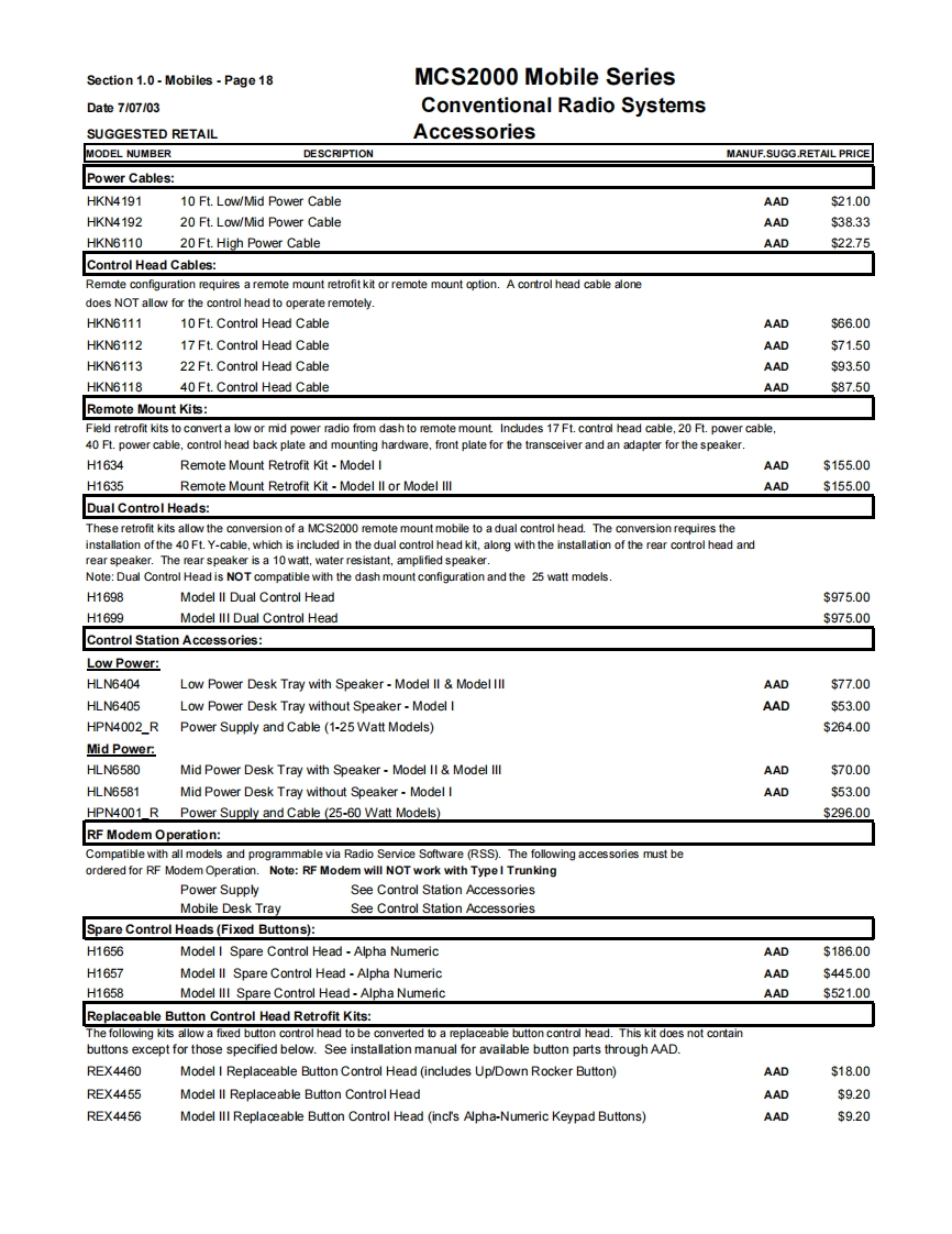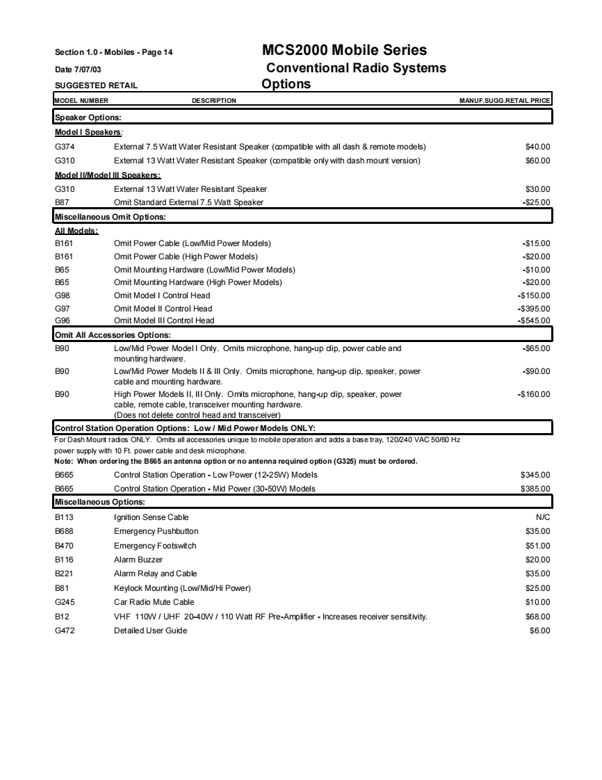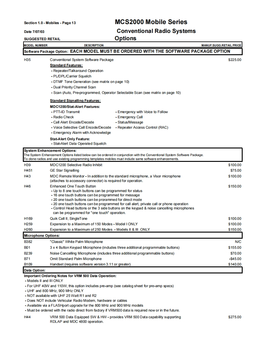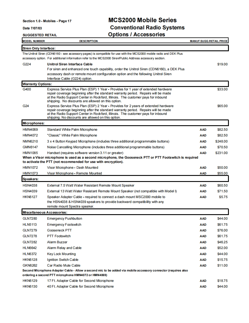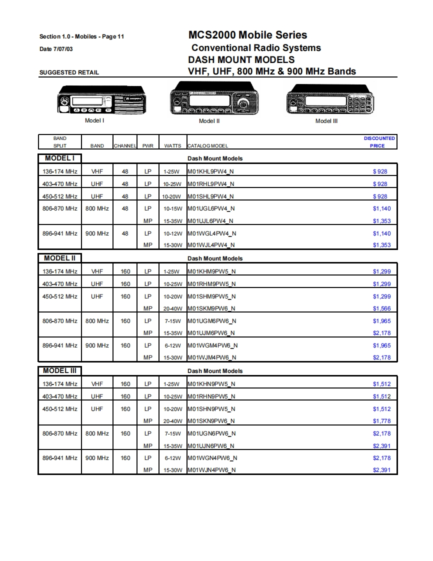 Section 1.0-Mobiles-Page9MCS2000 Mobile SeriesDate7/07/03Conventional Radio SystemsSUGGESTED RETAILVHF,UHF,800 MHz 900 MHz BandsGeneral Ordering InformationAll mobiles ship standard with speaker,microphone,negative ground power cable,mounting hardware and Quick Start User Guide.1)Order the MCS2000 mobile as a main line item.Dash or Remote Models available.See model pages.2)One antenna option MUST be ordered as a sub-item.(see option page)3)The MCS2000 Mobile Series radios are part of the FLASHport Program.This means that MCS2000 models can be loaded withdifferent software packages.Indicate the appropriate System Software Package (H35)as second sub-item.A System SoftwarePackage MUST be ordered for each radio unit ordered.4)Frequency and squelch information are not required.Orders will be accepted without this information.5)There are no restrictions as to the number of individual decode and encode PL and DPL codes that can be assigned in a radio.PL and DPL codes can be mixed on a mode.MCS2000 does not support unique PL's.6)System Enhanced Options can be loaded at the time of radio purchase or at a later date through the use of softwarefield upgrades (a FLASHport package,Smart RIB,RSS Terminal and RSS package are required for all software upgrades).The MCS2000 mobiles can be upgraded electronically in the field with new features in the current system or to newsystems operation(contingent upon utilizing the same RF deck and other hardware limitations)by ordering upgradekits from the MCS2000 FLASHport Aftermarket upgrade price page which appears later in this section.7)ANTENNAS:All mobiles MUST INCLUDE AN ANTENNA Option or a NO ANTENNA REQUIRED G325 option (ordering theB665 control station option the antenna or no antenna options must STILL be ordered).8)Order RSS programming software package ifrequired.(For programming of the radio in the field an IBM 486(or compatible)computer with 5.0 DOS or higher and 8MB RAM is highly recommended).9)Names and aliases must be programmed via Radio Service Software in the field.All Stat-Alert parameters must befield programmed.FCC INFORMATION FOR ALL MCS2000 MODELSPowerTransmitter TypeApplicableBandFrequencyOutputAcceptanceAuthorized EmissionParts of RulesVHF136-174MHz25WAZ492FT379116K0F3E,11K0F3E20K0F1E90Note:Frequencies 168.000 151.200 MHz does not meet Motprola's performance criteria are not valid programming frequenciesVHFR1136-162MHz110WAZ492FT378111K6F2D,16K0F3E,13K8F1D,20K0F1E,90R2146174MHz11KOF3EUHF403-450MHz25WAZ492FT481916K0F3E,11K0F3E20K0F1E90Note:The UHF Range 1 Low Power model is capable of being programmed via RSS from 403-470 MHz.Any UHF R1 Low Power radio programmed above 450 MHz will have a guaranteed power output of 20 watts.UHF450-512MHz20WAZ492FT482016K0F3E,11K0F3E20K0F1E90UHF450-512MHz40WAZ492FT482516K0F3E,11K0F3E20K0F1E20K0F1D.9011K0F1D,11K0F2D,16K0F2DNote:The UHF Range 2 40 watt modelis capable of meefing a 40 watt power output from 450-494 MHz.Any UHF Range 2 40 watt radios programmed above 4