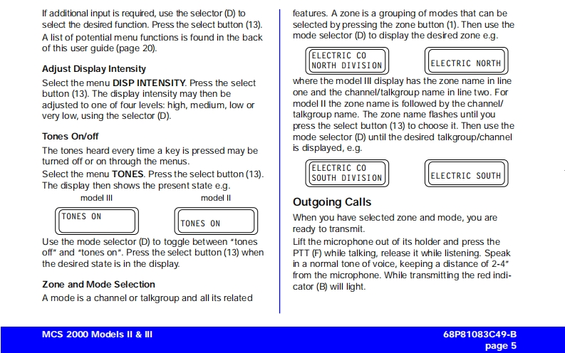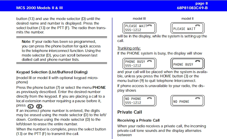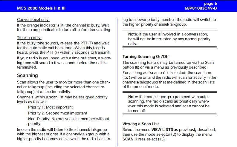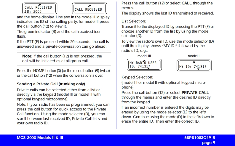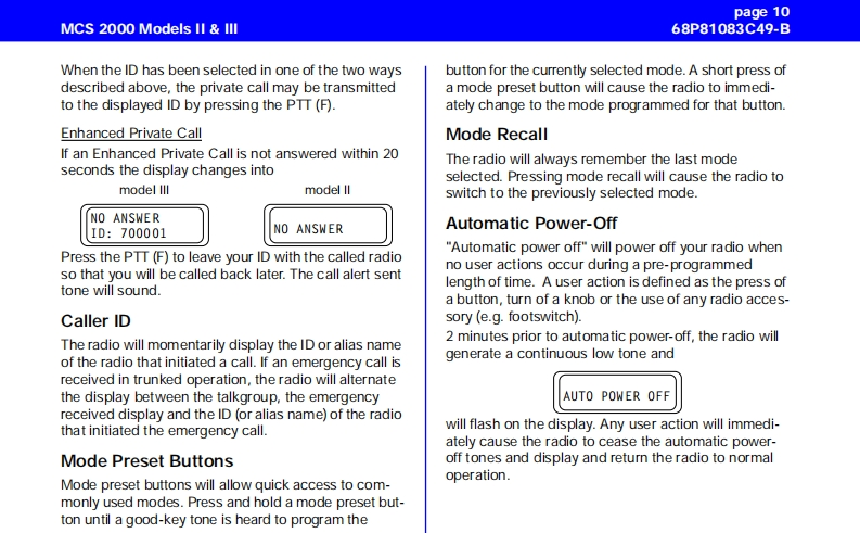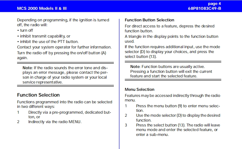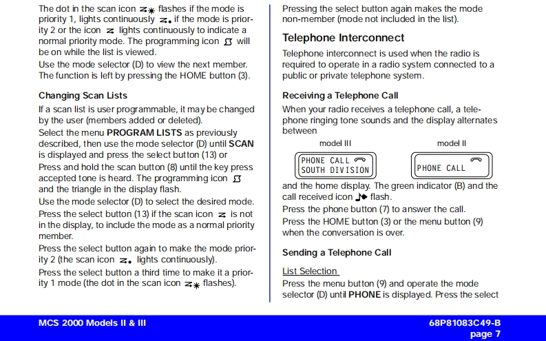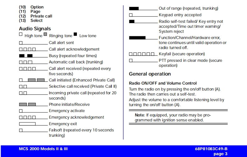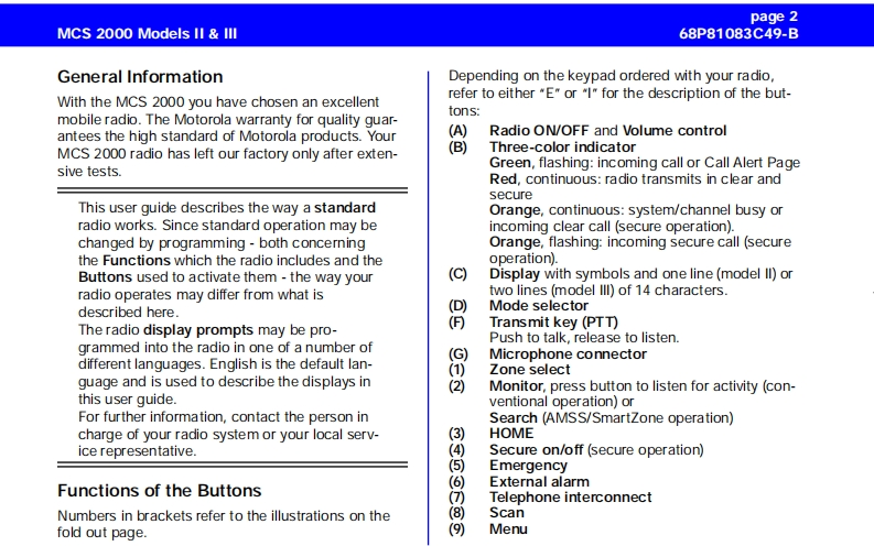 MCS 2000 Models Il IllCar Radio MuteUser GuideFailsoftpageConventional FunctionsGeneral Information2Repeater/Direct ....Functions of the Buttons .....Monitor23User-Selectable Private Line (PL)13Audio Signals............General operation ..Stat Alert (MDC-1200/Star Signalling)Features3Radio ON/OFF and Volume Control33PTT ID and EmergencySelective CallsFunction Selection413Function Button Selection4Group IDs and Wildcard EntryMenu SelectionT elephone Interconnect145Status/MessageAdjust Display IntensityTones On/offMDC Repeater Access(RAC)Zone and Mode SelectionTrunking FunctionsOutgoing Calls5Sending a Call Alert PageScanning6Receiving a Call Alert15lurning Scanning On/Off6Reprogram RequestOne Touch Button FunctionsViewing a Scan ListChanging Scan Lists7Out of RangeTelephone Interconnect7Secure OperationReceiving a Telephone Call7Secure Keyload and Erase17Data Operation1Sending a Telephone CallKeypad Selection (List/Buffered Dialing)Radio Care..8Private Call..178Safety Information .....Receiving a Private Call8Important Electromagnetic Emission Information 18Sending a Private Call(trunking only)Control Station Operation18Caller ID...10Caution:Vehicles'Equipped With Air Bags19Mode Preset Buttons10Accessories1920Mode Recall....10Menu Overview..20Automatic Power-Off10Computer Software CopyrightsSmartZone/AMSS Functions11Site Search Site Lock11Warning:When installing or removing theEmergency Operation .......11mobile radio from the vehicle,the radio must beExternal AlarmHandset Operationswitched off or damage to the radio may occur.MCS 2000 Models II III68P81083C49-Bpage 1