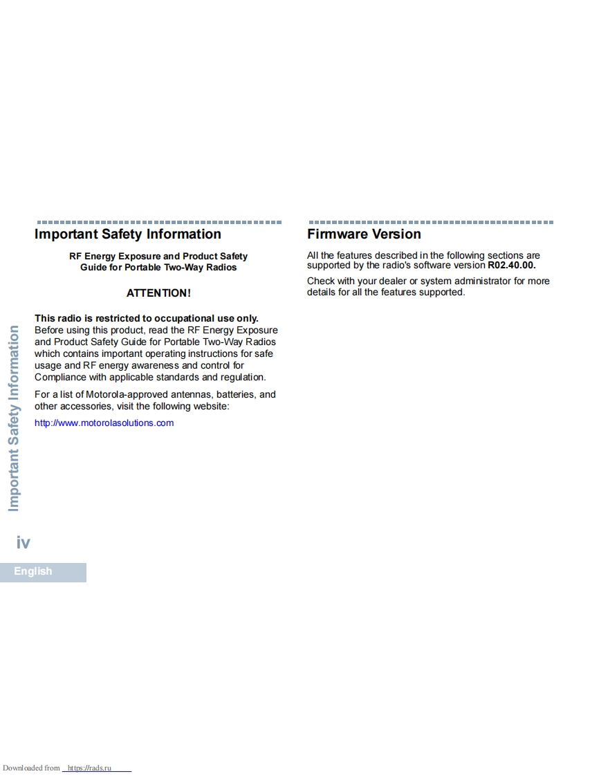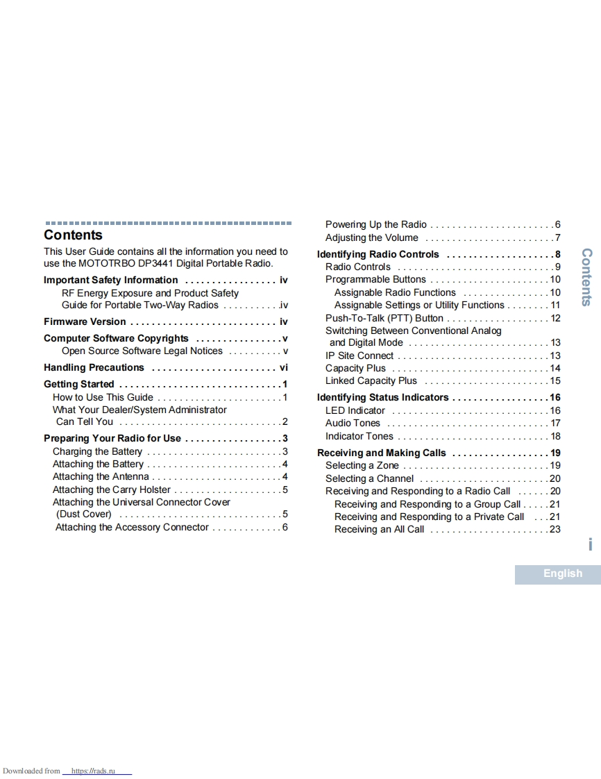 Motorola-DP3441操作说明书手册找手册网32天前发布关注私信1.94MB58页035Motorola-DP3441操作说明书手册此内容为付费资源,请付费后查看¥19¥21黄金会员免费钻石会员免费登录购买付费资源 第1页 / 共58页 第2页 / 共58页 第3页 / 共58页 第4页 / 共58页 第5页 / 共58页 第6页 / 共58页 第7页 / 共58页 第8页 / 共58页 第9页 / 共58页 第10页 / 共58页 试读已结束,还剩48页,您可下载完整版后进行离线阅读 THE END摩托罗拉 文本预览 source-EMEA.fm Page I Tuesday,September 2,2014 9:32 PMPROFESSIONAL DIGITAL TWO-WAY RADIOS从MOTOTRBOTMDP3441NON-DISPLAY PORTABLEUSER GUIDEMOTOROLAen de-DE fr-FR it-IT es-ES tr pl ru ar-EG 查看更多 收起部分 喜欢就支持一下吧收藏