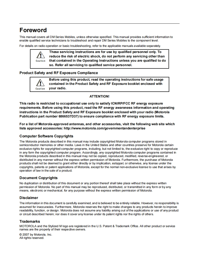 Motorola_DM-3400_DM-3401_DM-3600_DM-3601_维修维护电器原理图手册2找手册网31天前发布关注私信20.24MB327页032Motorola_DM-3400_DM-3401_DM-3600_DM-3601_维修维护电器原理图手册2此内容为付费资源,请付费后查看¥19¥21黄金会员免费钻石会员免费登录购买付费资源 第1页 / 共327页 第2页 / 共327页 第3页 / 共327页 第4页 / 共327页 第5页 / 共327页 第6页 / 共327页 第7页 / 共327页 第8页 / 共327页 第9页 / 共327页 第10页 / 共327页 试读已结束,还剩317页,您可下载完整版后进行离线阅读 THE END摩托罗拉 文本预览 Professional Digital Two-Way Radio SystemMOTOTRBOTM MobileDetailed Service ManualDM 3400 Numeric Display MobileDM 3401 Numeric Display Mobile (with GPS)DM 3600 Display MobileDM 3601 Display Mobile (with GPS)日bs日吕go品吕 查看更多 收起部分 喜欢就支持一下吧收藏