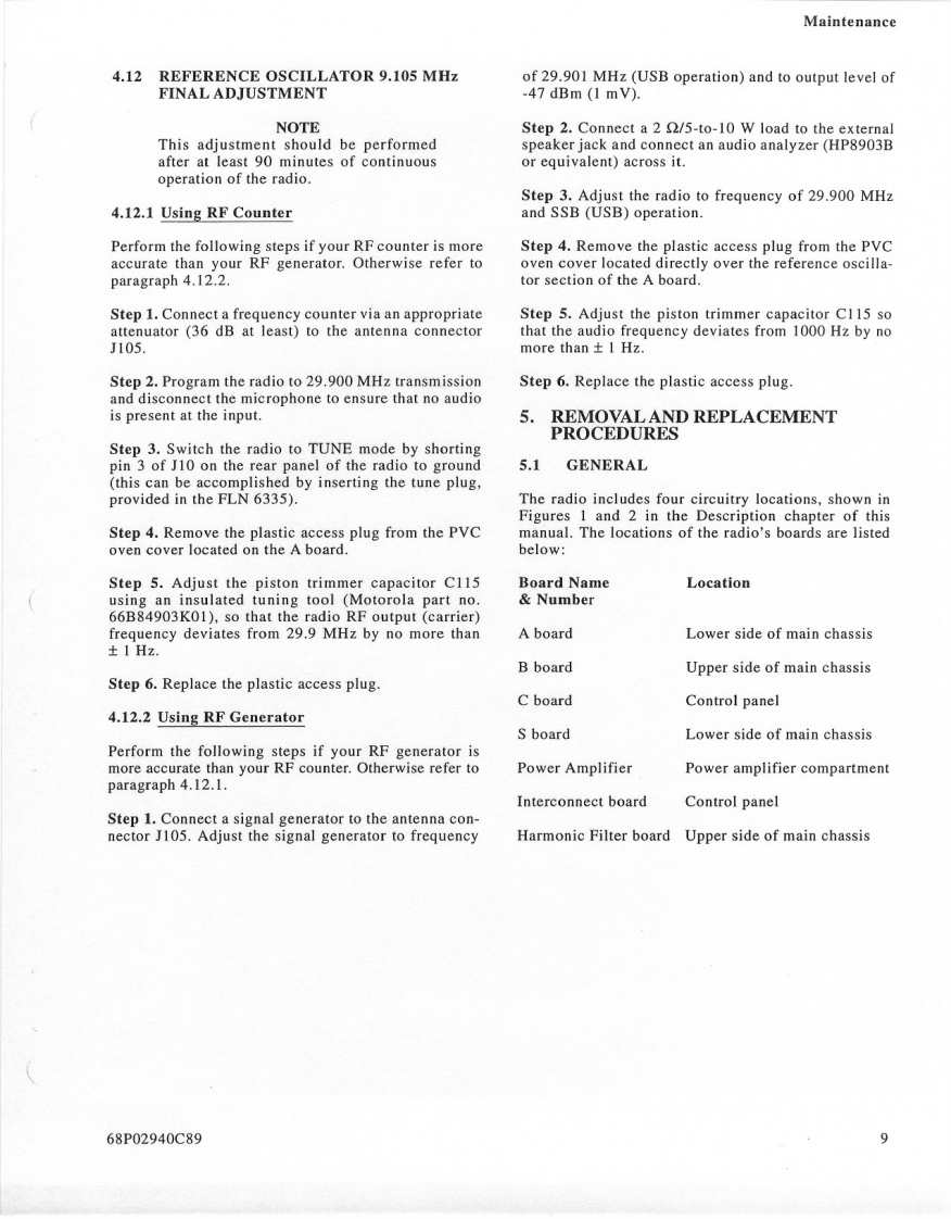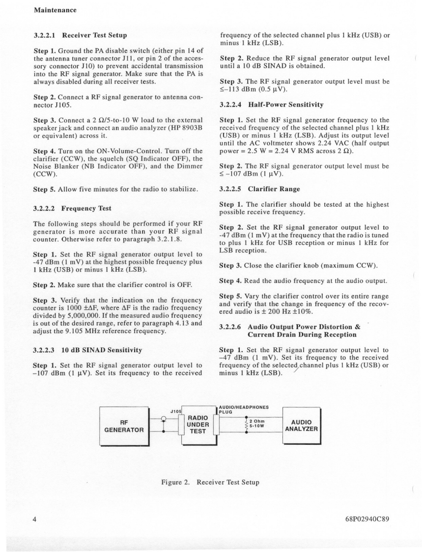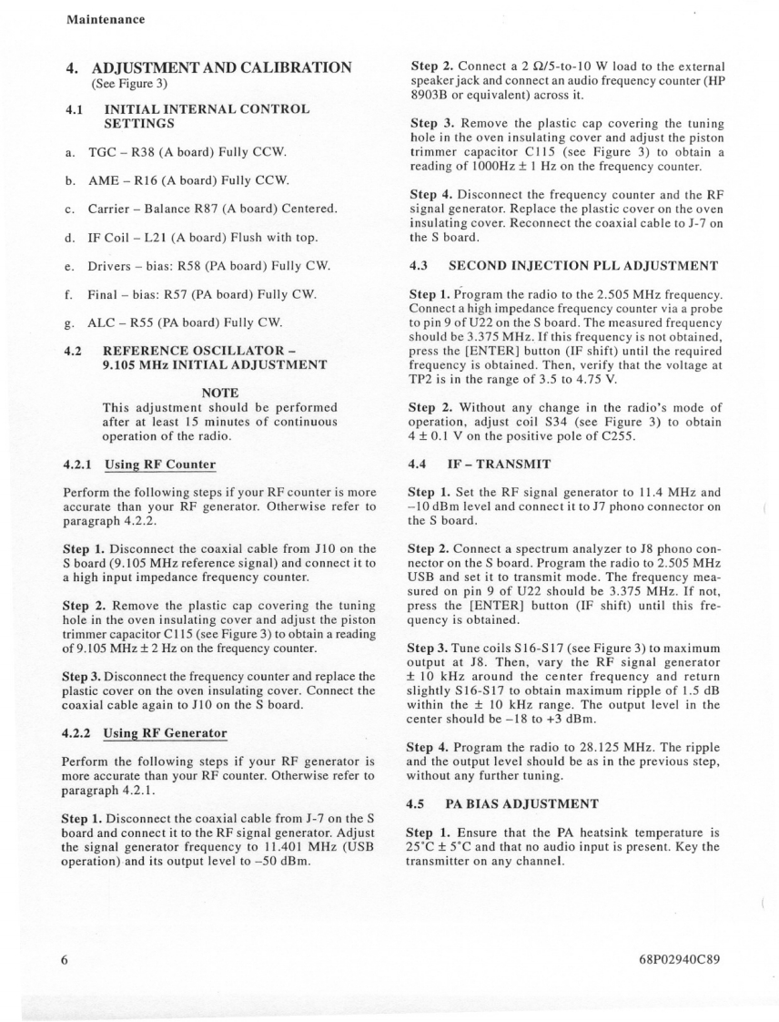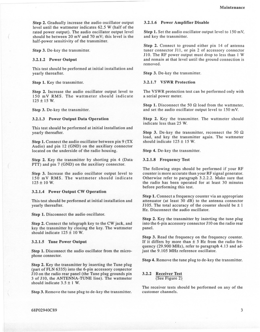 MOTOROLAMAINTENANCE1.INTRODUCTION3.When servicing a MICOM.XL radio,you must be equipped with the pro-This section provides maintenance,calibration,andgramming module FLN6304 (optiontroubleshooting instructions.S86),so as to be able to program theradio to all frequencies used in thetests.2.RECOMMENDED TEST EQUIPMENT3.PREVENTIVE MAINTENANCEItemModel3.1VISUAL INSPECTIONSpectrum AnalyzerHP 8568BCheck that all external surfaces of the equipment areSignal GeneratorHP 8657Afree of dirt.Inspect all connecting cables for damageor loose connections.Frequency CounterHP 5327CIf the equipment is dirty,wash the external surfacesMultimeterFLUKE 8000Awith mild soap and water using a clean cloth.Be care-ful!Never allow electronic components or connectorsAudio GeneratorHP 204Cto get wet.OscilloscopeTEKTRONIX 4653.2PERFORMANCE TESTSAudio AnalyzerHP 8903BAt initial installation and yearly thereafter,perform thepower output,half-power output,'tune'power outputPower MeterHP 438Atransmitter tests and the 10 dB SINAD and half-powersensitivity receiver tests.The tests should be performed30 dB/150 W CoaxialBird 8322on several channels covering the 1.6-30 MHz frequencyAttenuator*range unless otherwise specified.It is recommended tocheck at 1.6 MHz and at the end of each range of the10 dB/1 W AttenuatorBird8302-100harmonic filter(refer to paragraph 3.5 in the Theory ofOperation section of this manual).The readings of eachmay be used as Dummy Loadtest should be recorded and compared with previousreadings to detect any possible deterioration.NOTESThe radio's frequency should be checked and cali-1.It is possible to perform the adjust-brated after the first,third,sixth,and twelfth months,andments with the Motorola R2200 oryearly,thereafter.If the crystal is replaced,the aboveR2600HS communications systemschedule should be repeated for the first year.analyzer.For accurate frequency cal-ibration,a reference source of atThe frequency accuracy of the radio depends only onleast +0.05 PPM is recommended.the frequency accuracy of the 9.105 MHz referenceoscillator,located on the A board (see Figure 2 in the2.Equivalent test equipment may beDescription section of this manual).The oscillator hasused.a normal aging of maximum 1 PPM/year.It is thereforeLand Mobile Products Sector68P02940C99-01301 E.Algonquin Road,Schaumburg.IL 60196©Motorola Inc.,1991April,1994